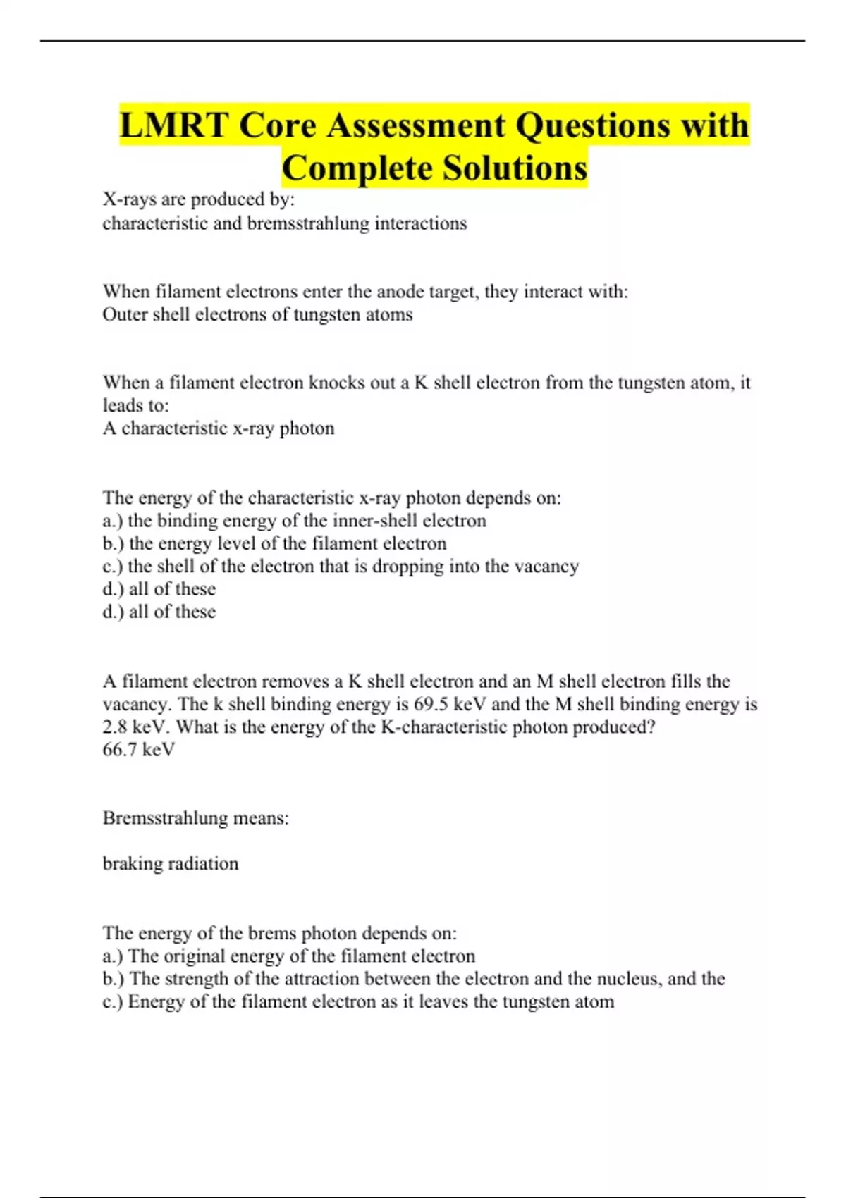 X-rays are produced by: characteristic and bremsstrahlung interactions When filament electrons enter the anode target, they interact with: Outer shell electrons of tungsten atoms When a filament electron knocks out a K shell electron from the tungsten atom, it leads to: A characteristic x-ray photon The energy of the characteristic x-ray photon depends on: a.) the binding energy of the inner-shell electron b.) the energy level of the filament electron c.) the shell of the electron that is dropping into the vacancy d.) all of these d.) all of these A filament electron removes a K shell electron and an M shell electron fills the vacancy. The k shell binding energy is 69.5 keV and the M shell binding energy is 2.8 keV. What is the energy of the K-characteristic photon produced? 66.7 keV Bremsstrahlung means: braking radiation