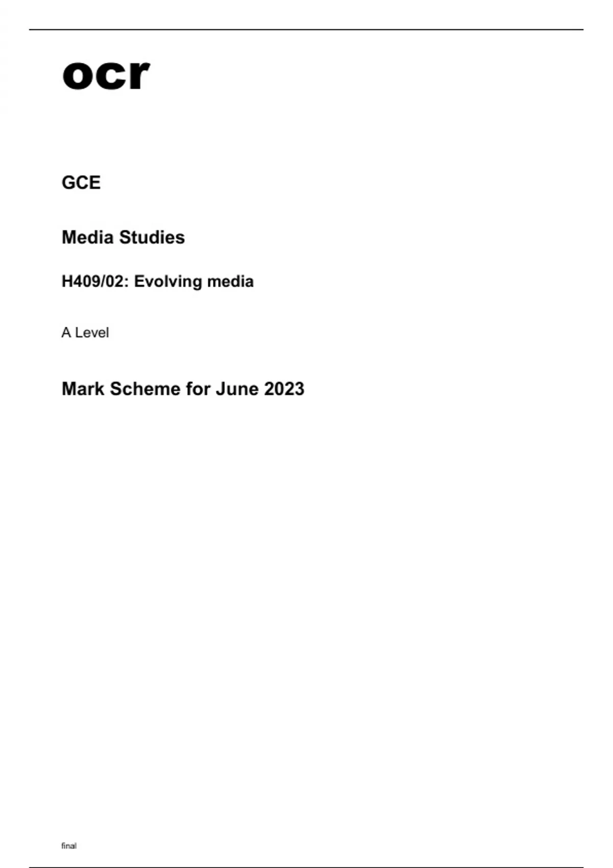 ocr A Level Media Studies H409/02 June2023 Question Paper and Mark Scheme.