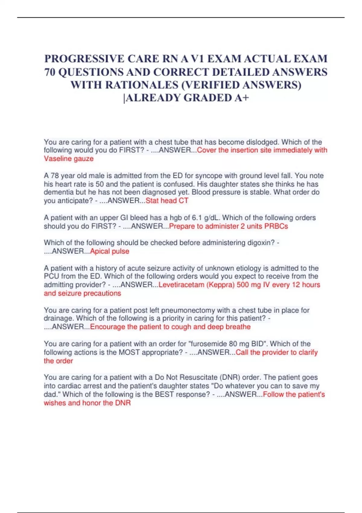 PROGRESSIVE CARE RN A V1 EXAM ACTUAL EXAM 70 QUESTIONS AND CORRECT DETAILED ANSWERS WITH RATIONALES (VERIFIED ANSWERS) |ALREADY GRADED A+