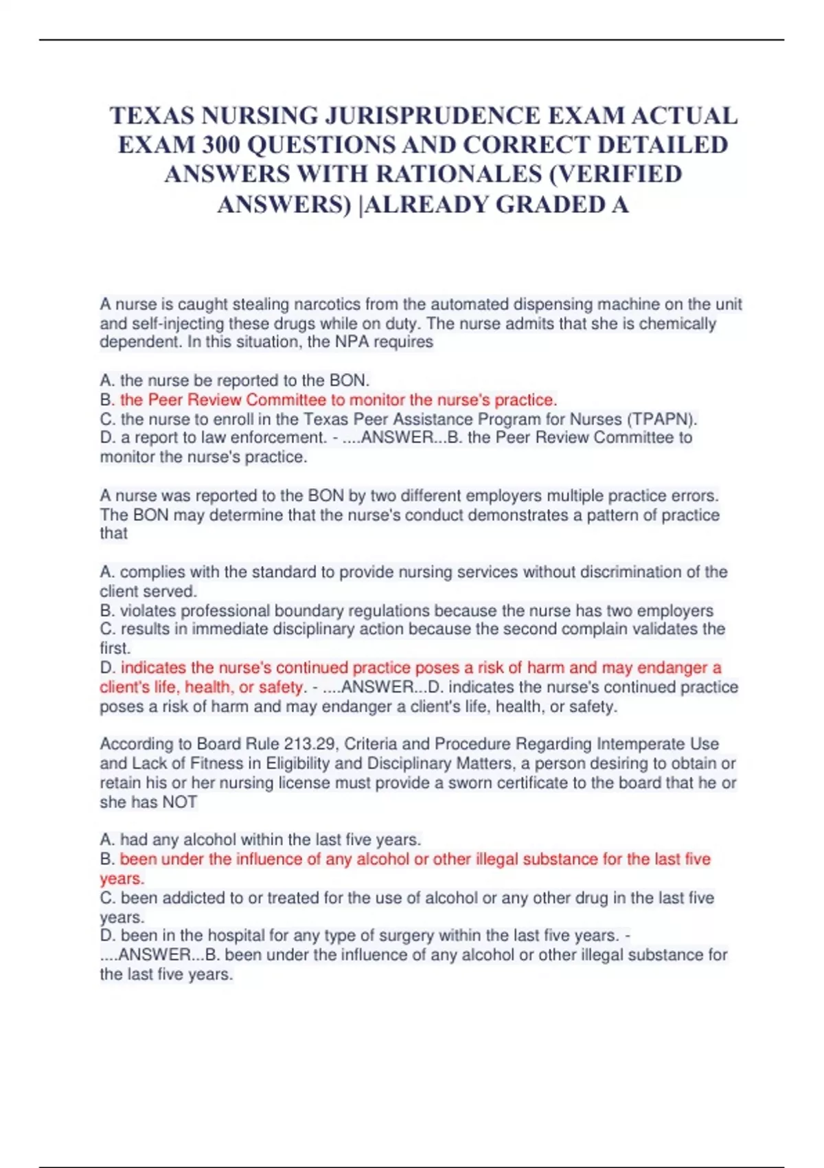 TEXAS NURSING JURISPRUDENCE EXAM ACTUAL EXAM 300 QUESTIONS AND CORRECT DETAILED ANSWERS WITH RATIONALES (VERIFIED ANSWERS) |ALREADY GRADED A