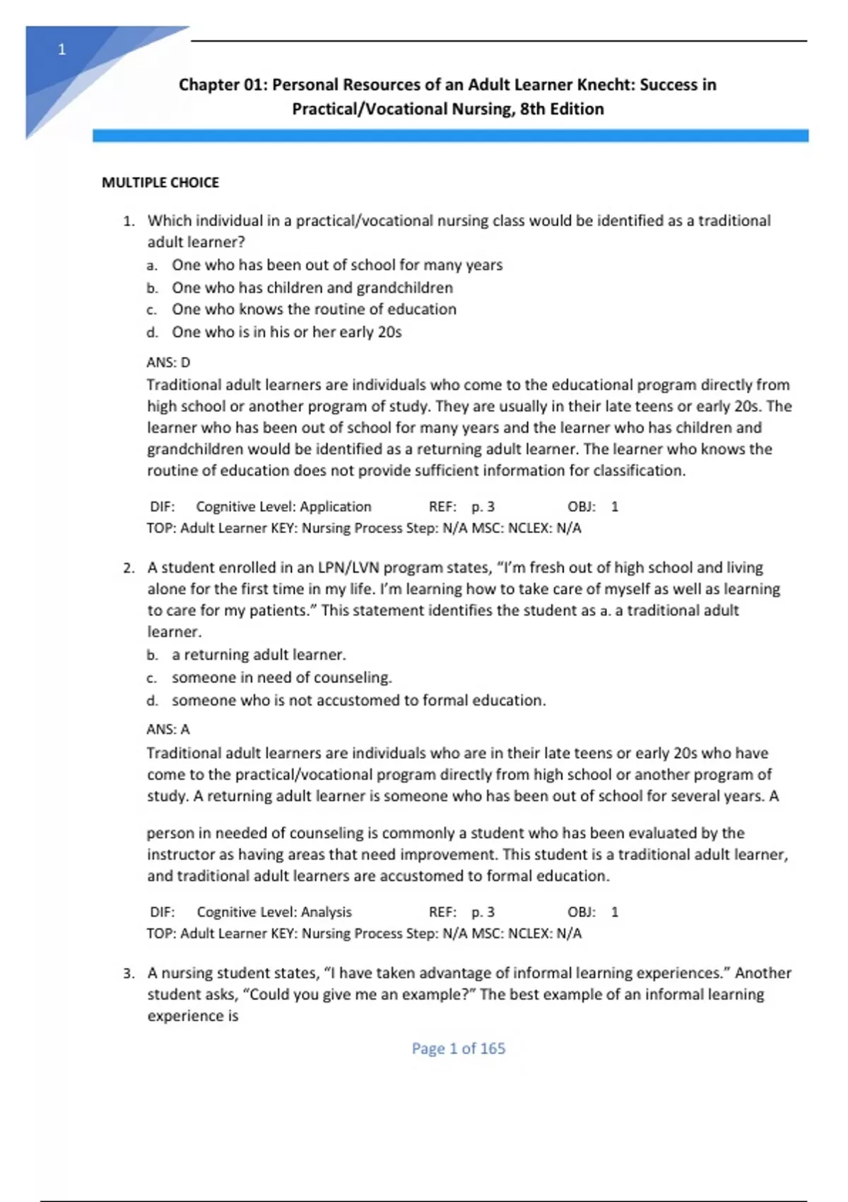 1. Which individual in a practical/vocational nursing class would be identified as a traditional adult learner? a. One who has been out of school for many years b. One who has children and grandchildren c. One who knows the routine of education d. One who is in his or her early 20s ANS: D Traditional adult learners are individuals who come to the educational program directly from high school or another program of study. They are usually in their late teens or early 20s. The learner who has been out of school for many years and the learner who has children and grandchildren would be identified as a returning adult learner. The learner who knows the routine of education does not provide sufficient information for classification. DIF: Cognitive Level: Application REF: p. 3 OBJ: 1 TOP: Adult Learner KEY: Nursing Process Step: N/A MSC: NCLEX: N/A 2. A student enrolled in an LPN/LVN program states, “I’m fresh out of high school and living alone for the first time in my life. I’m learning how to take care of myself as well as learning to care for my patients.” This statement identifies the student as a. a traditional adult learner. b. a returning adult learner. c. someone in need of counseling. d. someone who is not accustomed to formal education. ANS: A Traditional adult learners are individuals who are in their late teens or early 20s who have come to the practical/vocational program directly from high school or another program of study. A returning adult learner is someone who has been out of school for several years. A person in needed of counseling is commonly a student who has been evaluated by the instructor as having areas that need improvement. This student is a traditional adult learner, and traditional adult learners are accustomed to formal education. DIF: Cognitive Level: Analysis REF: p. 3 OBJ: 1 TOP: Adult Learner KEY: Nursing Process Step: N/A MSC: NCLEX: N/A 3. A nursing student states, “I have taken advantage of informal learning experiences.” Another student asks, “Could you give me an example?” The best example of an informal learning experience is