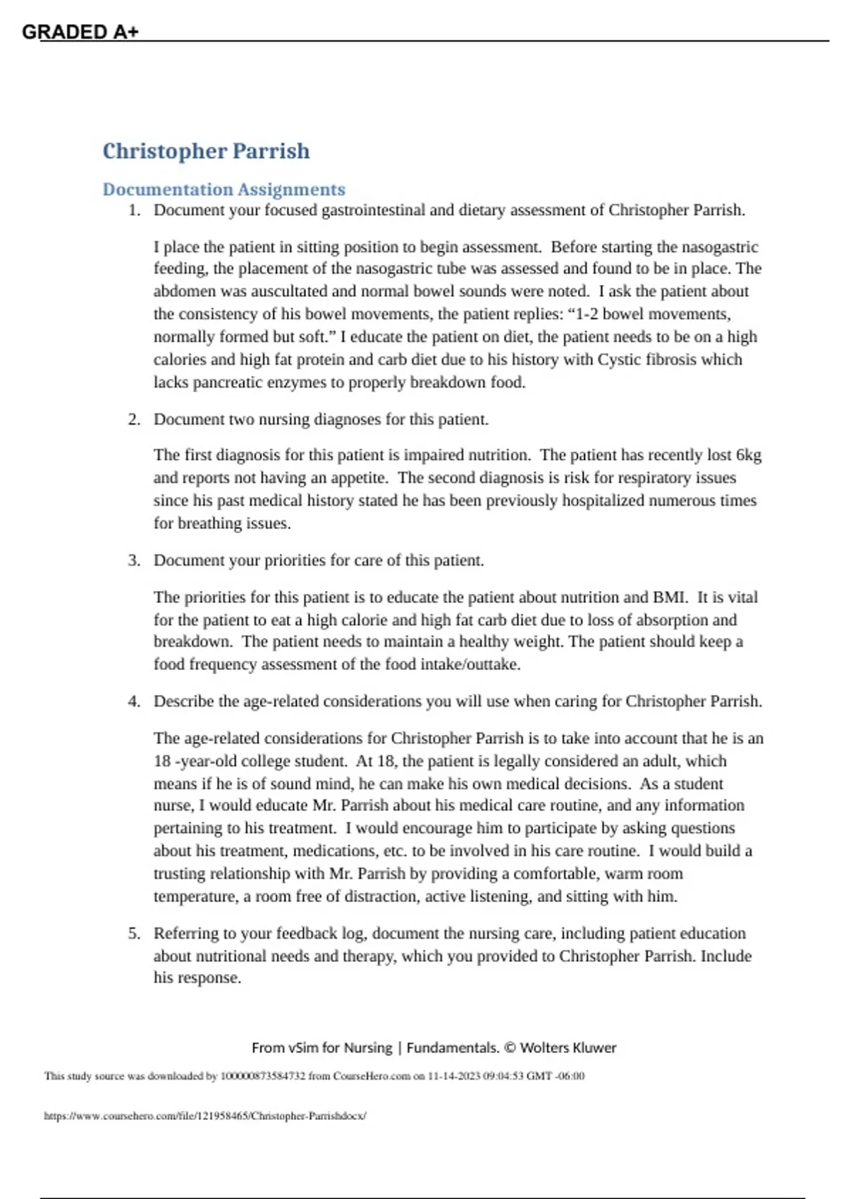 Christopher Parrish Documentation Assignments 1. Document your focused gastrointestinal and dietary assessment of Christopher Parrish. I place the patient in sitting position to begin assessment. Before starting the nasogastric feeding, the placement of the nasogastric tube was assessed and found to be in place. The abdomen was auscultated and normal bowel sounds were noted. I ask the patient about the consistency of his bowel movements, the patient replies: “1-2 bowel movements, normally formed but soft.” I educate the patient on diet, the patient needs to be on a high calories and high fat protein and carb diet due to his history with Cystic fibrosis which lacks pancreatic enzymes to properly breakdown food. 2. Document two nursing diagnoses for this patient. The first diagnosis for this patient is impaired nutrition. The patient has recently lost 6kg and reports not having an appetite. The second diagnosis is risk for respiratory issues since his past medical history stated he has been previously hospitalized numerous times for breathing issues. 3. Document your priorities for care of this patient. The priorities for this patient is to educate the patient about nutrition and BMI. It is vital for the patient to eat a high calorie and high fat carb diet due to loss of absorption and breakdown. The patient needs to maintain a healthy weight. The patient should keep a food frequency assessment of the food intake/outtake. 4. Describe the age-related considerations you will use when caring for Christopher Parrish. The age-related considerations for Christopher Parrish is to take into account that he is an 18 -year-old college student. At 18, the patient is legally considered an adult, which means if he is of sound mind, he can make his own medical decisions. As a student nurse, I would educate Mr. Parrish about his medical care routine, and any information pertaining to his treatment. I would encourage him to participate by asking questions about his treatment, medications, etc. to be involved in his care routine. I would build a trusting relationship with Mr. Parrish by providing a comfortable, warm room temperature, a room free of distraction, active listening, and sitting with him. 5. Referring to your feedback log, document the nursing care, including patient education about nutritional needs and therapy, which you provided to Christopher Parrish. Include his response. From vSim for Nursing | Fundamentals. © Wolters Kluwer This study source was downloaded by from CourseH on :04:53 GMT -06:00 GRADED A+ I enter the room and immediately perform hand hygiene. I introduce myself and identify the patient. I ask the patient if he has any allergies and he stats, “No, I am not allergic to anything.” I then ask the patient is he was experiencing any pain today. He replies, “No, I don’t have any pain.” I assist the patient into fowler’s position and assess the vital signs including blood pressure (118/70 mmHg) with the appropriate size fitting cuff, respiration (12 breaths per minute), temperature (99 degrees F), pulse (85/min), pulse oximeter on the finger to measure saturation, SPO2 (96%) skin integrity. I auscultate the abdominal region and listen to normal bowel sounds. I perform hand hygiene, don gloves, and assess the placement of the nasogastric tube. After confirming the placement of the NG tube, I educate the patient on tube feeding, risk for aspiration, diagnosis, and intake/outtake. After education, I aspire on the NG tube and then flushed the tube with normal saline solution. I doff the gloves and perform hand hygiene. I don new gloves for the next procedure. Next, I educate the patient on body mass index and diet. I explained to the patient, your weight and BMI can affect general health. I advise Mr. Parrish to continue a high-calorie diet to gain weight. I checked the patient’s record and MAR compared to the medication label. Then I administered orally, 5 tablets of pancrelipase indicated in the order. After, I check the medical record and medication label to administer the feeding, 480 mL of fluid nutrition at 1.5k/cal at 60mL/hr. The feeding was administered and the patient was handed-off