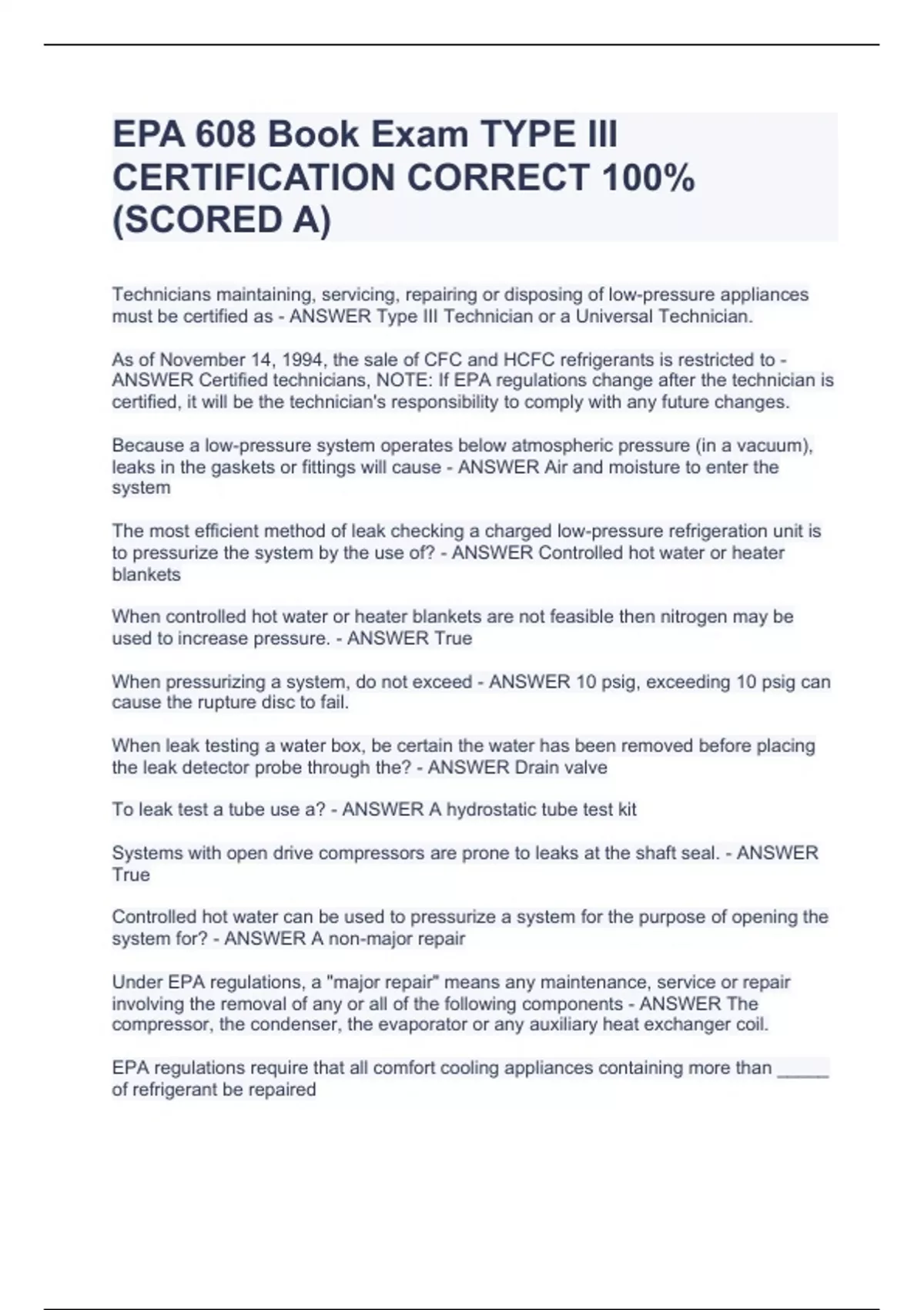 Technicians maintaining, servicing, repairing or disposing of low-pressure appliances must be certified as - ANSWER Type III Technician or a Universal Technician. As of November 14, 1994, the sale of CFC and HCFC refrigerants is restricted to - ANSWER Certified technicians, NOTE: If EPA regulations change after the technician is certified, it will be the technician's responsibility to comply with any future changes. Because a low-pressure system operates below atmospheric pressure (in a vacuum), leaks in the gaskets or fittings will cause - ANSWER Air and moisture to enter the system The most efficient method of leak checking a charged low-pressure refrigeration unit is to pressurize the system by the use of? - ANSWER Controlled hot water or heater blankets When controlled hot water or heater blankets are not feasible then nitrogen may be used to increase pressure. - ANSWER True When pressurizing a system, do not exceed - ANSWER 10 psig, exceeding 10 psig can cause the rupture disc to fail. When leak testing a water box, be certain the water has been removed before placing the leak detector probe through the? - ANSWER Drain valve To leak test a tube use a? - ANSWER A hydrostatic tube test kit Systems with open drive compressors are prone to leaks at the shaft seal. - ANSWER True Controlled hot water can be used to pressurize a system for the purpose of opening the system for? - ANSWER A non-major repair