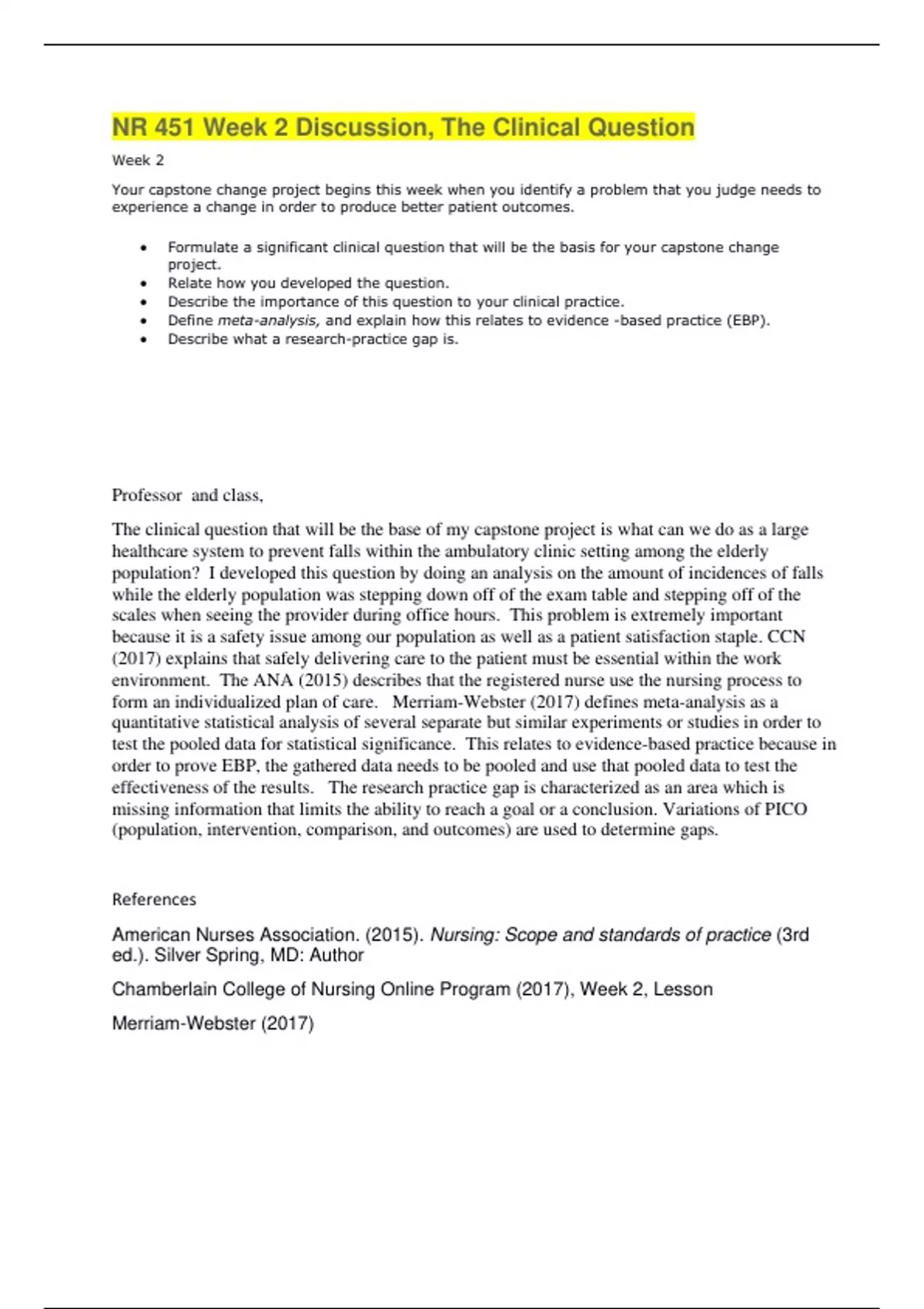 nr 451 week 2 discussion the clinical question