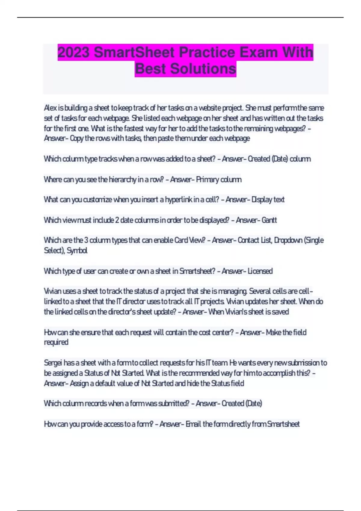2023 Smart Sheet Practice Exam With Best Solutions Alex is building a sheet to keep track of her tasks on a website project. She must perform the same set of tasks for each webpage. She listed each webpage on her sheet and has written out the tasks for the first one. What is the fastest way for her to add the tasks to the remaining webpages? - Answer- Copy the rows with tasks, then paste them under each webpage Which column type tracks when a row was added to a sheet? - Answer- Created (Date) column Where can you see the hierarchy in a row? - Answer- Primary column What can you customize when you insert a hyperlink in a cell? - Answer- Display text Which view must include 2 date columns in order to be displayed? - Answer- Gantt Which are the 3 column types that can enable Card View? - Answer- Contact List, Dropdown (Single Select), Symbol Which type of user can create or own a sheet in Smartsheet? - Answer- Licensed Vivian uses a sheet to track the status of a project that she is managing. Several cells are celllinked to a sheet that the IT director uses to track all IT projects. Vivian updates her sheet. When do the linked cells on the director's sheet update? - Answer- When Vivian's sheet is saved How can she ensure that each request will contain the cost center? - Answer- Make the field required Sergei has a sheet with a form to collect requests for his IT team. He wants every new submission to be assigned a Status of Not Started. What is the recommended way for him to accomplish this? - Answer- Assign a default value of Not Started and hide the Status field Which column records when a form was submitted? - Answer- Created (Date) How can you provide access to a form? - Answer- Email the form directly from Smartsheet What is the lowest permission you need to create a form? - Answer- Admin Which takes priority when a sheet has 2 conditional formatting rules? - Answer- The rule on the top Which program files can you import into Smartsheet to create a new sheet? - Answer- Excel What permission is required to hide and unhide columns? - Answer- Admin You are building a sheet to keep track of opportunities for your sales team. You want a column to show which of the 4 regions each opportunity is assigned to. Which column type would be best? - Answer- Dropdown (Single Select) Which file type can you insert in a cell? - Answer- .gif Which formatting option is possible? - Answer- Change the background color of a row Tyrone created a project plan sheet and is adding tasks. He added the first task, then moved to the next row to add his second task. What will automatically be copied down to the new row? - AnswerFormatting Which can you customize with a color of your choice? - Answer- Background Which column type can be displayed on a form as radio buttons? - Answer- Dropdown (Single Select) Which setting must you enable to automatically track who makes form submissions? - AnswerRequire people to log in to Smartsheet What is the most efficient way to change the order that fields are displayed on a form? - AnswerDrag-and-drop the fields on the form builder Olga added a field called "Budget Total" in their sheet summary. What is the syntax to reference the "Budget Total" field in a formula? - Answer- [Budget Total]# What symbols must you use when referencing another sheet? - Answer- { } Braces
