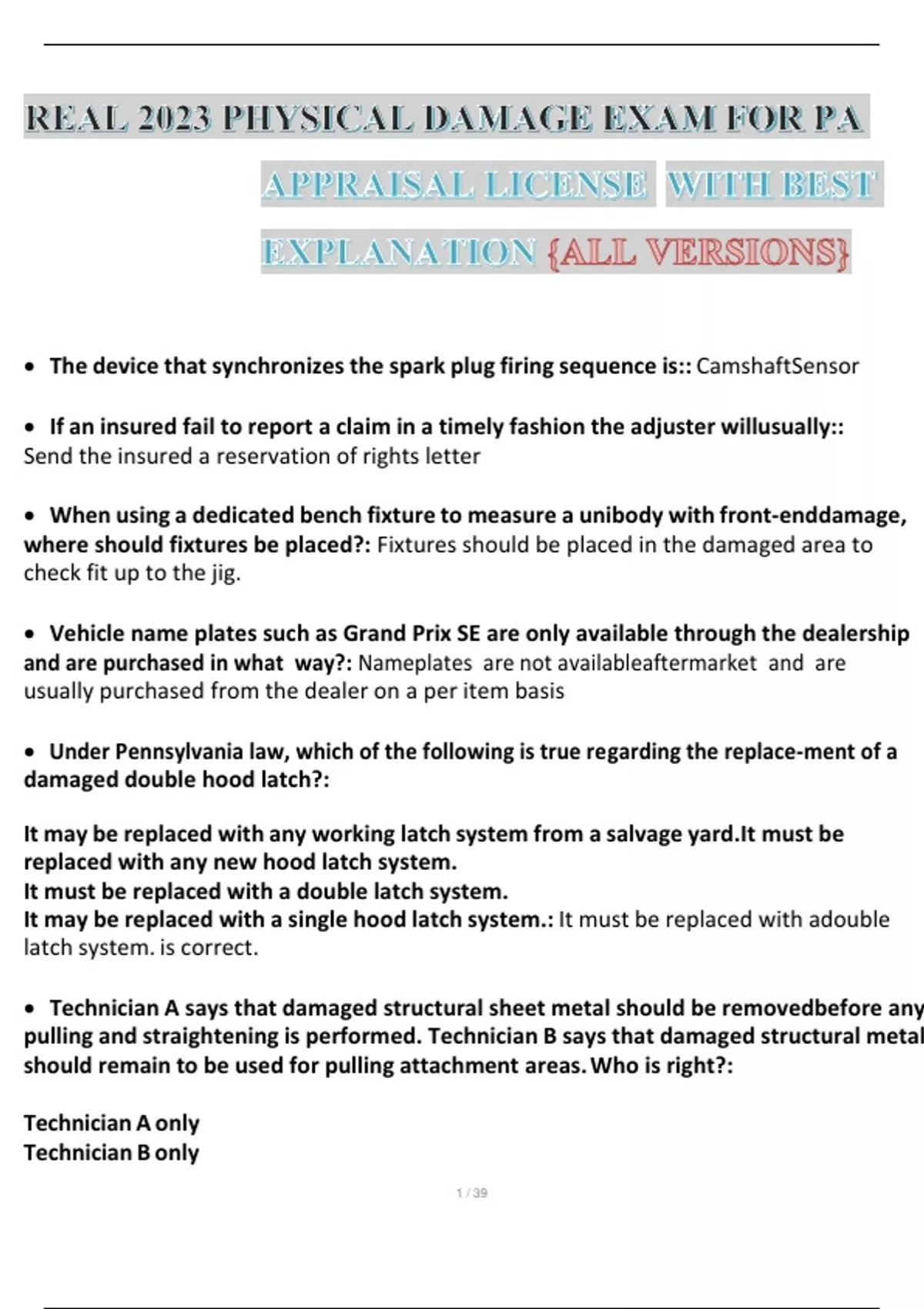 REAL 2023 PHYSICAL DAMAGE EXAM FOR PA APPRAISAL LICENSE WITH BEST EXPLANATION {ALL VERSIONS} • The device that synchronizes the spark plug firing sequence is:: CamshaftSensor • If an insured fail to report a claim in a timely fashion the adjuster willusually:: Send the insured a reservation of rights letter • When using a dedicated bench fixture to measure a unibody with front-enddamage, where should fixtures be placed?: Fixtures should be placed in the damaged area to check fit up to the jig. • Vehicle name plates such as Grand Prix SE are only available through the dealership and are purchased in what way?: Nameplates are not availableaftermarket and are usually purchased from the dealer on a per item basis • Under Pennsylvania law, which of the following is true regarding the replace-ment of a damaged double hood latch?: It may be replaced with any working latch system from a salvage yard.It must be replaced with any new hood latch system. It must be replaced with a double latch system. It may be replaced with a single hood latch system.: It must be replaced with adouble latch system. is correct. • Technician A says that damaged structural sheet metal should be removedbefore any pulling and straightening is performed. Technician B says that damaged structural metal should remain to be used for pulling attachment areas. Who is right?: Technician A only Technician B only Both technicians are correct Neither technician is correct: Technician B only • Which of the following is the computer in the vehicle? Controller Pump Speed Sensors Valves: Controller • If an insured fails to report a claim in a timely fashion, the adjuster will immediately: Deny the claim. Send the insured a reservation of rights letter.Cease the claims investigation. Seek the advice of the company's attorney: Send the insured a reservation ofrights letter.. • If an auto appraiser uses the actual cost method to determine a vehicle'svalue, which of the following is not a factor?: The location of the vehicle of like kind and qualityThe salvage value of the damaged vehicle The actual cost of an available vehicle in similar condition to or better thanthe motor vehicle being appraised The vehicle being appraised is similar to the damaged vehicle in its pre-dam-aged condition: The salvage value of the damaged vehicle • A structural rail is being cut for sectioning. Technician A says to use a cutting torch to make the final cut line.Technician B says to use a cut-off wheelor saw to make the final cut. Who is right? Technician A only Technician B only Both technicians are correct Neither technician is correct: Technician B only • Which of the following coverages is included as "no-fault" coverage on the standardized Personal Auto policy?: Uninsured Motorists coverage. Medical Payments and Physical Damage. A state-mandated "no-fault" coverage plan. Liability coverage.: Medical Payments and Physical Damage