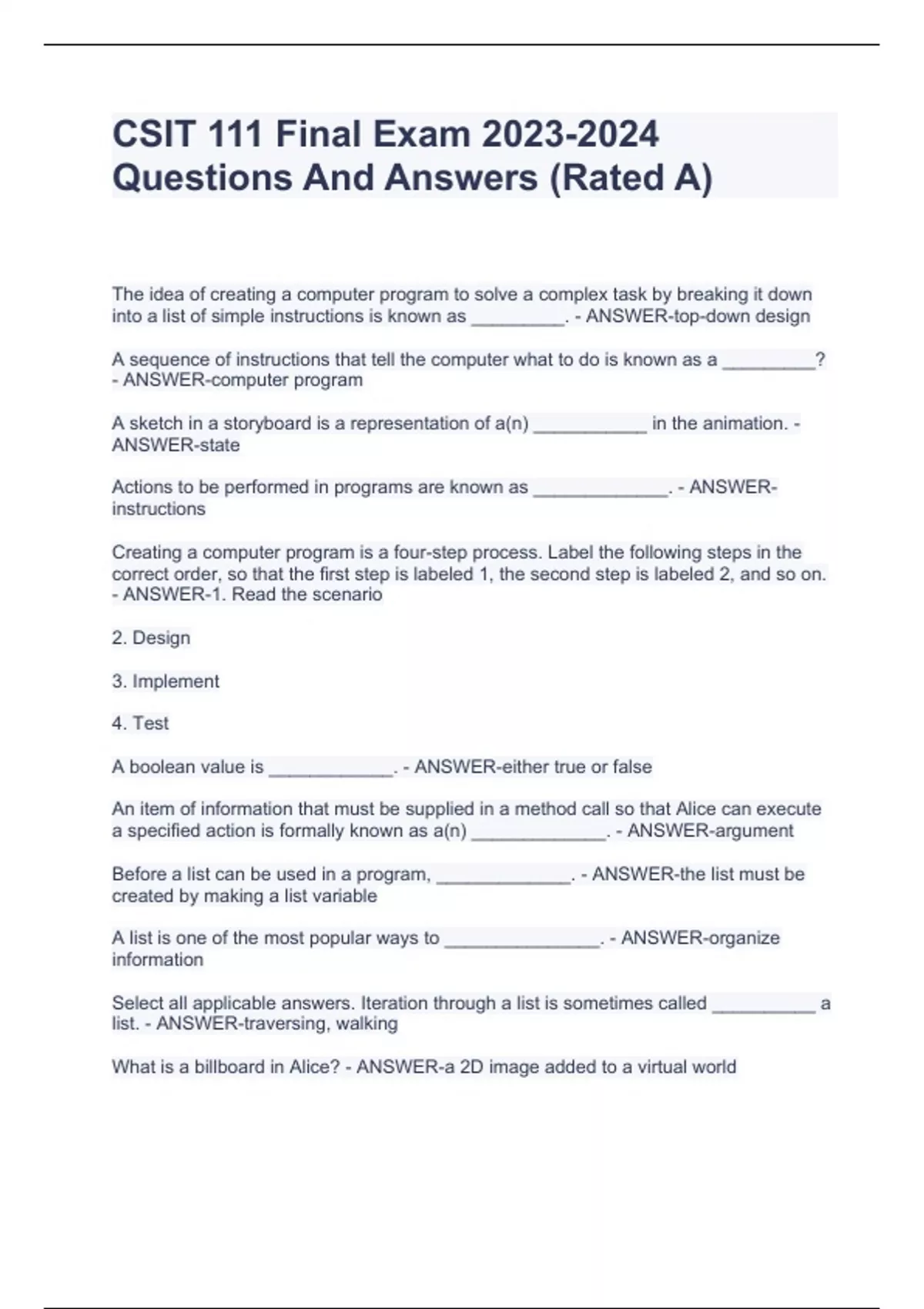 CSIT 111 Final Exam Questions And Answers (Rated A) The idea of creating a computer program to solve a complex task by breaking it down into a list of simple instructions is known as _________. - ANSWER-top-down design A sequence of instructions that tell the computer what to do is known as a _________? - ANSWER-computer program A sketch in a storyboard is a representation of a(n) ___________ in the animation. - ANSWER-state Actions to be performed in programs are known as _____________. - ANSWER-instructions Creating a computer program is a four-step process. Label the following steps in the correct order, so that the first step is labeled 1, the second step is labeled 2, and so on. - ANSWER-1. Read the scenario 2. Design 3. Implement 4. Test A boolean value is ____________. - ANSWER-either true or false An item of information that must be supplied in a method call so that Alice can execute a specified action is formally known as a(n) _____________. - ANSWER-argument Before a list can be used in a program, _____________. - ANSWER-the list must be created by making a list variable