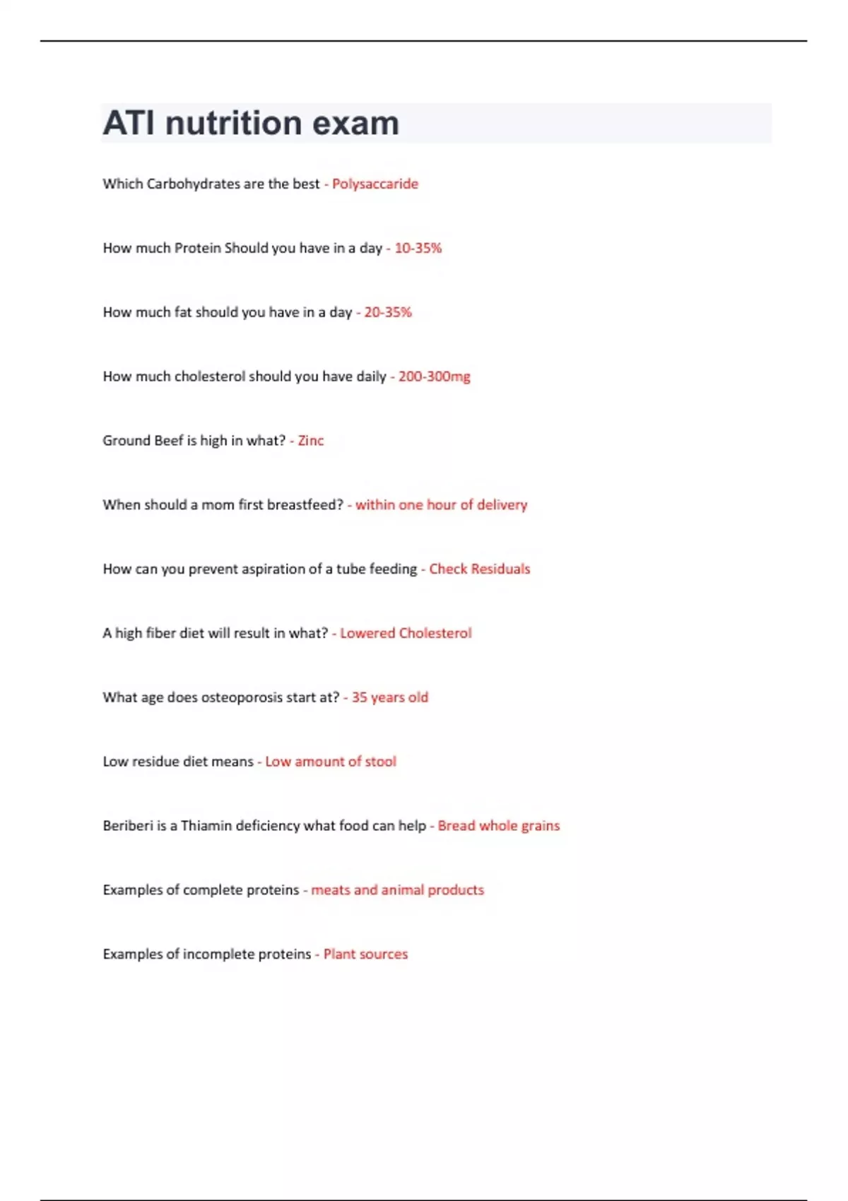 Which Carbohydrates are the best - Polysaccaride How much Protein Should you have in a day - 10-35% How much fat should you have in a day - 20-35% How much cholesterol should you have daily - 200-300mg Ground Beef is high in what? - Zinc When should a mom first breastfeed? - within one hour of delivery How can you prevent aspiration of a tube feeding - Check Residuals A high fiber diet will result in what? - Lowered Cholesterol What age does osteoporosis start at? - 35 years old Low residue diet means - Low amount of stool Beriberi is a Thiamin deficiency what food can help - Bread whole grains Examples of complete proteins - meats and animal products Examples of incomplete proteins - Plant sources