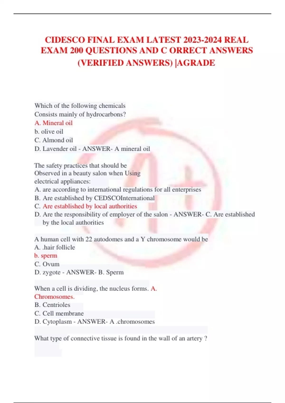 CIDESCO LATEST FINAL EXAM REAL EXAM 200+ QUESTIONS AND C ORRECT ANSWERS (100% VERIFIED ANSWERS) |AGRADE