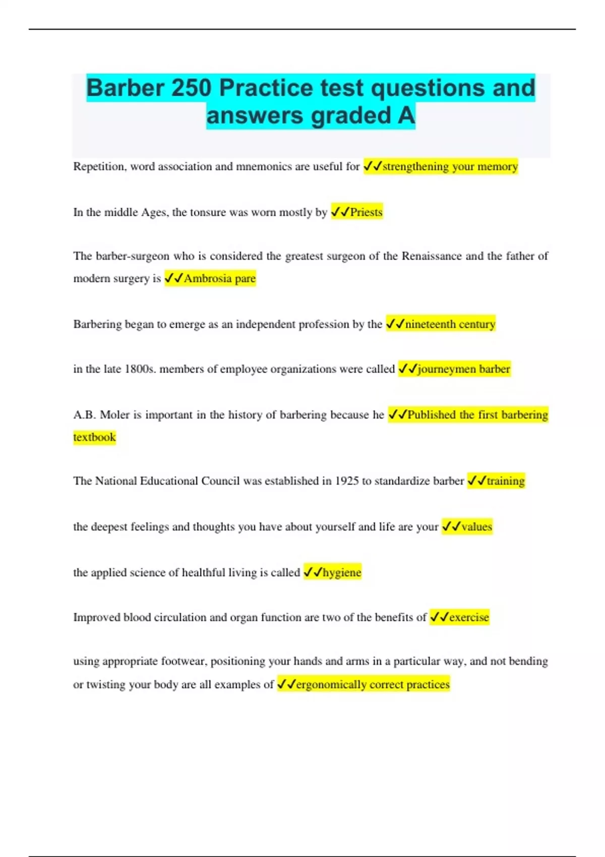 Repetition, word association and mnemonics are useful for strengthening your memory In the middle Ages, the tonsure was worn mostly by Priests The barber-surgeon who is considered the greatest surgeon of the Renaissance and the father of modern surgery is Ambrosia pare Barbering began to emerge as an independent profession by the nineteenth century in the late 1800s. members of employee organizations were called journeymen barber A.B. Moler is important in the history of barbering because he Published the first barbering textbook The National Educational Council was established in 1925 to standardize barber training the deepest feelings and thoughts you have about yourself and life are your values the applied science of healthful living is called hygiene Improved blood circulation and organ function are two of the benefits of exercise using appropriate footwear, positioning your hands and arms in a particular way, and not bending or twisting your body are all examples of ergonomically correct practices