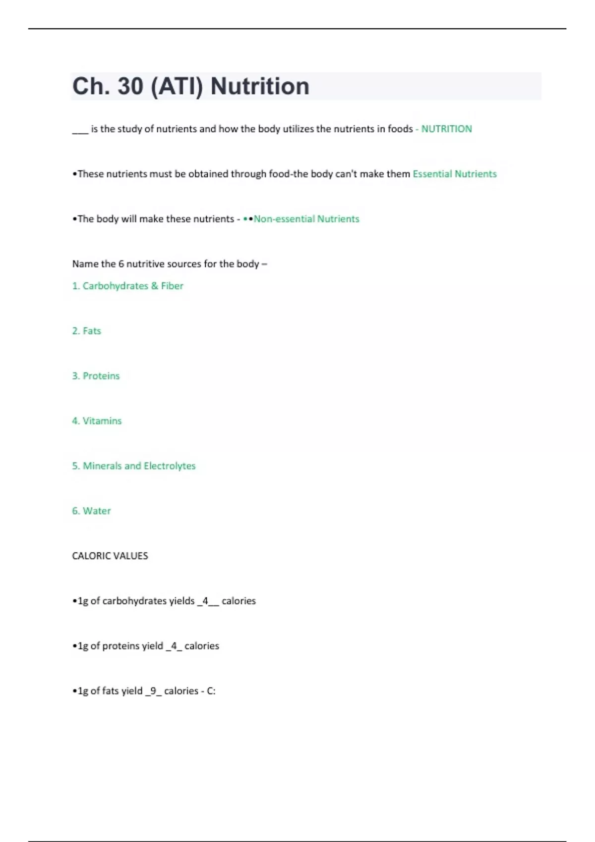 ___ is the study of nutrients and how the body utilizes the nutrients in foods - NUTRITION •These nutrients must be obtained through food-the body can't make them Essential Nutrients •The body will make these nutrients - ••Non-essential Nutrients Name the 6 nutritive sources for the body – 1. Carbohydrates & Fiber 2. Fats 3. Proteins 4. Vitamins 5. Minerals and Electrolytes 6. Water CALORIC VALUES •1g of carbohydrates yields _4__ calories •1g of proteins yield _4_ calories •1g of fats yield _9_ calories - C: