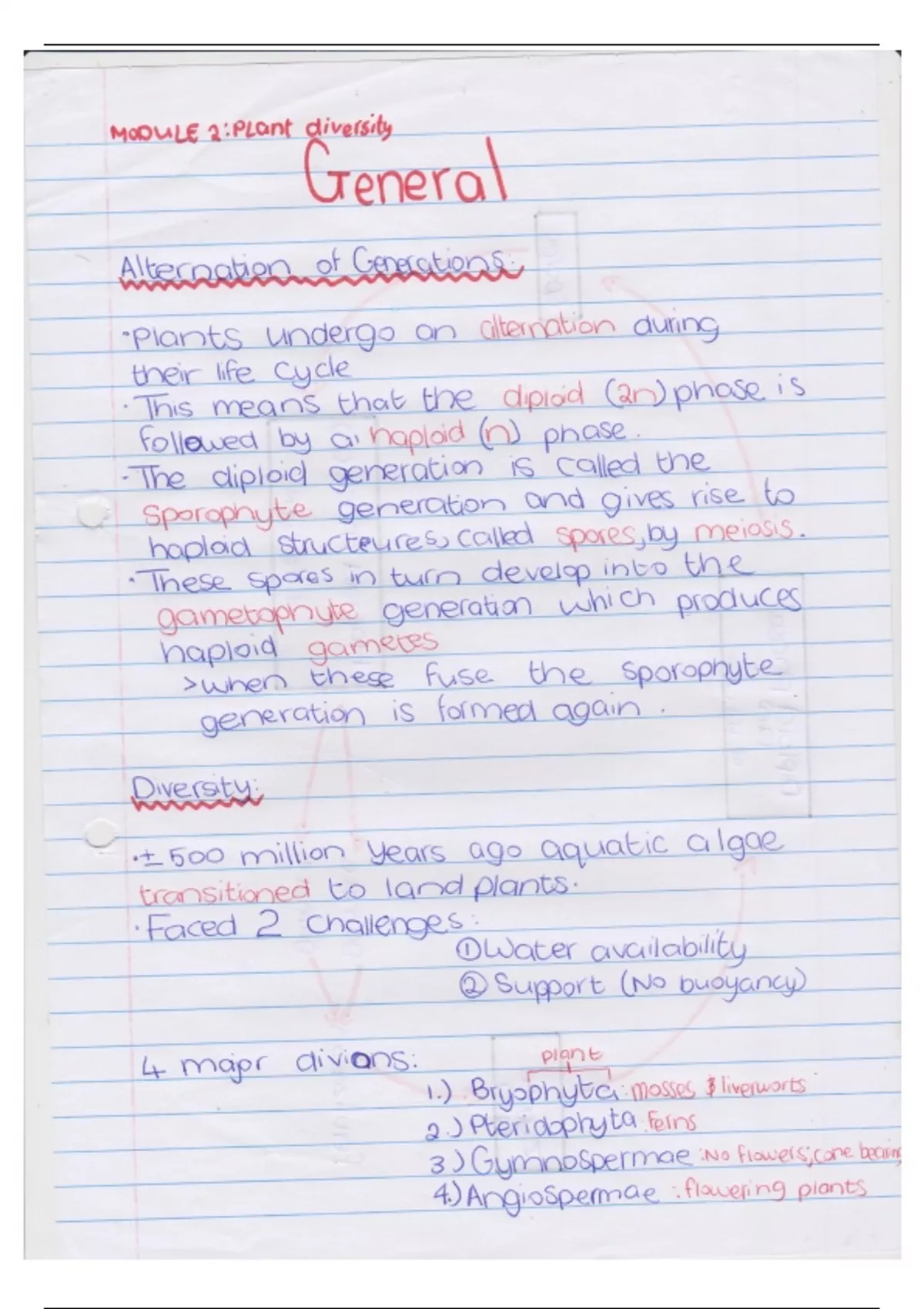 Summary and Lecture Notes for Plant Diversity Includes (but is not limited to): Bryophyta (moss and liverworts), Pteridophyte (ferns), Gymnospermae (no flower), Angiospermae (flower)