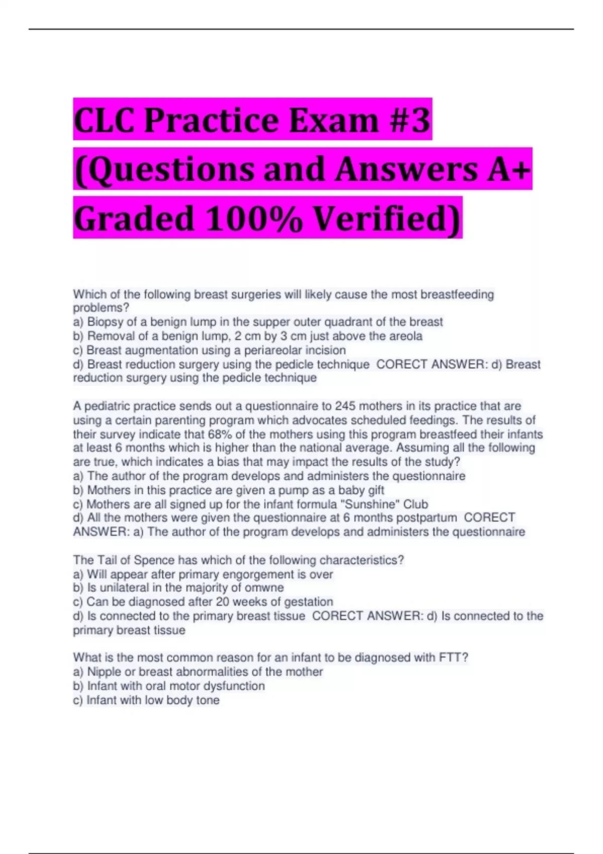 CLC Practice Exam #3 (Questions and Answers A+ Graded 100% Verified) Which of the following breast surgeries will likely cause the most breastfeeding problems? a) Biopsy of a benign lump in the supper outer quadrant of the breast b) Removal of a benign lump, 2 cm by 3 cm just above the areola c) Breast augmentation using a periareolar incision d) Breast reduction surgery using the pedicle technique CORECT ANSWER: d) Breast reduction surgery using the pedicle technique A pediatric practice sends out a questionnaire to 245 mothers in its practice that are using a certain parenting program which advocates scheduled feedings. The results of their survey indicate that 68% of the mothers using this program breastfeed their infants at least 6 months which is higher than the national average. Assuming all the following are true, which indicates a bias that may impact the results of the study? a) The author of the program develops and administers the questionnaire b) Mothers in this practice are given a pump as a baby gift c) Mothers are all signed up for the infant formula "Sunshine" Club d) All the mothers were given the questionnaire at 6 months postpartum CORECT ANSWER: a) The author of the program develops and administers the questionnaire The Tail of Spence has which of the following characteristics? a) Will appear after primary engorgement is over b) Is unilateral in the majority of omwne c) Can be diagnosed after 20 weeks of gestation d) Is connected to the primary breast tissue CORECT ANSWER: d) Is connected to the primary breast tissue What is the most common reason for an infant to be diagnosed with FTT? a) Nipple or breast abnormalities of the mother b) Infant with oral motor dysfunction c) Infant with low body tone d) Mismanagement of breastfeeding CORECT ANSWER: d) Mismanagement of breastfeeding Under which condition would a mother with TB NOT be allowed to provide breast milk to her infant? a) Mother is diagnosed with TB mastitis b) Active TB with positive aerosolized sputum cultures c) Active pulmonary TB with suspected multi/drug resistance d) Abnormal chest x-ray indicating active disease CORECT ANSWER: a) Mother is diagnosed with TB mastitis A strong predictor for postpartum depression is: a) Formula-feeding b) Sleep disturbances c) Lack of social support d) Depression at any time in her life CORECT ANSWER: d) Depression at any time in her life Kayla and Grover are attending your prenatal breastfeeding class. Grover asks you how long Kayla should breastfeed. Your best response is: a) The WHO recommends breastfeeding for at least 2 years b) Weaning time is best if it's a joint decision between Kayla and the baby c) The AAP recommends breastfeeding for at least a year d) When the baby indicates that he or she is ready to wean CORECT ANSWER: b) Weaning time is best if it's a joint decision between Kayla and the baby Kayla wants to know what she needs to be doing to prepare for breastfeeding her baby who is due in 4 weeks. Your best response is: a) Enjoy the rest of the pregnancy and do some recommended reading b) Improve nipple grasp-ability by doing the Hoffman maneuver twice a day c) Have her physician check for nipple inversion to make sure she'll be able to breastfeed d) Gently rub a washcloth over the nipples several times a day too toughen them in preparation for the baby suckling CORECT ANSWER: a) Enjoy the rest of the pregnancy and do some recommended reading Mallory has been told to eliminate all dairy from her diet because the baby is lactose intolerant. Given what you know about lactose in human milk, what direction will your counseling take? a) She really only needs to eliminate cow's milk from her diet as that is the most significant form of lactose that she would be consuming b) Since babies cannot be lactose intolerant, it's another issue entirely c) It's unlikely for the baby to be lactose intolerant and going off dairy will not change the lactose in her milk d) Sympathize with her and tell her that the best solution for lactose intolerance in a baby is to stop breastfeeding and give a lactose-free formula CORECT ANSWER: c) It's unlikely for the baby to be lactose intolerant and going off dairy will not change the lactose in her milk Violet comes to you complaining of severe sore nipples, and tells you she is going to stop breastfeeding. What is your first response? a) Sore nipples are really common in the first couple of weeks. If you just stick with it a few more days, they'll get better. b) It isn't any fun to breastfeed when you are in pain. Let's see if we can figure out what is causing the soreness. c) I'm sure you must be uncomfortable. Lots of mothers wean when their nipples are sore, so don't feel guilty about it. d) Sore nipples are not really a normal part of breastfeeding. What do you think you might be doing incorrectly? CORECT ANSWER: b) It isn't any fun to breastfeed when you are in pain. Let's see if we can figure out what is causing the soreness. A baby who is latched on well at the breast will demonstrate which of the following? a) Minimal puckering on the cheeks b) Wide mouth with flanged lips c) Chin and nose pressed close to the breast d) Rapid sucking, lasting for at least 3 minutes CORECT ANSWER: b) Wide mouth with flanged lips Maternal lactation risk factors include which of the following? a) Small breast milk storage capacity b) Family history of insufficient milk supply c) Unrelieved postpartum breast engorgement d) Maternal age younger than 21 years CORECT ANSWER: c) Unrelieved postpartum breast engorgement Maria speaks only Spanish. You speak only English and a little bit of French. As you speak to Maria through an interpreter, you know that it's most important to: a) Always look directly at the mother b) Look back forth between the mother and interpreter so both are included c) Speak slowly and clearly d) Watch the body language of the interpreter CORECT ANSWER: a) Always look directly at the mother During the analysis of an article, yo