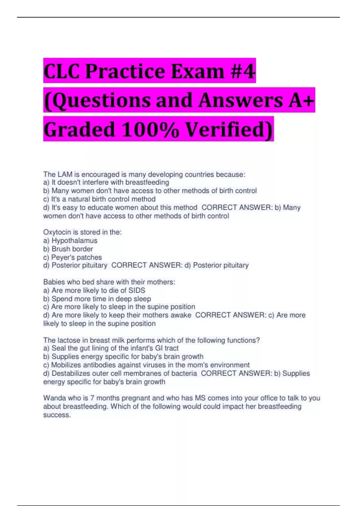 CLC Practice Exam #4 (Questions and Answers A+ Graded 100% Verified) The LAM is encouraged is many developing countries because: a) It doesn't interfere with breastfeeding b) Many women don't have access to other methods of birth control c) It's a natural birth control method d) It's easy to educate women about this method CORRECT ANSWER: b) Many women don't have access to other methods of birth control Oxytocin is stored in the: a) Hypothalamus b) Brush border c) Peyer's patches d) Posterior pituitary CORRECT ANSWER: d) Posterior pituitary Babies who bed share with their mothers: a) Are more likely to die of SIDS b) Spend more time in deep sleep c) Are more likely to sleep in the supine position d) Are more likely to keep their mothers awake CORRECT ANSWER: c) Are more likely to sleep in the supine position The lactose in breast milk performs which of the following functions? a) Seal the gut lining of the infant's GI tract b) Supplies energy specific for baby's brain growth c) Mobilizes antibodies against viruses in the mom's environment d) Destabilizes outer cell membranes of bacteria CORRECT ANSWER: b) Supplies energy specific for baby's brain growth Wanda who is 7 months pregnant and who has MS comes into your office to talk to you about breastfeeding. Which of the following would could impact her breastfeeding success. a) The severity of this condition prior to pregnancy was found to not impact breastfeeding duration b) None of the current medication commonly prescribed for a relapse is noted to be compatible with breastfeeding c) Her chance of relapsing is less if she nurses more than 2 months d) Wanda can expect profound exhaustion in the immediate postpartum period CORRECT ANSWER: c) Her chance of relapsing is less if she nurses more than 2 months The Bellagio Consensus... a) Encourages that public health policies include teaching of LAM b) Encourages visiting Las Vegas to increase breastfeeding rates in Nevada c) Is part a global effort to promote breastfeeding d) Is a WHO/UNICEF initative CORRECT ANSWER: a) Encourages that public health policies include teaching of LAM Maternal diet can affect which of the following nutrients in breast milk? a) Vitamin C b) Lactose c) Iron d) Calcium CORRECT ANSWER: a) Vitamin C What is the average number of ductal openings at the end of nipple? a) 6 b) 9 c) 13 d) 19 CORRECT ANSWER: b) 9 Janette tells you that a 4-week-old Agatha cries a lot and is only happy when she is being held or is breastfeeding. She wants to know what she should do. Your best advise is: a) Babies need to learn to self-comfort, so let Agatha cray a while b) She needs a breastfeeding evaluation to make sure it isn't hunger c) Crying won't hurt her. If you respond to her too quickly, you will spoil her d) The quicker you respond to Agatha, the quicker she will settle CORRECT ANSWER: d) The quicker you respond to Agatha, the quicker she will settle Poor positioning can be associated with: a) Nipple trauma b) Yeast infection of the nipples c) Reflux in the infant d) Hyperlactation syndrome CORRECT ANSWER: a) Nipple trauma Betty's baby is 4-weeks-old and she says that breastfeeding was going well until her nipples started to hurt. She is concerned that it's the baby's latch. When you see her, which question would support your first hunch? a) Have you taken any antibiotics in the last few months? b) Are you on birth control pills? c) Do you eat lots of sugar, yeast breads, cookies, and cakes? d) Are you fatigued and under stress? CORRECT ANSWER: a) Have you taken any antibiotics in the last few months? Mature milk gets about 50% of its energy from: a) Fat b) Lactose c) Protein d) DHA CORRECT ANSWER: a) Fat Taylor is 38 weeks pregnant. She wants to breastfeed, but her doctor said she will have problems because she has inverted nipples. What do you do first? a) Ask Taylor how she feels about having inverted nipples b) Assess Taylor's nipples to determine the severity of the problem c) Provide her with a nipple everter to correct her problem d) Suggest she pump and cup feed her baby breast milk until her nipples can become graspable CORRECT ANSWER: b) Assess Taylor's nipples to determine the severity of the problem Epidural anesthesia can affect the baby in which of the following ways? a) No effect as the medication doesn't leave the epidural space b) Decrease the innate neonatal suckling reflexes c) Increase oxytocin levels in the mother d) Helps the baby relax more as it contains a CNS depressant CORRECT ANSWER: b) Decrease the innate neonatal suckling reflexes A benefit of breastfeeding for the mother employed outside the home is: a) Decreased risk of postpartum depression b) The decreased risk of infant illness through the first year c) An incentive to employers to offer lactation programs d) Easier access into professional day care organizations CORRECT ANSWER: b) The decreased risk of infant illness through the first year Darlene hemorrhaged after birth needing 7 units of blood and delaying the first feed until 36 hours. Today is Darlene's 5th postpartum day; her breasts are soft and there is no evidence of lactogenesis 2 taking place. What is the most likely reason for the delay in Darlene's milk coming in? a) Sheehan's syndrome b) The blood lost contained the prolactin necessary for lactogenesis 2 c) She didn't receive any breast stimulation for the first 36 hours d) The hemorrhage caused damage to the thyroid gland CORRECT ANSWER: a) Sheehan's syndrome The worldwide average age for weaning is: a) 6 months b) 1-2 years c) 2-3 years d) 3-4 years CORRECT ANSWER: d) 3-4 years Colostrum's yellow color is due to: a) Concentration of fat cells b) The low amount of protein in colostrum c) Beta-carotene d) Concentration of thiamine in colostrum CORRECT ANSWER: c) Beta-carotene Which of the following statements about inducing lactation is correct? a) Onset of lactation averages about 1.5 weeks after starting pumping b) The success rate decreases if the baby has been bottle-fed for 