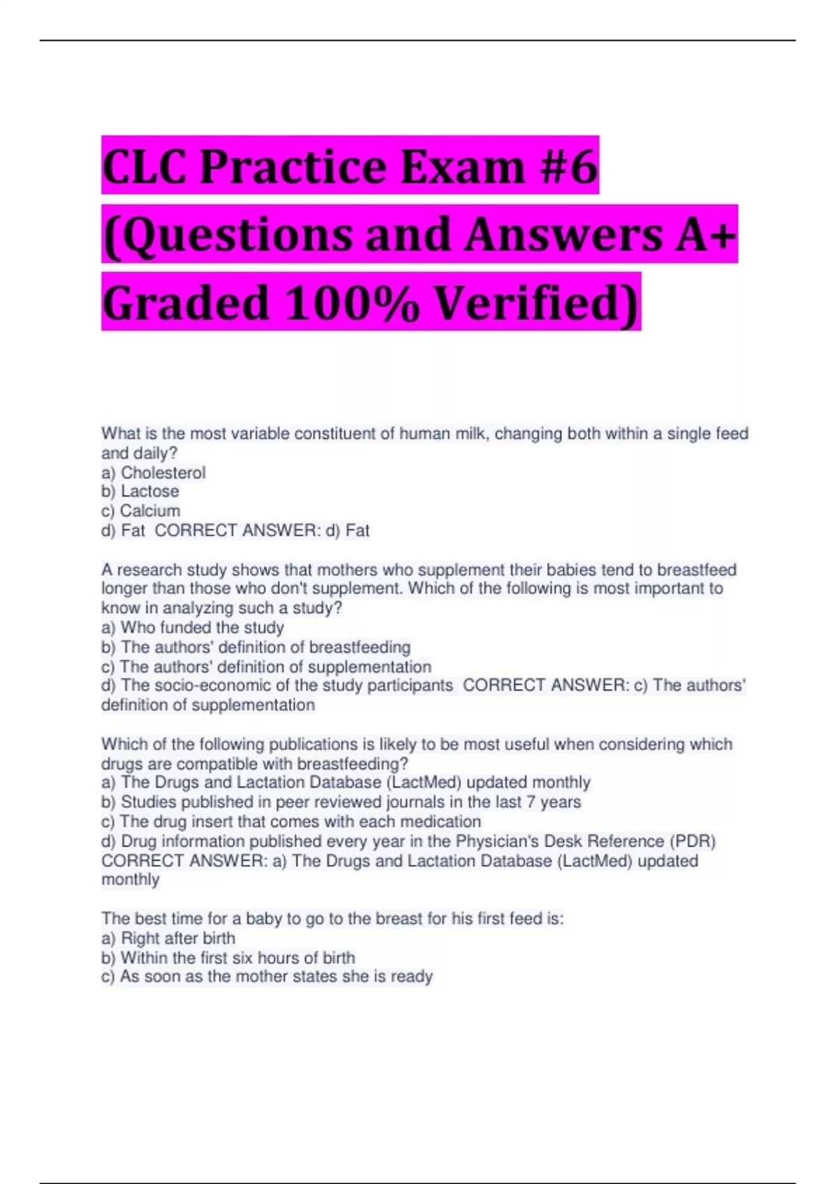 CLC Practice Exam #6 (Questions and Answers A+ Graded 100% Verified) What is the most variable constituent of human milk, changing both within a single feed and daily? a) Cholesterol b) Lactose c) Calcium d) Fat CORRECT ANSWER: d) Fat A research study shows that mothers who supplement their babies tend to breastfeed longer than those who don't supplement. Which of the following is most important to know in analyzing such a study? a) Who funded the study b) The authors' definition of breastfeeding c) The authors' definition of supplementation d) The socio-economic of the study participants CORRECT ANSWER: c) The authors' definition of supplementation Which of the following publications is likely to be most useful when considering which drugs are compatible with breastfeeding? a) The Drugs and Lactation Database (LactMed) updated monthly b) Studies published in peer reviewed journals in the last 7 years c) The drug insert that comes with each medication d) Drug information published every year in the Physician's Desk Reference (PDR) CORRECT ANSWER: a) The Drugs and Lactation Database (LactMed) updated monthly The best time for a baby to go to the breast for his first feed is: a) Right after birth b) Within the first six hours of birth c) As soon as the mother states she is ready d) When the baby demonstrates feeding cues CORRECT ANSWER: d) When the baby demonstrates feeding cues How does the growth pattern of the breastfed infant differ from the formula-fed infant? a) The breastfed newborn gains more slowly at all points in time than a formula-fed infant b) After an accelerated growth in the early months the breastfed baby slows at about 4 months c) The formula-fed infant grows in length faster than the breastfed baby in the first 6 months d) The breastfed infant has a larger head circumference than the formula-fed infant CORRECT ANSWER: b) After an accelerated growth in the early months the breastfed baby slows at about 4 months The LEAST important reason for accurate documentation is: a) To defend yourself in case of a lawsuit b) To provide parents with an individualized plan of care c) To assure the primary HCP has an accurate record of all intervention and suggestions d) To fulfill the requirements of the Standards of Practice for lactation consultants CORRECT ANSWER: b) To provide parents with an individualized plan of care Which factor is higher in colostrum than in mature milk? a) Fat b) Lactose c) Protein d) Oligosaccharides CORRECT ANSWER: c) Protein A 1-month-old infant who has malaria probably acquired the disease: a) Through breast milk b) Via the placenta during the pregnancy c) Via exposure to the vaginal secretions at the time of brith d) Via exposure to the anopheles mosquitos CORRECT ANSWER: d) Via exposure to the anopheles mosquito The most common cause of sore nipples is related to: a) Incorrect positioning of the baby at the breast b) Concurrent infection of both mother and baby with yeast c) Feeds lasting longer than 15 minutes on each breast d) Oral abnormalities of the infant such as ankyloglossia CORRECT ANSWER: a) Incorrect positioning of the baby at the breast For a mother to fractionate (lactoengineer) her milk she needs to: a) Pump every 1-1.5 hours b) Use hand expression, not a breast pump c) Have an abundant milk supply d) Use only one collection container CORRECT ANSWER: c) Have an abundant milk supply Which matters the most in regards to which women will attend a breastfeeding class? a) If she has some kind of insurance b) Mother's race or ethnicity c) Middle or higher class income d) Education beyond high school CORRECT ANSWER: a) If she has some kind of insurance A short lingual frenulum is referred to as: a) Labioglossia b) Ankyloglossia c) Retracted tongue d) Labial tongue-tie CORRECT ANSWER: b) Ankyloglossia According to WHO literature, mastitis is more common in first time breastfeeding mothers. The primary reason for this trend may be that first time mothers are more: a) Stressed about breastfeeding and childcare b) Likely to have latch problems resulting in sore nipples c) Reluctant to call their physicians or seek help d) Prone to infection in general due to fatigue CORRECT ANSWER: b) Likely to have latch problems resulting in sore nipples Georgia asks you how long Mimosa should breastfeed each time. What do you tell her? a) At least 10 minutes on the first side and as long as she wants on the second. b) She doesn't need to breastfeed any longer than about 7 minutes on a side because 90% of the milk is gone by then. c) At least 15 minutes on each breast to make sure the breasts receive equal stimulation d) Until Mimosa stops breastfeeding on the first side, then offer the second. CORRECT ANSWER: d) Until Mimosa stops breastfeeding on the first side, then offer the second Which category of drugs is a breastfeeding mother most likely to take? a) Antibiotics b) Antidepressants c) Analgesics d) Antiemetics CORRECT ANSWER: c) Analgesics The AAP Statement recommends pacifiers for infants in the following situations: a) Whenever the infant is in a prone position b) All infants under 4 weeks of age c) Breastfed infants over 4 weeks of age d) Families with a history of SIDS CORRECT ANSWER: c) Breastfed infants over 4 weeks of age Which of the following nutritional advice for breastfeeding women is evidence-based? a) Increase caloric intake by 500 calories per day b) Drink enough fluids to satisfy thirst c) Avoid spicy foods as they will affect the baby's digestion d) Drink at least 2, 8 oz. glasses of milk per day CORRECT ANSWER: b) Drink enough fluids to satisfy thirst The birth spacing effects of breastfeeding are most beneficial for: a) Infant well-being b) Lactational amenorrhea c) Maternal recovery from childbirth d) Increasing ovulation CORRECT ANSWER: c) Maternal recovery from childbirth Lactoferrin is a whey protein that is protective against infection through: a) Preventing the bacteria from ingesting fat b) Destabilizing the outer cell membrane of 