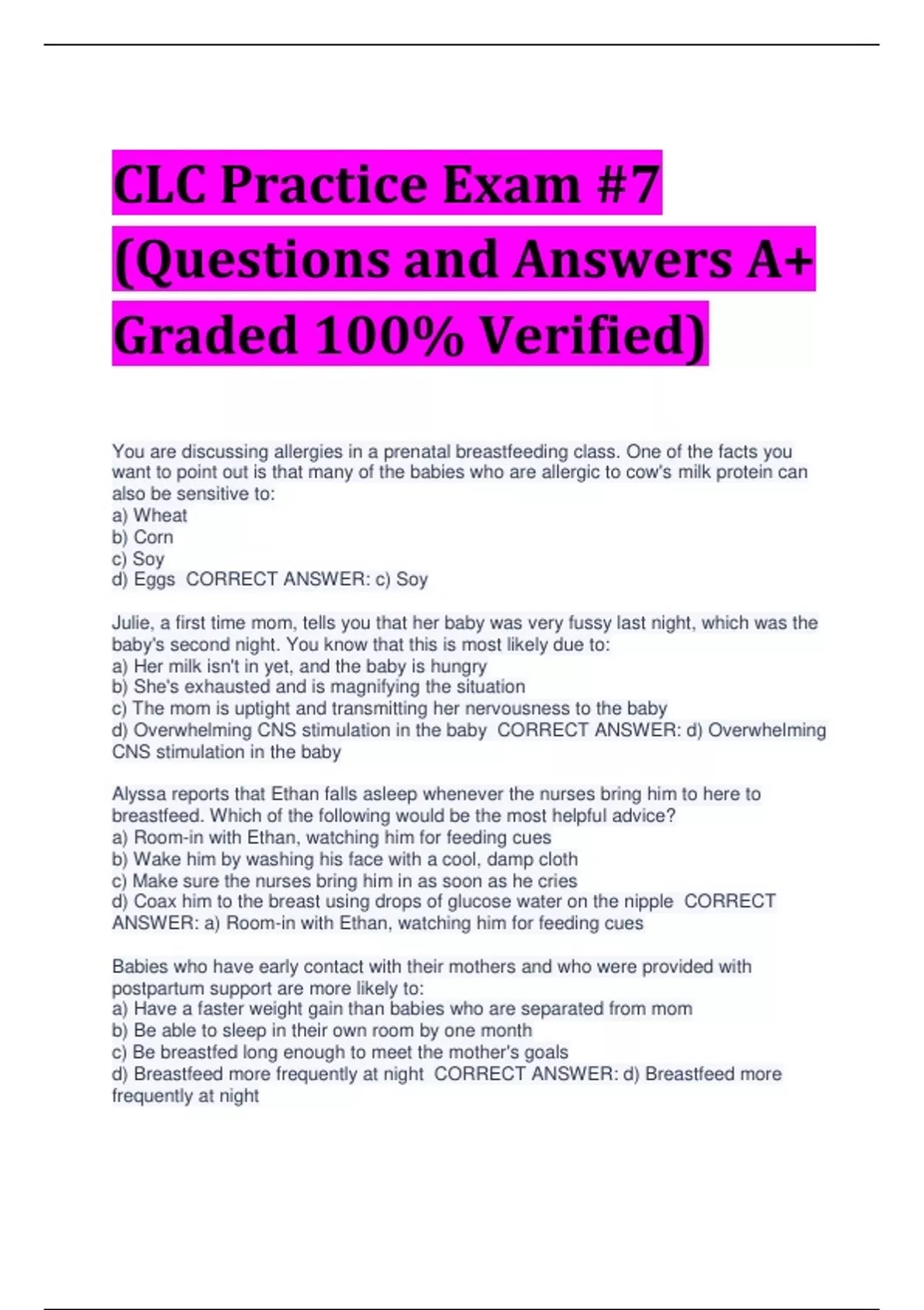 CLC Practice Exam #7 (Questions and Answers A+ Graded 100% Verified) You are discussing allergies in a prenatal breastfeeding class. One of the facts you want to point out is that many of the babies who are allergic to cow's milk protein can also be sensitive to: a) Wheat b) Corn c) Soy d) Eggs CORRECT ANSWER: c) Soy Julie, a first time mom, tells you that her baby was very fussy last night, which was the baby's second night. You know that this is most likely due to: a) Her milk isn't in yet, and the baby is hungry b) She's exhausted and is magnifying the situation c) The mom is uptight and transmitting her nervousness to the baby d) Overwhelming CNS stimulation in the baby CORRECT ANSWER: d) Overwhelming CNS stimulation in the baby Alyssa reports that Ethan falls asleep whenever the nurses bring him to here to breastfeed. Which of the following would be the most helpful advice? a) Room-in with Ethan, watching him for feeding cues b) Wake him by washing his face with a cool, damp cloth c) Make sure the nurses bring him in as soon as he cries d) Coax him to the breast using drops of glucose water on the nipple CORRECT ANSWER: a) Room-in with Ethan, watching him for feeding cues Babies who have early contact with their mothers and who were provided with postpartum support are more likely to: a) Have a faster weight gain than babies who are separated from mom b) Be able to sleep in their own room by one month c) Be breastfed long enough to meet the mother's goals d) Breastfeed more frequently at night CORRECT ANSWER: d) Breastfeed more frequently at night On the physical exam of a 28-week preterm infant , which of the following is likely to be found? a) Lanugo all over the body b) Dry and peeling skin c) Palpable breast buds d) Ability to coordinate suck, swallow, and breathe CORRECT ANSWER: a) Lanugo all over the body Cherie, a new mother, with a 4-week-old infant, visits you for a breastfeeding evaluation. In the process of taking her history, you find that Cherie eats mostly chips, cookies and soda "because she is just too busy to prepare anything". Your MOST IMPORTANT concern with Cherie's diet is: a) The quality of her breast milk b) The quantity of her breast milk c) The health of the baby d) The depletion of Cherie's nutrient stores CORRECT ANSWER: d) The depletion of Cherie's nutrient stores Halli is now 2-hours-old and still has not shown any interest in nursing. You do a blood sugar test on Halli, and find that it's 38 mg/dL, which is lower than your hospital standard of 40 mg/dL. What should you do first? a) Put her under the warmer as she is most likely hypothermic b) Give her 1 oz. of formula by finger-feeding c) Have mom hand express colostrum and feed her with a spoon d) Wait about 30 seconds and use a second reagent strip to check the glucose CORRECT ANSWER: d) Wait about 30 seconds and use a second reagent strip to check the glucose Mothers with breastfeeding problems may be hesitant to seek help from a professional for the following reason: a) Lack of insurance coverage for lactation services b) Having to leave her home to seek help c) Stress of having to repeat "her story" to multiple people d) Having problems is in conflict with the image of being a super-mom, which she wants to portray CORRECT ANSWER: d) Having problems is in conflict with the image of being a super-mom, which she wants to portray A type of research that focuses on relationships among variables is called: a) Qualitative b) Quantitative c) Statistically significant d) Randomized controlled trials CORRECT ANSWER: b) Quantitative Nipple erection is induced by which of the following? a) Myoepithelial cells contracting the lactiferous sinuses b) Somatic parasympathetic stimuli c) Autonomic sympathetic stimuli d) Adequate levels of aphrodisiacs CORRECT ANSWER: b) Somatic parasympathetic stimuli Which of the following drug categories are contraindicated for use during breastfeeding? a) Pseudoephedrine b) Oral contraceptives c) Cancer chemotherapeutic agents d) Diuretics CORRECT ANSWER: c) Cancer chemotherapeutic agents You are a nurse who works at St. Beneficial Hospital. You have just delivered preterm twins. A formula representative offers you samples of a new formula, which provides specific nutrients for your low birth weight infants. In what way is this a violation of the International Code of the Marketing of Breast-Milk Substitutes (WHO Code)? a) This isn't a violation as the WHO Code provides for samples of specialized formulas for low birth weight babies b) The WHO Code states that no personal samples of formula may be given to health care workers c) As an employee of a not-for-profit hospital, you cannot accept gifts from formula companies d) This isn't a violation because you are unable to breastfeed your twins, so accepting formula isn't an issue CORRECT ANSWER: b) The WHO Code states that no personal samples of formula may be given to health care workers Month-old Reuben weighed 7 lbs., 2 oz. at birth. When you weigh him, he is 7 lbs., 4 oz. Helen-Clare says Reuben nurses all the time and never seems satisfied. When you do ac/pc weights, he transfers a total of 37 mL. When Helen-Clare pumps for residual milk, she gets an additional 3 mL. Which suggestion will you make first? a) You need to make sure the feedings are finished within 45 minutes so both of you can get rest b) Reuben needs a supplement, which will provide him with additional calories c) You need to use a nursing supplementer to give Reuben the extra calories he needs and provide some breast stimulation at the same time d) To increase your milk supply, you are going to need to pump with a quality breast pump and take some galactogogues CORRECT ANSWER: b) Reuben needs a supplement, which will provide him with additional calories Infants who have a higher than average number of bowel movements during the first 3 DOL will probably exhibit which of the following: a) Dehydration as evidenced by poor skin turgor b) Later transition to yellow