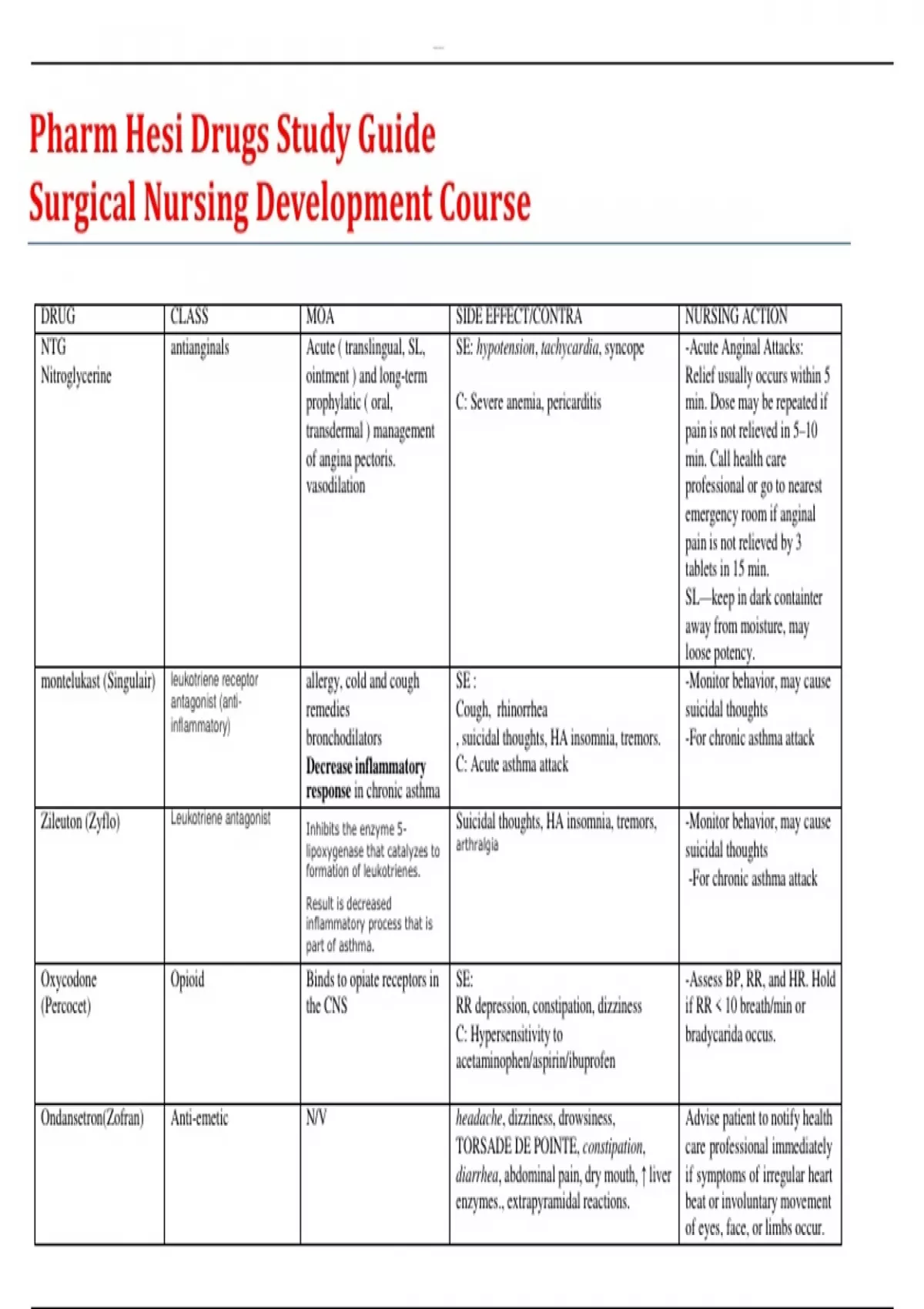 DRUG CLASS MOA SIDE EFFECT/CONTRA NURSING ACTION