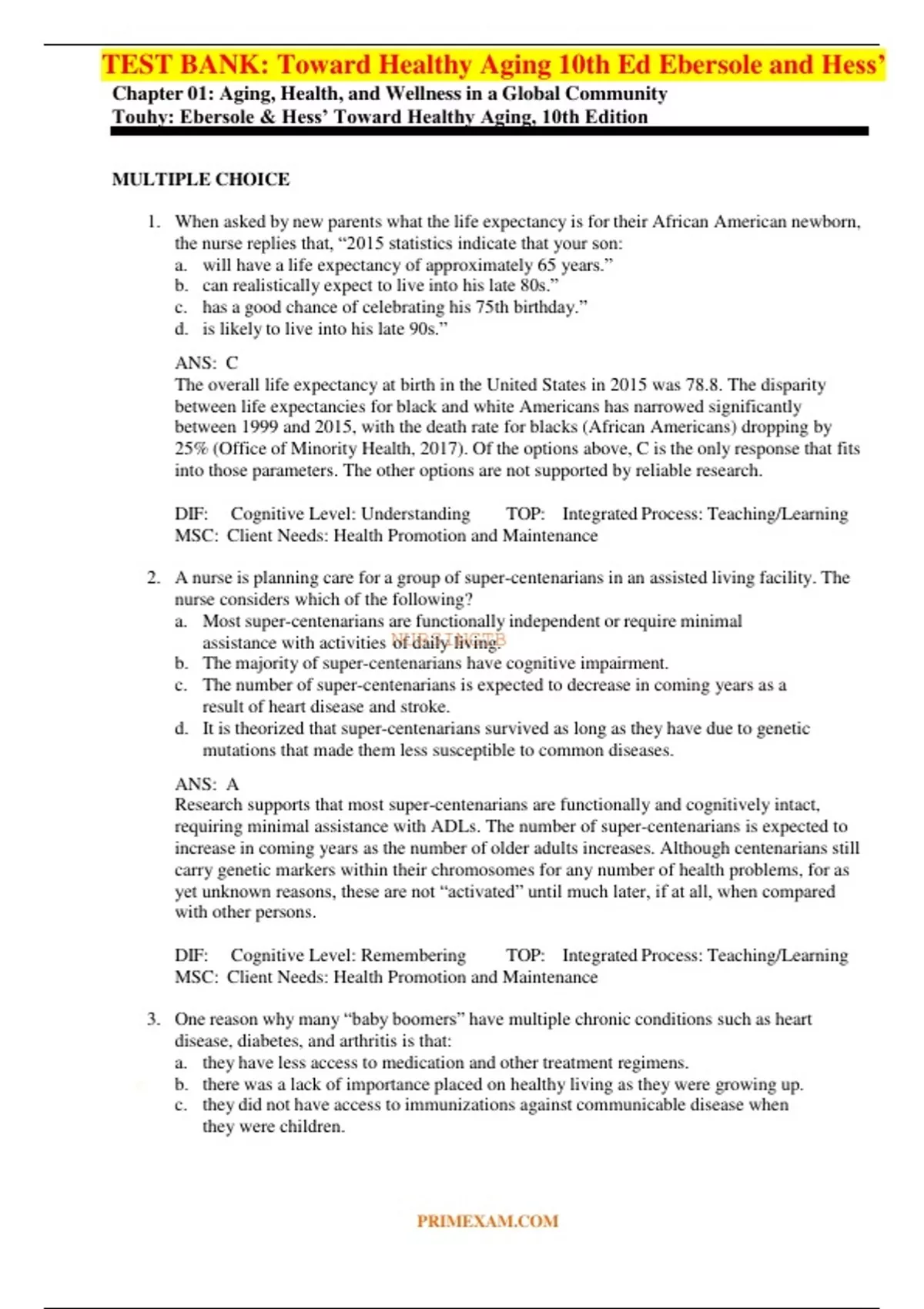 TEST BANK: TOWARD HEALTHY AGING, 10TH EDITION EBERSOLE AND HESS’-1. When asked by new parents what the life expectancy is for their African American newborn, the nurse replies that, “2015 statistics indicate that your son: a. will have a life expectancy of approximately 65 years.” b. can realistically expect to live into his late 80s.” c. has a good chance of celebrating his 75th birthday.” d. is likely to live into his late 90s.” ANS: C The overall life expectancy at birth in the United States in 2015 was 78.8. The disparity between life expectancies for black and white Americans has narrowed significantly between 1999 and 2015, with the death rate for blacks (African Americans) dropping by 25% (Office of Minority Health, 2017). Of the options above, C is the only response that fits into those parameters. The other options are not supported by reliable research. DIF: Cognitive Level: Understanding TOP: Integrated Process: Teaching/Learning MSC: Client Needs: Health Promotion and Maintenance 2. A nurse is planning care for a group of super-centenarians in an assisted living facility. The nurse considers which of the following? a. Most super-centenarians are functionally independent or require minimal assistance with activities NofUdRaSilyIlNivGinTgB. b. The majority of super-centenarians have cognitive impairment. c. The number of super-centenarians is expected to decrease in coming years as a result of heart disease and stroke. d. It is theorized that super-centenarians survived as long as they have due to genetic mutations that made them less susceptible to common diseases. ANS: A Research supports that most super-centenarians are functionally and cognitively intact, requiring minimal assistance with ADLs. The number of super-centenarians is expected to increase in coming years as the number of older adults increases. Although centenarians still carry genetic markers within their chromosomes for any number of health problems, for as yet unknown reasons, these are not “activated” until much later, if at all, when compared with other persons. DIF: Cognitive Level: Remembering TOP: Integrated Process: Teaching/Learning MSC: Client Needs: Health Promotion and Maintenance 3. One reason why many “baby boomers” have multiple chronic conditions such as heart disease, diabetes, and arthritis is that: a. they have less access to medication and other treatment regimens. b. there was a lack of importance placed on healthy living as they were growing up. c. they did not have access to immunizations against communicable disease when they were children. d. they grew up in an era of rampant poverty and malnutrition. ANS: B The baby boomers, individuals born between 1946 and 1964, post-WWII, have better access to medication and treatment regimens than other cohorts. They have had the benefit of the development of immunizations against communicable diseases. They grew up in an era of prosperity post-WWII. However, there was a lack of importance placed on what we now consider healthy living when they were younger. Smoking, for example, was not condoned, but was considered a symbol of status. Candy in the shape of cigarettes was popular, and there was much secondhand smoke. DIF: Cognitive Level: Remembering TOP: Integrated Process: Teaching/Learning MSC: Client Needs: Health Promotion and Maintenance 4. A nurse is planning an education program on wellness in a local senior citizen center. The nurse plans to provide education on the importance of immunizations, annual physical examinations, screening for diabetes, and vision and hearing screening. It is important for the nurse to understand which of the following? a. Less than 50% of older adults (ages 65 and older) utilize available preventive services. b. Preventive strategies are more widely used in the 50-64 age-group than in the 65 and over age-group. c. The research on health promotion strategies in older adults demonstrates that they have low efficacy. d. There is an abundance of research specific to health promotion and aging. ANS: A Less than 50% of individuals, ages 65 and older, utilize the preventive services that are available to them. However, only 25% of those between the ages of 50 and 64 do so. There is a paucity of research specific to health promotion and aging; however, the research that exists demonstrates that health promotion strategies are highly effective. DIF: Cognitive Level: Understanding TOP: Integrated Process: Teaching/Learning MSC: Client Needs: Health Promotion and Maintenance 5. A nurse is caring for an 85-year-old male client with diabetes in a community setting. The nurse promotes functional wellness by which of the following activities? a. Encouraging the client to maintain current levels of physical activity b. Assisting the client to receive all the recommended preventive screenings that are appropriate for his age-group c. Teaching the patient how to use a rolling walker so that he can ambulate for longer distances d. Encouraging the client to attend his weekly chess games ANS: A Maintaining existing levels of physical activity is consistent with functional wellness. Teaching the client how to use a rolling walker enables the client to remain active at the highest level possible, which is an example of promoting functional wellness. Receiving recommended screening is an example of promoting biological wellness. The use of a rolling walker should be based on assessment of physical ability. Encouraging the client to attend weekly chess games is an example of promoting social wellness. DIF: Cognitive Level: Applying TOP: Integrated Process: Teaching/Learning MSC: Client Needs: Health Promotion and Maintenance 6. Based on the census reports of 2015, the typical profile of a centenarian includes which of the following characteristics? a. An American woman with no signs of dementia b. A Japanese woman with chronic inflammation c. A Chinese man with an immune disorder d. An American man who is a lifelong