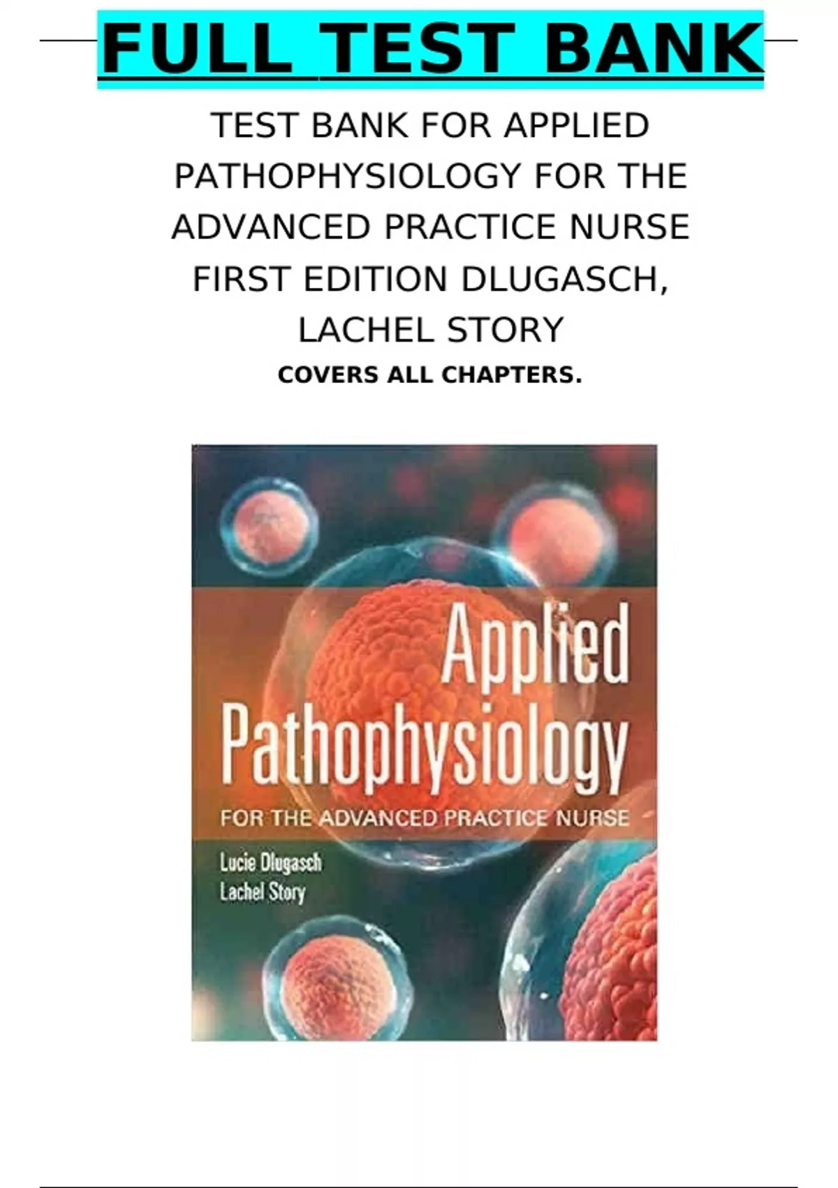 TEST BANK FOR APPLIED PATHOPHYSIOLOGY FOR THE ADVANCED PRACTICE NURSE FIRST EDITION DLUGASCH, LACHEL STORY 1. Protein hormones and enzymes are stored in the _ , awaiting signals to be released into the cell. A) food vacuole B) Golgi complex C) rough endoplasmic reticulum D) secretory vesicles Ans: D Complexity: Easy Ahead: Basic Cell Function and Structure Subject: Chapter 1 Title: Cellular Function 2. Low serum albumin levels (hypoalbuminemia) can cause edema because: A) oncotic pressure increases. B) oncotic pressure decreases. C) osmotic pressure increases. D) hydrostatic pressure decreases. Ans: B Complexity: Easy Ahead: Basic Cell Function and Structure Subject: Chapter 1 Title: Cellular Function 3. Neurotransmitters are packaged into vesicles and then fuse with the cell membrane for release. This is an example of: A) pinocytosis. B) phagocytosis. C) exocytosis. Applied Pathophysiology for the Advanced Practice Nurse, First Edition Lucie Dlugasch, Lachel Story Chapter 1 Assessment Quiz D) endocytosis. Ans: C Complexity: Easy Ahead: Basic Cell Function and Structure Subject: Chapter 1 Title: Cellular Function