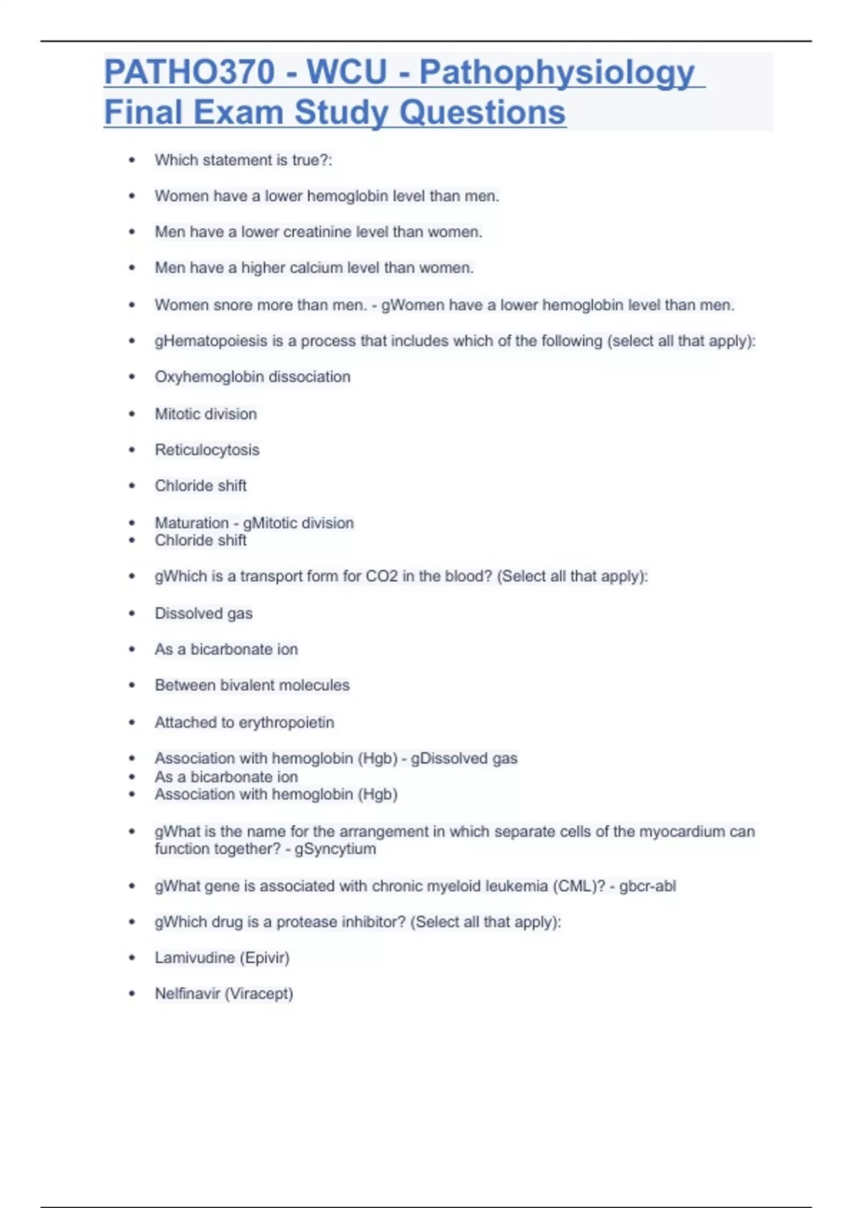 • Which statement is true?: • Women have a lower hemoglobin level than men. • Men have a lower creatinine level than women. • Men have a higher calcium level than women. • Women snore more than men. - gWomen have a lower hemoglobin level than men. • gHematopoiesis is a process that includes which of the following (select all that apply): • Oxyhemoglobin dissociation • Mitotic division • Reticulocytosis • Chloride shift • Maturation - gMitotic division • Chloride shift • gWhich is a transport form for CO2 in the blood? (Select all that apply): • Dissolved gas • As a bicarbonate ion • Between bivalent molecules • Attached to erythropoietin • Association with hemoglobin (Hgb) - gDissolved gas • As a bicarbonate ion • Association with hemoglobin (Hgb) • gWhat is the name for the arrangement in which separate cells of the myocardium can function together? - gSyncytium • gWhat gene is associated with chronic myeloid leukemia (CML)? - gbcr-abl • gWhich drug is a protease inhibitor? (Select all that apply): • Lamivudine (Epivir) • Nelfinavir (Viracept)