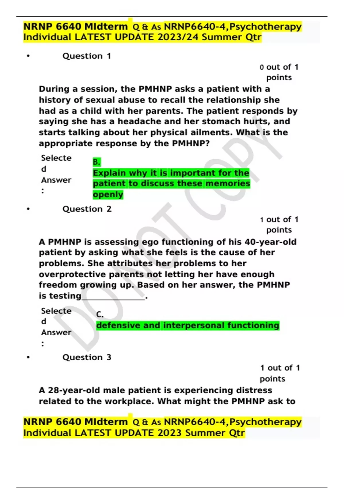 NRNP 6640 MIdterm Q & As NRNP6640-4,Psychotherapy Individual LATEST UPDATE 2023/24 Summer NRNP 6640 MIdterm Q & As NRNP6640-4,Psychotherapy Individual LATEST UPDATE 2023/24 Summer NRNP 6640 MIdterm Q & As NRNP6640-4,Psychotherapy Individual LATEST UPDATE 2023/24 Summer Qtr