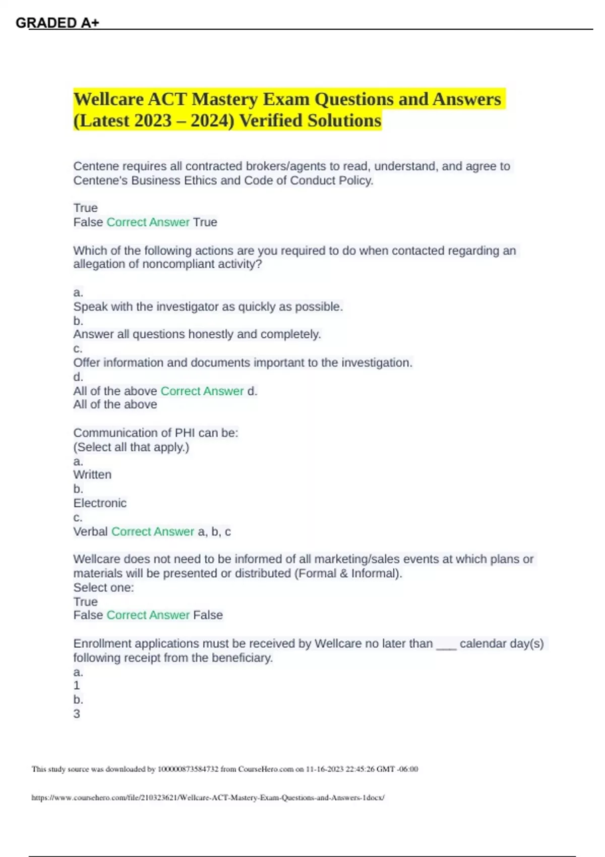 Wellcare ACT Mastery Exam Questions and Answers (Latest 2023 – 2024) Verified Solutions Centene requires all contracted brokers/agents to read, understand, and agree to Centene's Business Ethics and Code of Conduct Policy. True False Correct Answer True Which of the following actions are you required to do when contacted regarding an allegation of noncompliant activity? a. Speak with the investigator as quickly as possible. b. Answer all questions honestly and completely. c. Offer information and documents important to the investigation. d. All of the above Correct Answer d. All of the above Communication of PHI can be: (Select all that apply.) a. Written b. Electronic c. Verbal Correct Answer a, b, c Wellcare does not need to be informed of all marketing/sales events at which plans or materials will be presented or distributed (Formal & Informal). Select one: True False Correct Answer False Enrollment applications must be received by Wellcare no later than ___ calendar day(s) following receipt from the beneficiary. a. 1 b. 3 This study source was downloaded by from CourseH on :45:26 GMT -06:00 GRADED A+ c. 5 d. 7 Clear my choice Correct Answer a. 1 Ascend is a fast, easy, and compliant way for brokers/agents to submit agent-assisted electronic enrollments. Select one: True False Correct Answer True During an appointment, you may not discuss any products not agreed to in advance by the beneficiary. Select one: True False Correct Answer True A Health Risk Assessment (HRA): a. Provides physicians with an overview of a member's health status. b. Ensures members are able to access care and receive services that meet their needs. c. Is an important part of our quality initiative, directly impacting our Star Ratings. d. All of the above Correct Answer d. All of the above Which elements are available as part of Wellcare's sales support model? a. Online b. Local c. Corporate d. All of the above Correct Answer d. All of the above Once the enrollment is completed, you can save a copy of the application for your reference. Select one: True False Correct Answer False This study source was downloaded by from CourseH