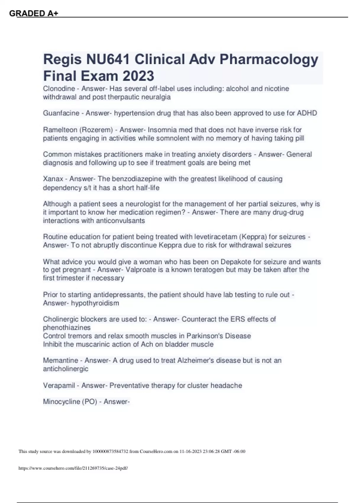 Regis NU641 Clinical Adv Pharmacology Final Exam 2023 Clonodine - Answer- Has several off-label uses including: alcohol and nicotine withdrawal and post therpautic neuralgia Guanfacine - Answer- hypertension drug that has also been approved to use for ADHD Ramelteon (Rozerem) - Answer- Insomnia med that does not have inverse risk for patients engaging in activities while somnolent with no memory of having taking pill Common mistakes practitioners make in treating anxiety disorders - Answer- General diagnosis and following up to see if treatment goals are being met Xanax - Answer- The benzodiazepine with the greatest likelihood of causing dependency s/t it has a short half-life Although a patient sees a neurologist for the management of her partial seizures, why is it important to know her medication regimen? - Answer- There are many drug-drug interactions with anticonvulsants Routine education for patient being treated with levetiracetam (Keppra) for seizures - Answer- To not abruptly discontinue Keppra due to risk for withdrawal seizures What advice you would give a woman who has been on Depakote for seizure and wants to get pregnant - Answer- Valproate is a known teratogen but may be taken after the first trimester if necessary Prior to starting antidepressants, the patient should have lab testing to rule out - Answer- hypothyroidism Cholinergic blockers are used to: - Answer- Counteract the ERS effects of phenothiazines Control tremors and relax smooth muscles in Parkinson's Disease Inhibit the muscarinic action of Ach on bladder muscle Memantine - Answer- A drug used to treat Alzheimer's disease but is not an anticholinergic Verapamil - Answer- Preventative therapy for cluster headache Minocycline (PO) - AnswerThis study source was downloaded by from CourseH on :06:28 GMT -06:00 GRADED A+ When prescribing for migraines, patient education includes: - Answer- Stress reduction and regular sleep are integral to migraine treatment Acetaminophen - Answer- Migraines in pregnancy may be safely treated with this When are migraines considered cured? - Answer- There is no known cure Nonpharmacologic Therapy for tension headache includes: - Answer- biofeedback, stress management, massage therapy Fluoxetine - Answer- First-line antidepressant for children with major depression between 8 to 17 years old SSRIs - Answer- Contains a black-box warning of suicidal ideation in pediatric and adolescent groups Stimulants (methylphenidate or amphetamine salts) - Answer- Are the most effective therapy and are generally first line of treatment of ADHD in children unless contraindications exist Hypercalcemia - Answer- Pt treated with more than 100 grams per week of topical calcipotriene for psoriasis need to be monitored for An adolescent female calls the clinic with concerns that her acne is worse 2 weeks after starting topical tretinoin. What would be the appropriate care for her? - AnswerReassure her that the worsening of acne is normal and it should improve with continued use Treatment for Tinea capitis - Answer- Oral griseofulvin or Biweekly shampoo with selenium sulfide or ketoconazole for 6 to 8 weeks Treatment for Tinea corporis and tinea pedis - Answer- Topical antifungals like miconazole applied twice daily for 4 weeks Treatment of Onychomycosis - Answer- Oral griseofulvin, ketoconazole, itraconazole, or terbinafine for several months; topical product is ciclopirox 8% (Penlac) Common treatments and counseling points for scabies - Answer- Common therapies: permethrin, ivermectin, crotamiton For permethrin, apply from the neck down, and leave the medication on for at least eight to 10 hours. Often, all household members and other close contacts should be treated. Bedding, clothing, and towels used by infested persons or their household, sexual, and close contacts (as defined above) anytime during the three days before treatment should be decontaminated by washing in hot water and drying in a hot dryer, by drycleaning, or by sealing in a plastic bag for at least 72 hours.