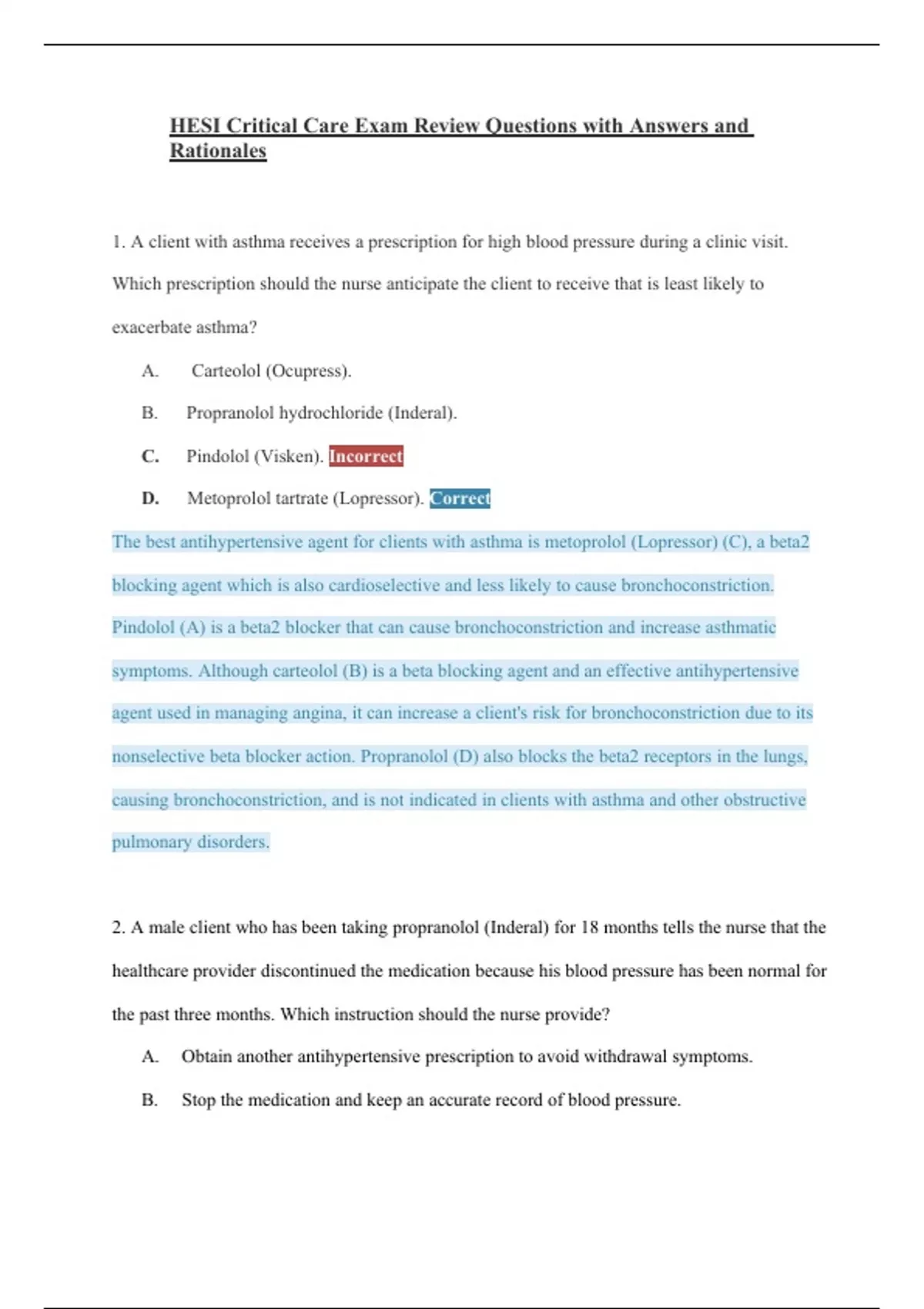 HESI Critical Care Exam Review Questions with Answers and Rationales 1. A client with asthma receives a prescription for high blood pressure during a clinic visit. Which prescription should the nurse anticipate the client to receive that is least likely to exacerbate asthma?