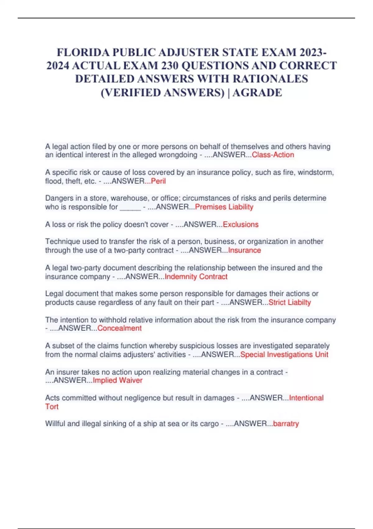 FLORIDA PUBLIC ADJUSTER STATE EXAM ACTUAL EXAM 230 QUESTIONS AND CORRECT DETAILED ANSWERS WITH RATIONALES (VERIFIED ANSWERS) | AGRADE