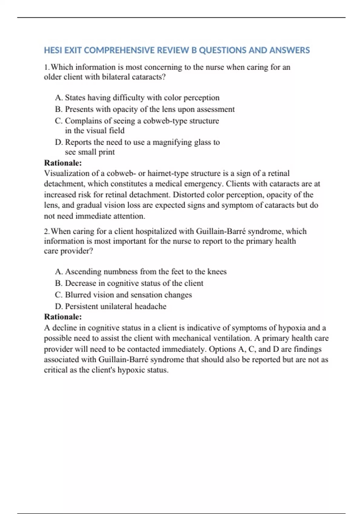 HESI EXIT COMPREHENSIVE REVIEW B QUESTIONS AND ANSWERS 1. Which information is most concerning to the nurse when caring for an older client with bilateral cataracts?