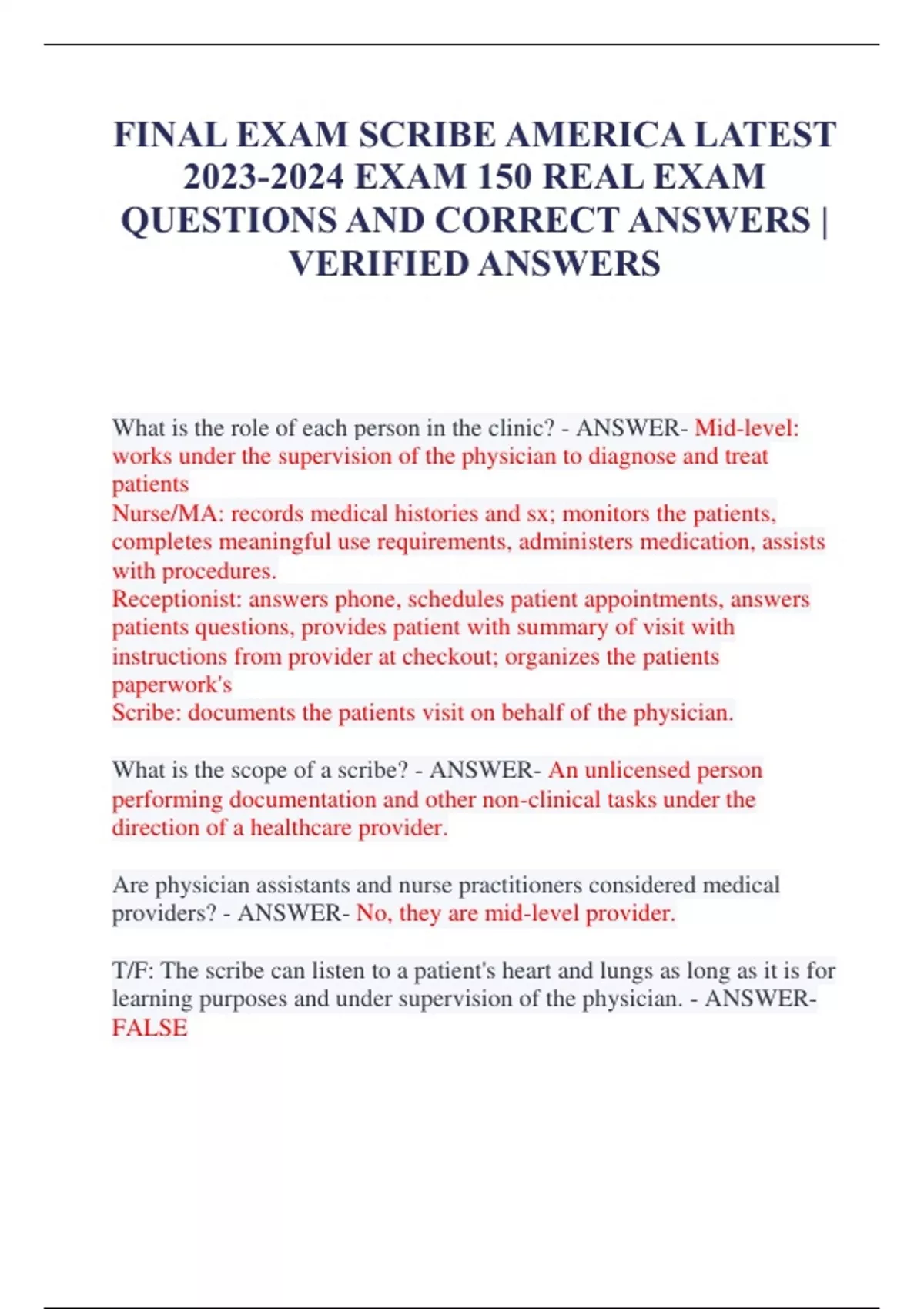 FINAL EXAM SCRIBE AMERICA LATEST EXAM 150 REAL EXAM QUESTIONS AND CORRECT ANSWERS | VERIFIED ANSWERS What is the role of each person in the clinic? - ANSWER- Mid-level: works under the supervision of the physician to diagnose and treat patients Nurse/MA: records medical histories and sx; monitors the patients, completes meaningful use requirements, administers medication, assists with procedures. Receptionist: answers phone, schedules patient appointments, answers patients questions, provides patient with summary of visit with instructions from provider at checkout; organizes the patients paperwork's Scribe: documents the patients visit on behalf of the physician. What is the scope of a scribe? - ANSWER- An unlicensed person performing documentation and other non-clinical tasks under the direction of a healthcare provider. Are physician assistants and nurse practitioners considered medical providers? - ANSWER- No, they are mid-level provider. T/F: The scribe can listen to a patient's heart and lungs as long as it is for learning purposes and under supervision of the physician. - ANSWERFALSE What will the scribe document for the outpatient visit? - ANSWERDocument the history, physical exam, results, procedures, assessment, and plan. Lucy has been seen by Dr. Heart for the past 2 years. She is here today for a routine appointment with Dr. Heart. Is Lucy a new or established patient? - ANSWER- Established A patient made an appointment because she developed a rash a few days ago. What type of visit would this be? - ANSWER- Diagnostic A patient has an appointment for management of her diabetes. What type of visit would this be? - ANSWER- Health Management Who is the first person to speak with the patient after is he/she is placed in a room? - ANSWER- Physician What are the meaningful use requirements the nurse/MA will obtain? - ANSWER- Chief complaint, vital signs (HR, BP, T, RR), height, weight, BMI, smoking status What does H&P abbreviate and who perform this evaluation? - ANSWER- History and physical, physician evaluation Is a differential diagnosis necessary for a health management visit? - ANSWER- No, only for diagnostic visit. (Possible Dx that may be causing the symptoms) What information will be included in the patient's plan? Give three examples. - ANSWER- Follow-up with specialist if necessary, instructions for lifestyle and preventative care, and follow-up for next routine appointment. At what age would a family member's cardiac disease indicate an increased risk for similar heart disease in the patient? - ANSWERMI/CAD less than 55 y/o What are three common general family histories your physician may ask about? - ANSWER- HTN, DM, CA Would PMHx of chronic alcoholism belong in the SHx section as well as the PMHx section? - ANSWER- Social History (SHx) Why must smoking status be documented on every patient 13 years and older? - ANSWER- Meaningful use requirement. Name the three most common routes of administration of illicit drugs. - ANSWER- oral, inhaled, injection The patient's mother states, "The daycare called me to pick up Angela and her brother because Angela had a fever." What are three items you can document under social history for Angela? - ANSWER- Mother (brought in and caretaker), goes to Daycare, has a brother. If a patient has had respiratory symptoms for the past 5 weeks, are the symptoms considered chronic? - ANSWER- No. An illness is typically classified as chronic when it lasts longer than 3months. What is a comorbidity? - ANSWER- Patients with comorbidities are complex in a number of ways: The treatment of one disease may affect or contradict the treatment of the second; adverse drug interactions; compounding symptoms may lead to poor compliance with treatment plan; if both illnesses affect a specific organ system, the patient is at increased risk of organ failure. Having multiple comorbidities increases the _________ of patient care. - ANSWER- List two ways comorbidity increases complexity? - ANSWER- The treatment of one disease may affect or contradict the treatment of the second; adverse drug interactions; compounding symptoms may lead to poor compliance with treatment plan; if both illnesses affect a specific organ system, the patient is at increased risk of organ failure. Why is it important to document accurately and thoroughly on complex patients? - ANSWER- Complex patients often bill to higher level. Which of the following can be caused by HTN? - ANSWER- MI/CAD, CHF, CVA (cerebro-vascular accident: stroke), Renal Failure, Impaired Vision. Can a patient be diagnosed with HTN without showing any symptoms? - ANSWER- Yes, because it is often asymptomatic. A common part of the plan for hypertensive patients is to (increase/decrease) sodium intake? - ANSWER- DECREASE. Document: "low sodium diet encouraged" What does HCTZ stand for and what type of drug is it? - ANSWERStands for Hydrochlorothiazide. It is a diuretics, which reduces the volume of fluid in the blood vessels by urinating excess fluid. Which of the following medications are insulin? - ANSWER- Humalog (Short acting insulin, injected before or immediately after meals), Lantus (long acting insulin injected once daily), and sliding scale (patient determines insulin dosage based on current glucose). Can a patient take oral medication for type I DM? - ANSWER- No. Only with insulin. It is insulin insufficiency-- the pancreas is unable to produce insulin which moves glucose from the blood into cells. With sliding scale insulin treatment, the patient adjusts the dosage of insulin based on _________. - ANSWER- Current glucose Name two body systems that would be at increased risk of failure if the patient had both HTN and DM. - ANSWER- Heart and Kidney Name four risk factors of HLD. - ANSWER- Obesity, high lipid diet, physical inactivity, FHx, DM, EToH use. What symptoms would a person with HLD experience? - ANSWERAsymptomatic. Typically diagnosed during routine bloodwork. What is the name of the drug group you s