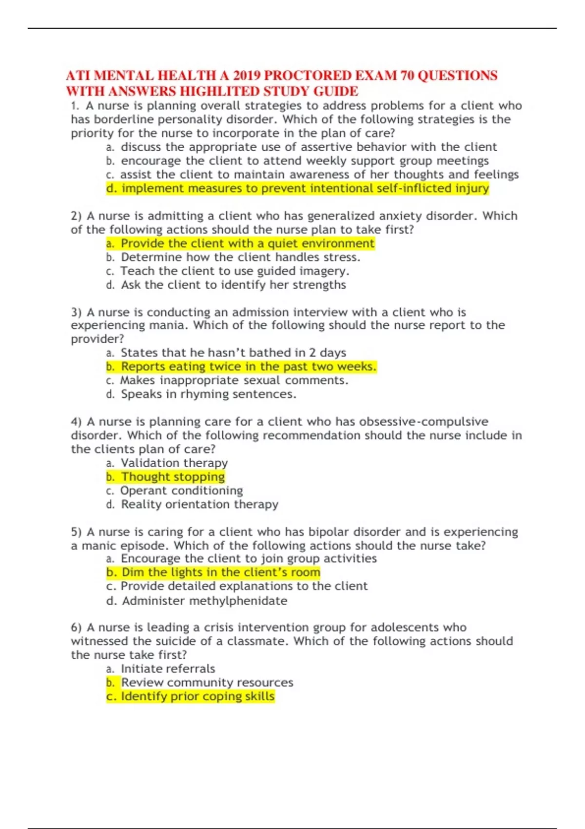 ATI MENTAL HEALTH A 2023 PROCTORED EXAM 70+ QUESTIONS WITH ANSWERS|A GRADE|VERIFIED