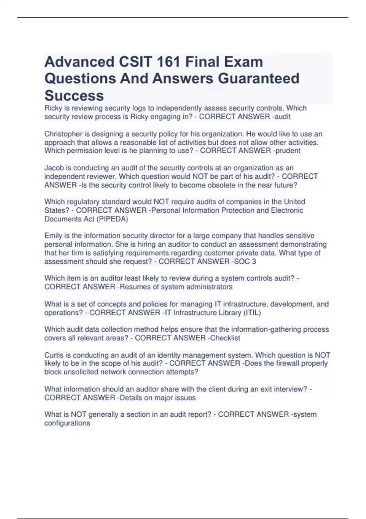 Advanced CSIT 161 Final Exam Questions And Answers Guaranteed Success Ricky is reviewing security logs to independently assess security controls. Which security review process is Ricky engaging in? - CORRECT ANSWER -audit Christopher is designing a security policy for his organization. He would like to use an approach that allows a reasonable list of activities but does not allow other activities. Which permission level is he planning to use? - CORRECT ANSWER -prudent Jacob is conducting an audit of the security controls at an organization as an independent reviewer. Which question would NOT be part of his audit? - CORRECT ANSWER -Is the security control likely to become obsolete in the near future? Which regulatory standard would NOT require audits of companies in the United States? - CORRECT ANSWER -Personal Information Protection and Electronic Documents Act (PIPEDA) Emily is the information security director for a large company that handles sensitive personal information. She is hiring an auditor to conduct an assessment demonstrating that her firm is satisfying requirements regarding customer private data. What type of assessment should she request? - CORRECT ANSWER -SOC 3 Which item is an auditor least likely to review during a system controls audit? - CORRECT ANSWER -Resumes of system administrators What is a set of concepts and policies for managing IT infrastructure, development, and operations? - CORRECT ANSWER -IT Infrastructure Library (ITIL) Which audit data collection method helps ensure that the information-gathering process covers all relevant areas? - CORRECT ANSWER -Checklist Curtis is conducting an audit of an identity management system. Which question is NOT likely to be in the scope of his audit? - CORRECT ANSWER -Does the firewall properly block unsolicited network connection attempts? What information should an auditor share with the client during an exit interview? - CORRECT ANSWER -Details on major issues What is NOT generally a section in an audit report? - CORRECT ANSWER -system configurations