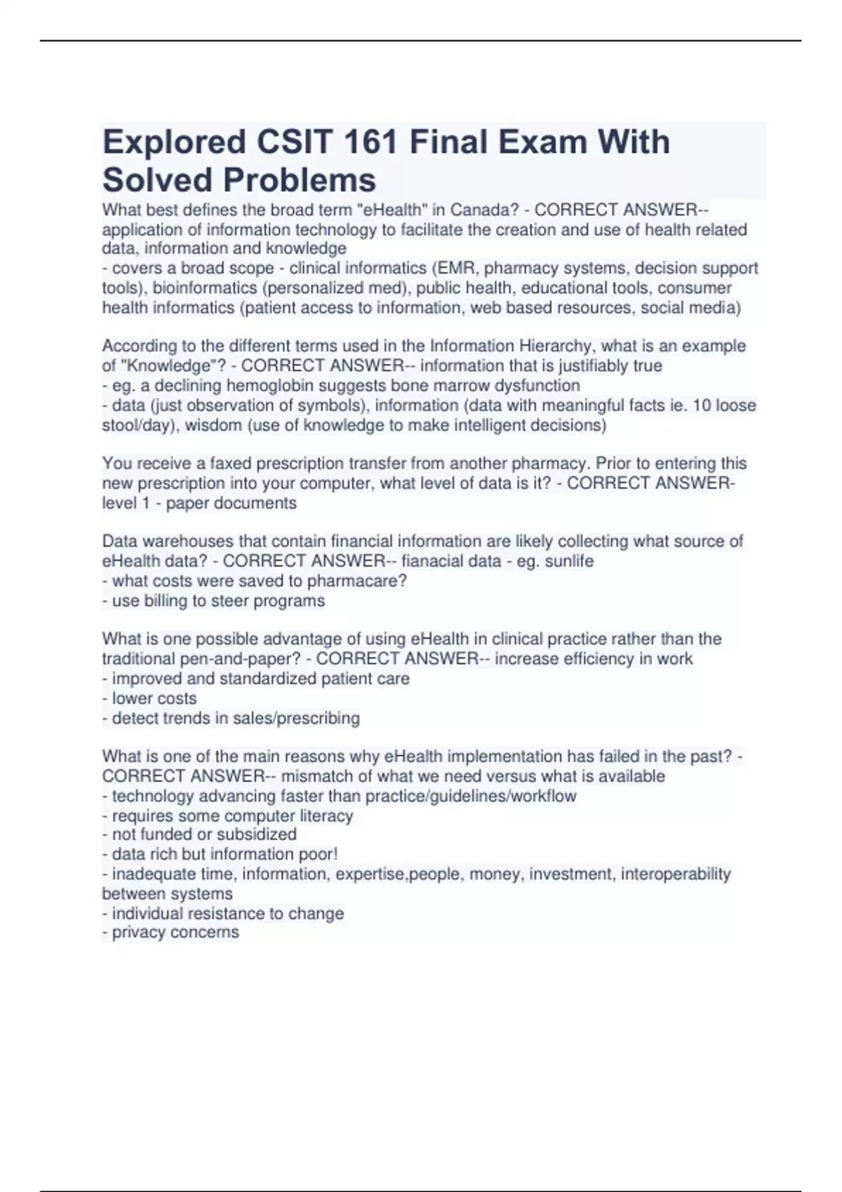 Explored CSIT 161 Final Exam With Solved Problems What best defines the broad term "eHealth" in Canada? - CORRECT ANSWER-- application of information technology to facilitate the creation and use of health related data, information and knowledge - covers a broad scope - clinical informatics (EMR, pharmacy systems, decision support tools), bioinformatics (personalized med), public health, educational tools, consumer health informatics (patient access to information, web based resources, social media) According to the different terms used in the Information Hierarchy, what is an example of "Knowledge"? - CORRECT ANSWER-- information that is justifiably true - eg. a declining hemoglobin suggests bone marrow dysfunction - data (just observation of symbols), information (data with meaningful facts ie. 10 loose stool/day), wisdom (use of knowledge to make intelligent decisions) You receive a faxed prescription transfer from another pharmacy. Prior to entering this new prescription into your computer, what level of data is it? - CORRECT ANSWERlevel 1 - paper documents Data warehouses that contain financial information are likely collecting what source of eHealth data? - CORRECT ANSWER-- fianacial data - eg. sunlife - what costs were saved to pharmacare? - use billing to steer programs What is one possible advantage of using eHealth in clinical practice rather than the traditional pen-and-paper? - CORRECT ANSWER-- increase efficiency in work - improved and standardized patient care - lower costs - detect trends in sales/prescribing What is one of the main reasons why eHealth implementation has failed in the past? - CORRECT ANSWER-- mismatch of what we need versus what is available - technology advancing faster than practice/guidelines/workflow - requires some computer literacy - not funded or subsidized - data rich but information poor! - inadequate time, information, expertise,people, money, investment, interoperability between systems - individual resistance to change - privacy concerns