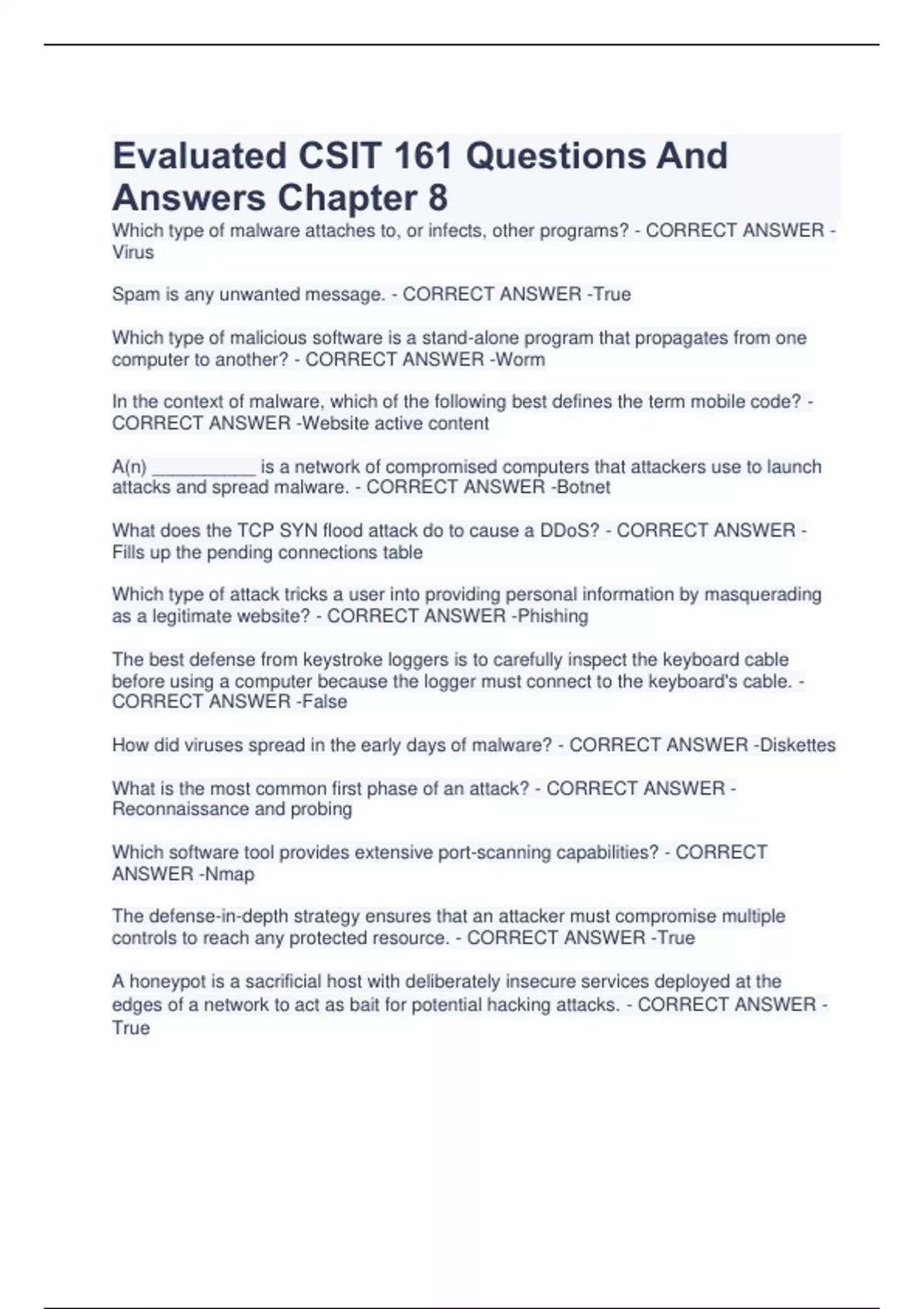 Evaluated CSIT 161 Questions And Answers Chapter 8 Which type of malware attaches to, or infects, other programs? - CORRECT ANSWER - Virus Spam is any unwanted message. - CORRECT ANSWER -True Which type of malicious software is a stand-alone program that propagates from one computer to another? - CORRECT ANSWER -Worm In the context of malware, which of the following best defines the term mobile code? - CORRECT ANSWER -Website active content A(n) __________ is a network of compromised computers that attackers use to launch attacks and spread malware. - CORRECT ANSWER -Botnet What does the TCP SYN flood attack do to cause a DDoS? - CORRECT ANSWER - Fills up the pending connections table Which type of attack tricks a user into providing personal information by masquerading as a legitimate website? - CORRECT ANSWER -Phishing The best defense from keystroke loggers is to carefully inspect the keyboard cable before using a computer because the logger must connect to the keyboard's cable. - CORRECT ANSWER -False How did viruses spread in the early days of malware? - CORRECT ANSWER -Diskettes What is the most common first phase of an attack? - CORRECT ANSWER - Reconnaissance and probing Which software tool provides extensive port-scanning capabilities? - CORRECT ANSWER -Nmap The defense-in-depth strategy ensures that an attacker must compromise multiple controls to reach any protected resource. - CORRECT ANSWER -True A honeypot is a sacrificial host with deliberately insecure services deployed at the edges of a network to act as bait for potential hacking attacks. - CORRECT ANSWER - True