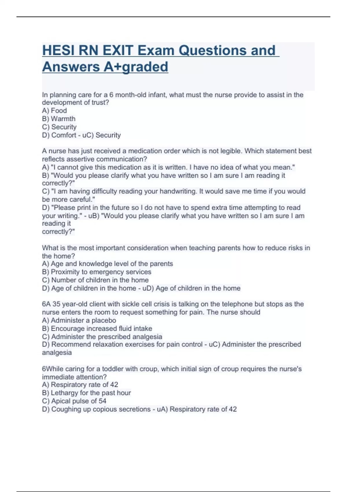 In planning care for a 6 month-old infant, what must the nurse provide to assist in the development of trust? A) Food B) Warmth C) Security D) Comfort - uC) Security A nurse has just received a medication order which is not legible. Which statement best reflects assertive communication? A) "I cannot give this medication as it is written. I have no idea of what you mean." B) "Would you please clarify what you have written so I am sure I am reading it correctly?" C) "I am having difficulty reading your handwriting. It would save me time if you would be more careful." D) "Please print in the future so I do not have to spend extra time attempting to read your writing." - uB) "Would you please clarify what you have written so I am sure I am reading it correctly?" What is the most important consideration when teaching parents how to reduce risks in the home? A) Age and knowledge level of the parents B) Proximity to emergency services C) Number of children in the home D) Age of children in the home - uD) Age of children in the home 6A 35 year-old client with sickle cell crisis is talking on the telephone but stops as the nurse enters the room to request something for pain. The nurse should A) Administer a placebo B) Encourage increased fluid intake C) Administer the prescribed analgesia D) Recommend relaxation exercises for pain control - uC) Administer the prescribed analgesia 6While caring for a toddler with croup, which initial sign of croup requires the nurse's immediate attention? A) Respiratory rate of 42 B) Lethargy for the past hour C) Apical pulse of 54 D) Coughing up copious secretions - uA) Respiratory rate of 42 6A client is admitted with low T3 and T4 levels and an elevated TSH level. On initial assessment, the nurse would anticipate which of the following assessment findings? A) Lethargy B) Heat intolerance C) Diarrhea D) Skin eruptions - uA) Lethargy 6The emergency room nurse admits a child who experienced a seizure at school. The father comments that this is the first occurrence, and denies any family history of epilepsy. What is the best response by the nurse? A) "Do not worry. Epilepsy can be treated with medications." B) "The seizure may or may not mean your child has epilepsy." C) "Since this was the first convulsion, it may not happen again." D) "Long term treatment will prevent future seizures." - uB) "The seizure may or may not mean your child has epilepsy." 6Alcohol and drug abuse impairs judgment and increases risk taking behavior. What nursing diagnosis best applies? A) Risk for injury B) Risk for knowledge deficit C) Altered thought process D) Disturbance in self-esteem - uA) Risk for injury 6Which these findings would the nurse more closely associate with anemia in a 10 month-old infant? A) Hemoglobin level of 12 g/dI B) Pale mucosa of the eyelids and lips C) Hypoactivity D) A heart rate between 140 to 160 - uB) Pale mucosa of the eyelids and lips 6The nurse is caring for a client in hypertensive crisis in an intensive care unit. The priority assessment in the first hour of care is A) Heart rate B) Pedal pulses C) Lung sounds D) Pupil responses - uD) Pupil responses 6Which of these clients who are all in the terminal stage of cancer is least appropriate to suggest the use of patient controlled analgesia (PCA) with a pump? A) A young adult with a history of Down's syndrome B) A teenager who reads at a 4th grade level C) An elderly client with numerous arthritic nodules on the hands D) A preschooler with intermittent episodes of alertness - uD) A preschooler with intermittent episodes of alertness 6The nurse is about to assess a 6 month-old child with nonorganic failure-to thrive (NOFTT). Upon entering the room, the nurse would expect the baby to be A) Irritable and "colicky" with no attempts to pull to standing B) Alert, laughing and playing with a rattle, sitting with support C) Skin color dusky with poor skin turgor over abdomen D) Pale, thin arms and legs, uninterested in surroundings - uD) Pale, thin arms and legs, uninterested in surroundings 6As the nurse is speaking with a group of teens which of these side effects of chemotherapy for cancer would the nurse expect this group to be more interested in during the discussion? A) Mouth sores B) Fatigue C) Diarrhea D) Hair loss - uD) Hair loss 6While caring for a client who was admitted with myocardial infarction (MI) 2 days ago, the nurse notes today's temperature is 101.1 degrees Fahrenheit (38.5 degreesCelsius). The appropriate nursing intervention is to A) Call the health care provider immediately B) Administer acetaminophen as ordered as this is normal at this time C) Send blood, urine and sputum for culture D) Increase the client's fluid intake - uB) Administer acetaminophen as ordered as this is normal at this time 6A client is admitted for first and second degree burns on the face, neck, anterior chest and hands. The nurse's priority should be A) Cover the areas with dry sterile dressings B) Assess for dyspnea or stridor C) Initiate intravenous therapy D) Administer pain medication - uB) Assess for dyspnea or stridor 6Which of these clients who call the community health clinic would the nurse ask to come in that day to be seen by the health care provider? A) I started my period and now my urine has turned bright red. B) I am an diabetic and today I have been going to the bathroom every hour. C) I was started on medicine yesterday for a urine infection. Now my lower belly hurts when I go to the bathroom. D) I went to the bathroom and my urine looked very red and it didn't hurt when I went. - uD) I went to the bathroom and my urine looked very red and it didn't hurt when I went. 6Which of these parents' comment for a newborn would most likely reveal an initial finding of a suspected pyloric stenosis? A) I noticed a little lump a little above the belly button. B) The baby seems hungry all the time. C) Mild vomiting that progressed to vomiting sh