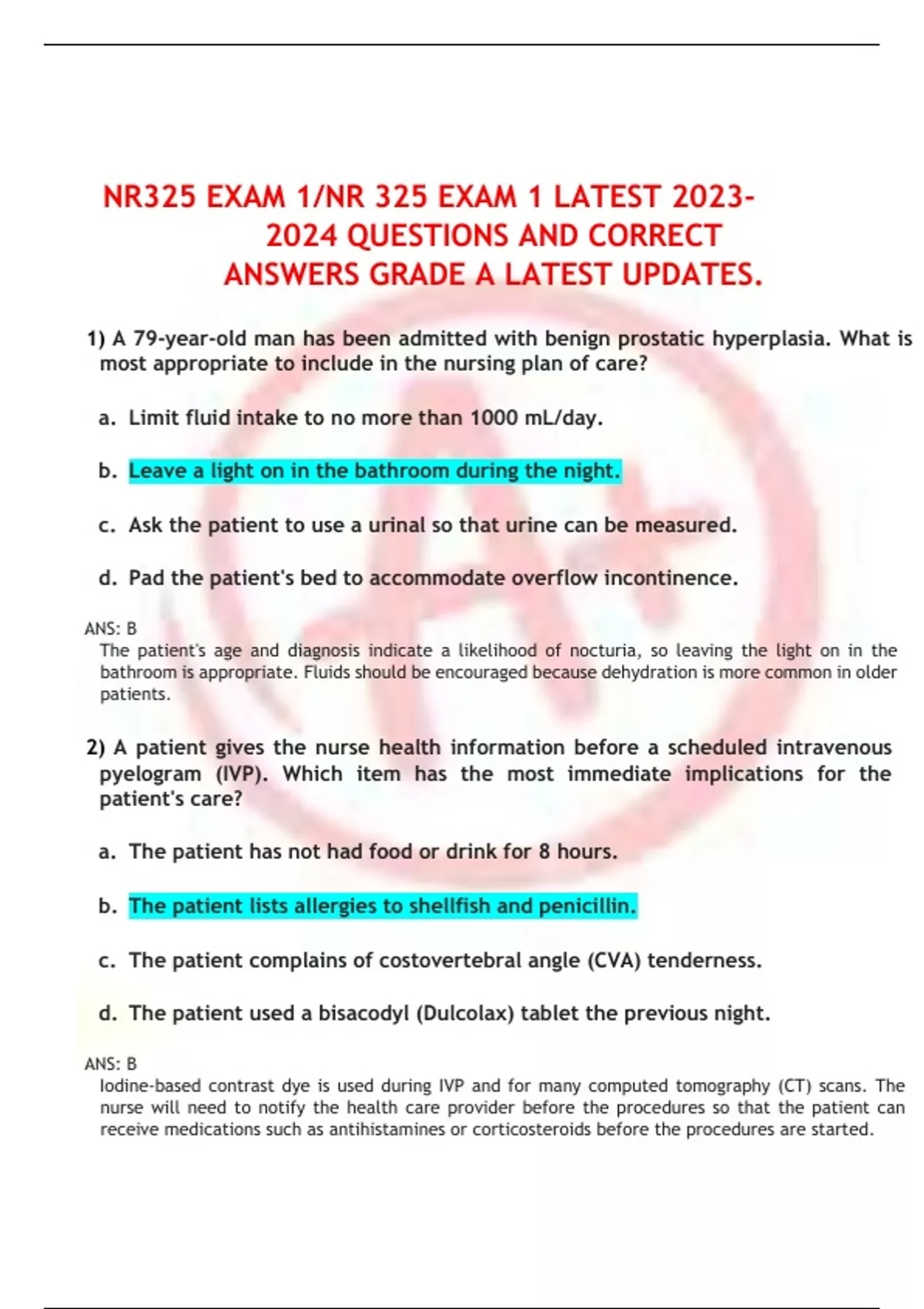 NR325 EXAM 1/NR 325 EXAM 1 LATEST 2023- 2024 QUESTIONS AND CORRECT ANSWERS GRADE A LATEST UPDATES. 1) A 79-year-old man has been admitted with benign prostatic hyperplasia. What is most appropriate to include in the nursing plan of care? a. Limit fluid intake to no more than 1000 mL/day. b. Leave a light on in the bathroom during the night. c. Ask the patient to use a urinal so that urine can be measured. d. Pad the patient's bed to accommodate overflow incontinence. ANS: B The patient's age and diagnosis indicate a likelihood of nocturia, so leaving the light on in the bathroom is appropriate. Fluids should be encouraged because dehydration is more common in older patients. 2) A patient gives the nurse health information before a scheduled intravenous pyelogram (IVP). Which item has the most immediate implications for the patient's care? a. The patient has not had food or drink for 8 hours. b. The patient lists allergies to shellfish and penicillin. c. The patient complains of costovertebral angle (CVA) tenderness. d. The patient used a bisacodyl (Dulcolax) tablet the previous night. ANS: B Iodine-based contrast dye is used during IVP and for many computed tomography (CT) scans. The nurse will need to notify the health care provider before the procedures so that the patient can receive medications such as antihistamines or corticosteroids before the procedures are started. 3) A patient passing bloody urine is scheduled for a cystoscopy with cystogram. Which description of the procedure by the nurse is accurate? a. "Your doctor will place a catheter into an artery in your groin and inject a dye that will visualize the blood supply to the kidneys." b. "Your doctor will insert a lighted tube into the bladder, and little catheters will be inserted through the tube into your kidney." c. "Your doctor will insert a lighted tube into the bladder through your urethra, inspect the bladder, and instill a dye that will outline your bladder on x-ray." d. "Your doctor will inject a radioactive solution into a vein in your arm and the distribution of the isotope in your kidneys and bladder will be checked." ANS: C In a cystoscope and cystogram procedure, a cystoscope is inserted into the bladder for direct visualization, and then contrast solution is injected through the scope so that x-rays can be taken. 4) Which nursing action is essential for a patient immediately after a renal biopsy? a. Check blood glucose to assess for hyperglycemia or hypoglycemia. b. Insert a urinary catheter and test urine for gross or microscopic hematuria. c. Monitor the blood urea nitrogen (BUN) and creatinine to assess renal function. d. Apply a pressure dressing and keep the patient on the affected side for 30 minutes. ANS: D A pressure dressing is applied and the patient is kept on the affected side for 30 to 60 minutes to put pressure on the biopsy side and decrease the risk for bleeding. 5) Which assessment of a 62-year-old patient who has just had an intravenous pyelogram (IVP) requires immediate action by the nurse? a. The heart rate is 58 beats/minute. b. The patient complains of a dry mouth. c. The respiratory rate is 38 breaths/minute. d. The urine output is 400 mL after 2 hours. ANS: C The increased respiratory rate indicates that the patient may be experiencing an allergic reaction to the contrast medium used during the procedure. The nurse should immediately assess the patient's oxygen saturation and breath sounds. 6) Which statement by a nurse to a patient newly diagnosed with type 2 diabetes is correct? a. Insulin is not used to control blood glucose in patients with type 2 diabetes. b. Complications of type 2 diabetes are less serious than those of type 1 di