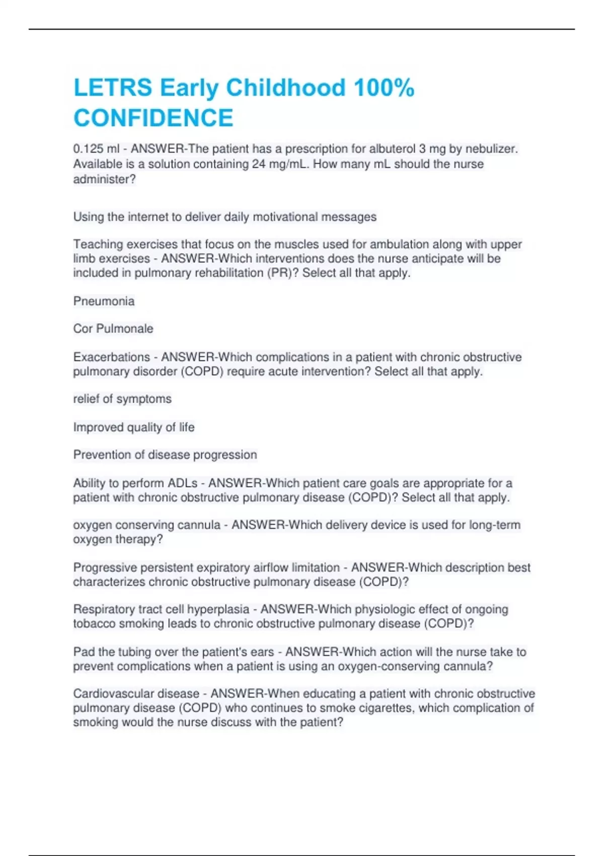 LETRS Early Childhood 100% CONFIDENCE 0.125 ml - ANSWER-The patient has a prescription for albuterol 3 mg by nebulizer. Available is a solution containing 24 mg/mL. How many mL should the nurse administer? Using the internet to deliver daily motivational messages Teaching exercises that focus on the muscles used for ambulation along with upper limb exercises - ANSWER-Which interventions does the nurse anticipate will be included in pulmonary rehabilitation (PR)? Select all that apply. Pneumonia Cor Pulmonale Exacerbations - ANSWER-Which complications in a patient with chronic obstructive pulmonary disorder (COPD) require acute intervention? Select all that apply. relief of symptoms Improved quality of life Prevention of disease progression Ability to perform ADLs - ANSWER-Which patient care goals are appropriate for a patient with chronic obstructive pulmonary disease (COPD)? Select all that apply. oxygen conserving cannula - ANSWER-Which delivery device is used for long-term oxygen therapy? Progressive persistent expiratory airflow limitation - ANSWER-Which description best characterizes chronic obstructive pulmonary disease (COPD)? Respiratory tract cell hyperplasia - ANSWER-Which physiologic effect of ongoing tobacco smoking leads to chronic obstructive pulmonary disease (COPD)? Pad the tubing over the patient's ears - ANSWER-Which action will the nurse take to prevent complications when a patient is using an oxygen-conserving cannula? Cardiovascular disease - ANSWER-When educating a patient with chronic obstructive pulmonary disease (COPD) who continues to smoke cigarettes, which complication of smoking would the nurse discuss with the patient? Ankle edema - ANSWER-When caring for a patient diagnosed with cor pulmonale, which finding will the nurse expect? Hypoxia has stimulated erythropoiesis. - ANSWER-Which explanation is likely when the nurse notes a hemoglobin level of 20 g/dL in a patient admitted with chronic obstructive pulmonary disease (COPD)? Allows more room for normal alveoli to expand - ANSWER-Which is the purpose of lung reduction surgery for the patient with chronic obstructive pulmonary disease (COPD)? A chronic, intermittent cough - ANSWER-Which of these is a clinical manifestation of early chronic obstructive pulmonary disease (COPD)? Pseudomonas aeruginosa - ANSWER-Which is the most common organism found in heated nebulizers used for humidification during oxygen administration? B2 agonists - ANSWER-Which treatment may increase restlessness and insomnia in a patient with chronic obstructive pulmonary disease (COPD)? 5 - ANSWER-How many minutes is the appropriate recovery period after activity for the patient with chronic obstructive pulmonary disease (COPD)? Rinse the mouth with water after the second puff of medication. - ANSWER-Which method of oral care helps to prevent oral infection for the patient who is taking fluticasone? 1.5 tablets - ANSWER-The patient has a prescription to receive 600 mg of guaifenesin every four hours PRN. Available are 400-mg tablets. How many tablets should the nurse prepare to give? Choose the optimal oxygen device. Assess the need to adjust the oxygen flow rate Monitor for signs of adverse effects of oxygen therapy - ANSWER-Which nursing actions will be included for a patient with chronic obstructive pulmonary disease (COPD) who is receiving oxygen therapy through a mask? Select all that apply. Remember to think about steps and breathing while walking - ANSWER-Which measure should a patient with chronic obstructive pulmonary disorder (COPD) take when performing physical activity? 1.Sit up with feet on the floor. 2. Inhale slowly through the mouth. 3.Hold breath for 2 to 3 seconds. 4.Exhale quickly as if fogging up a mirror. - ANSWER-The nurse is teaching a patient with chronic obstructive pulmonary disease how to huff cough to move s