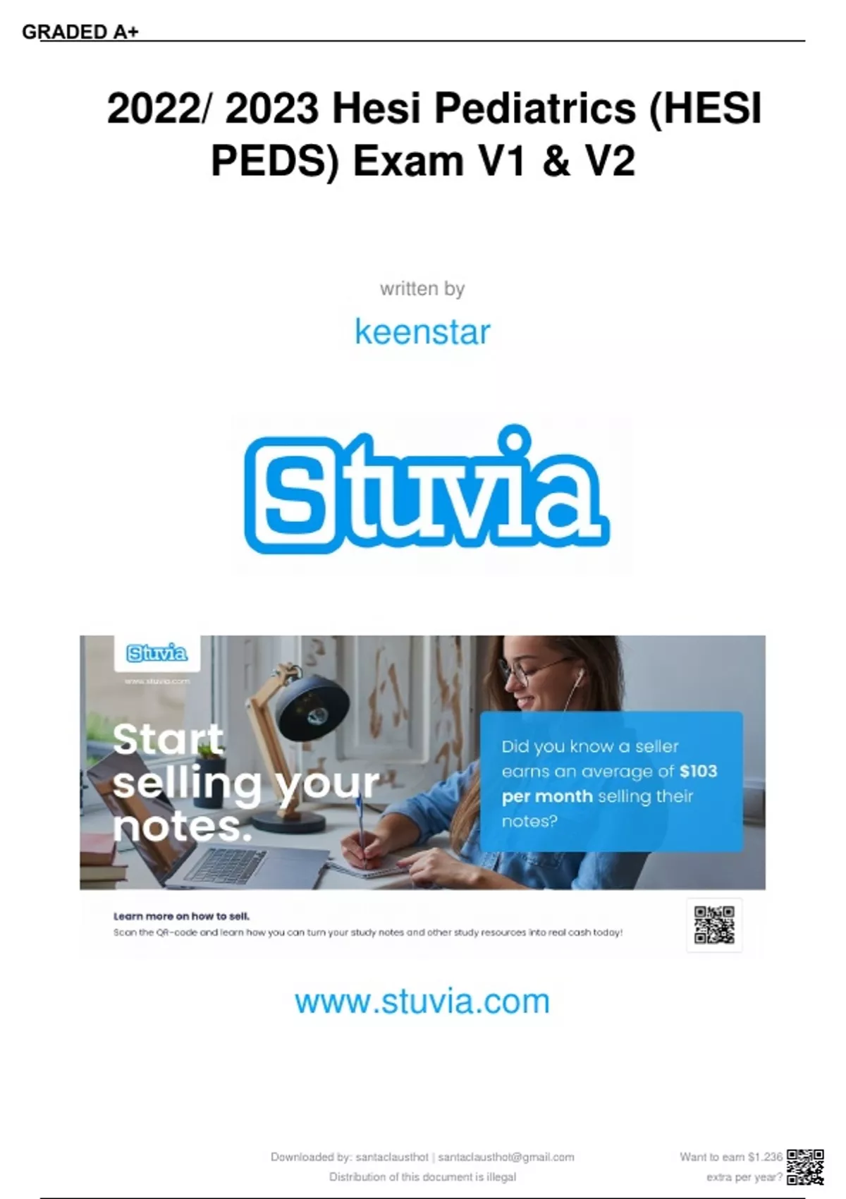 2022/ 2023 Hesi Pediatrics (HESI PEDS) Exam V1 & V2: Brand New Q&A + Actual Pics Included!! Grade A+ Guaranteed!! S - The Marketplace to Buy and Sell your Study Material Downloaded by: santaclausthot | Distribution of this document is illegal Want to earn $1.236 extra per year? GRADED A+ S - The Marketplace to Buy and Sell your Study Material S - The Marketplace to Buy and Sell your Study Material 2022/2023 HESI Pediatric (PEDS) RN Exit Exam: V1 & V2 Screenshots & Q&A Happy Studying!