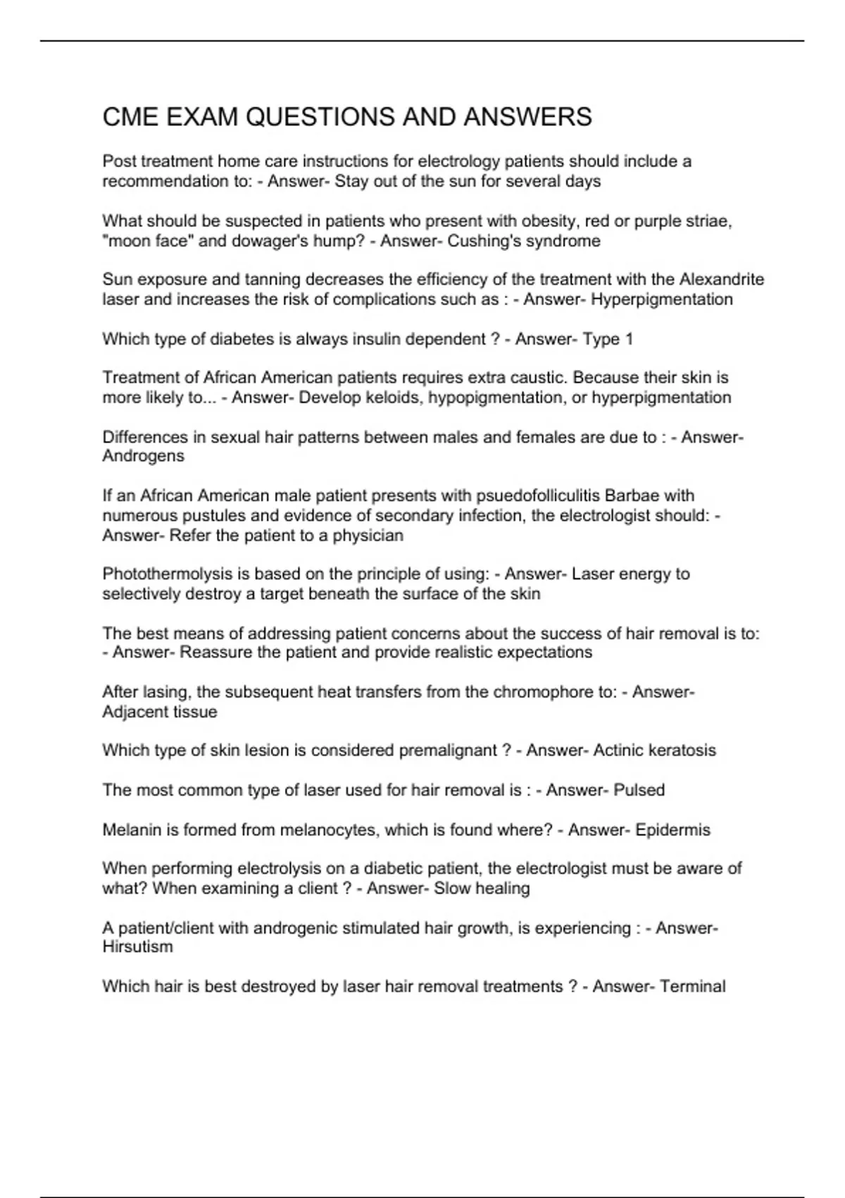 Post treatment home care instructions for electrology patients should include a recommendation to: - Answer- Stay out of the sun for several days What should be suspected in patients who present with obesity, red or purple striae, "moon face" and dowager's hump? - Answer- Cushing's syndrome Sun exposure and tanning decreases the efficiency of the treatment with the Alexandrite laser and increases the risk of complications such as : - Answer- Hyperpigmentation Which type of diabetes is always insulin dependent ? - Answer- Type 1 Treatment of African American patients requires extra caustic. Because their skin is more likely to... - Answer- Develop keloids, hypopigmentation, or hyperpigmentation Differences in sexual hair patterns between males and females are due to : - Answer- Androgens If an African American male patient presents with psuedofolliculitis Barbae with numerous pustules and evidence of secondary infection, the electrologist should: - Answer- Refer the patient to a physician Photothermolysis is based on the principle of using: - Answer- Laser energy to selectively destroy a target beneath the surface of the skin The best means of addressing patient concerns about the success of hair removal is to: - Answer- Reassure the patient and provide realistic expectations After lasing, the subsequent heat transfers from the chromophore to: - Answer- Adjacent tissue Which type of skin lesion is considered premalignant ? - Answer- Actinic keratosis The most common type of laser used for hair removal is : - Answer- Pulsed Melanin is formed from melanocytes, which is found where? - Answer- Epidermis When performing electrolysis on a diabetic patient, the electrologist must be aware of what? When examining a client ? - Answer- Slow healing