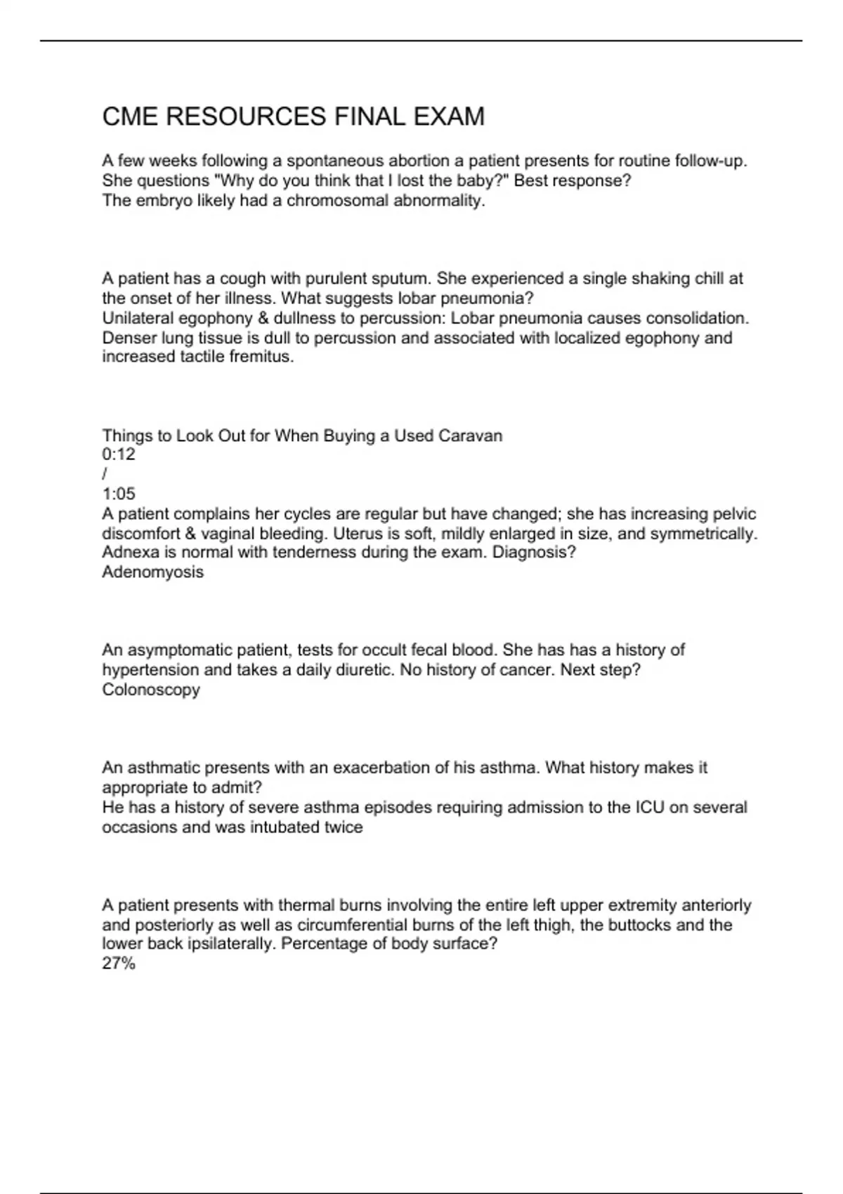 A few weeks following a spontaneous abortion a patient presents for routine follow-up. She questions "Why do you think that I lost the baby?" Best response? The embryo likely had a chromosomal abnormality. A patient has a cough with purulent sputum. She experienced a single shaking chill at the onset of her illness. What suggests lobar pneumonia? Unilateral egophony & dullness to percussion: Lobar pneumonia causes consolidation. Denser lung tissue is dull to percussion and associated with localized egophony and increased tactile fremitus. Things to Look Out for When Buying a Used Caravan 0:12 / 1:05 A patient complains her cycles are regular but have changed; she has increasing pelvic discomfort & vaginal bleeding. Uterus is soft, mildly enlarged in size, and symmetrically. Adnexa is normal with tenderness during the exam. Diagnosis? Adenomyosis An asymptomatic patient, tests for occult fecal blood. She has has a history of hypertension and takes a daily diuretic. No history of cancer. Next step? Colonoscopy An asthmatic presents with an exacerbation of his asthma. What history makes it appropriate to admit? He has a history of severe asthma episodes requiring admission to the ICU on several occasions and was intubated twice A patient presents with thermal burns involving the entire left upper extremity anteriorly and posteriorly as well as circumferential burns of the left thigh, the buttocks and the lower back ipsilaterally. Percentage of body surface? 27%