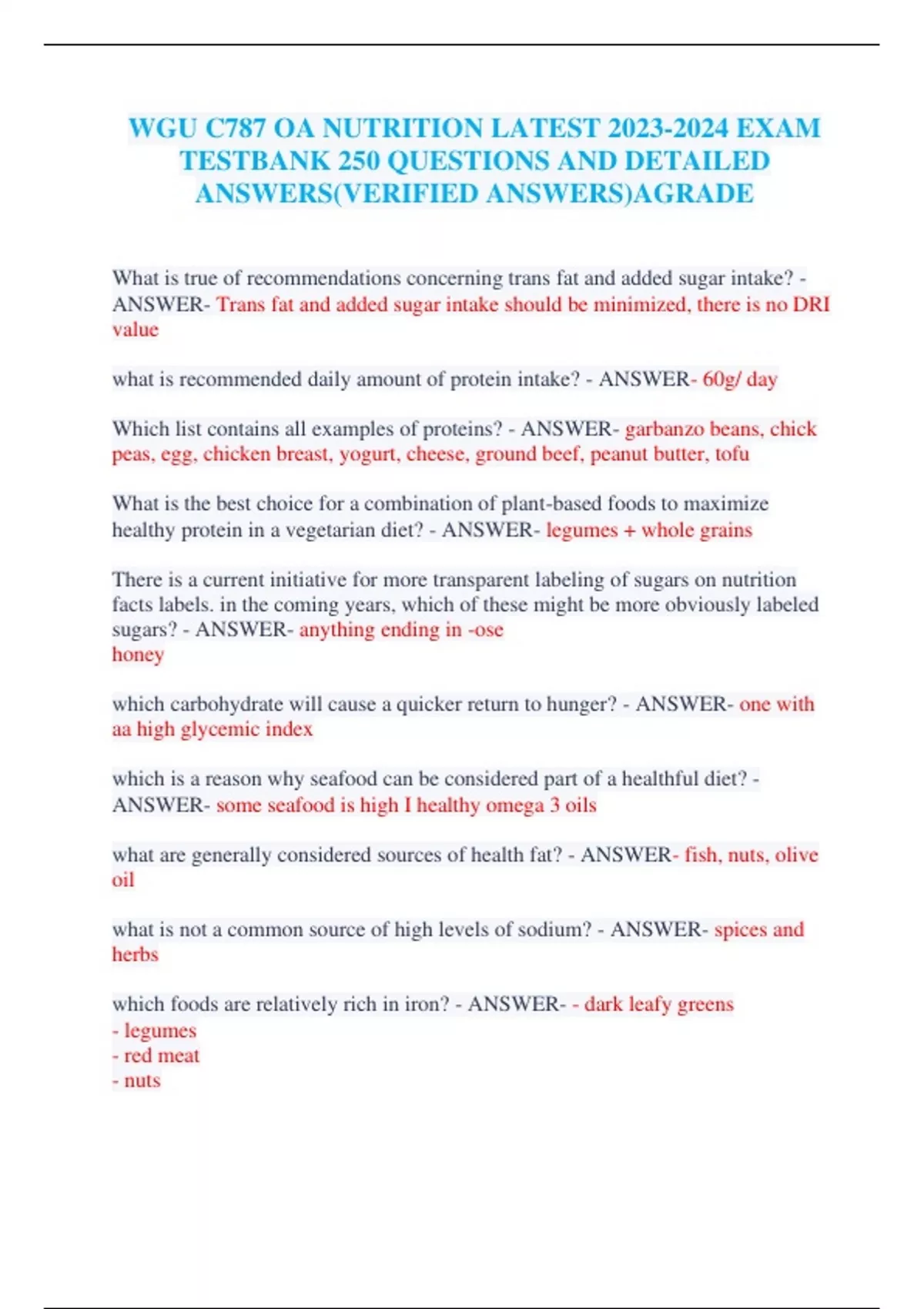 WGU C787 OA NUTRITION LATEST EXAM TESTBANK 250 QUESTIONS AND DETAILED ANSWERS(VERIFIED ANSWERS)AGRADE