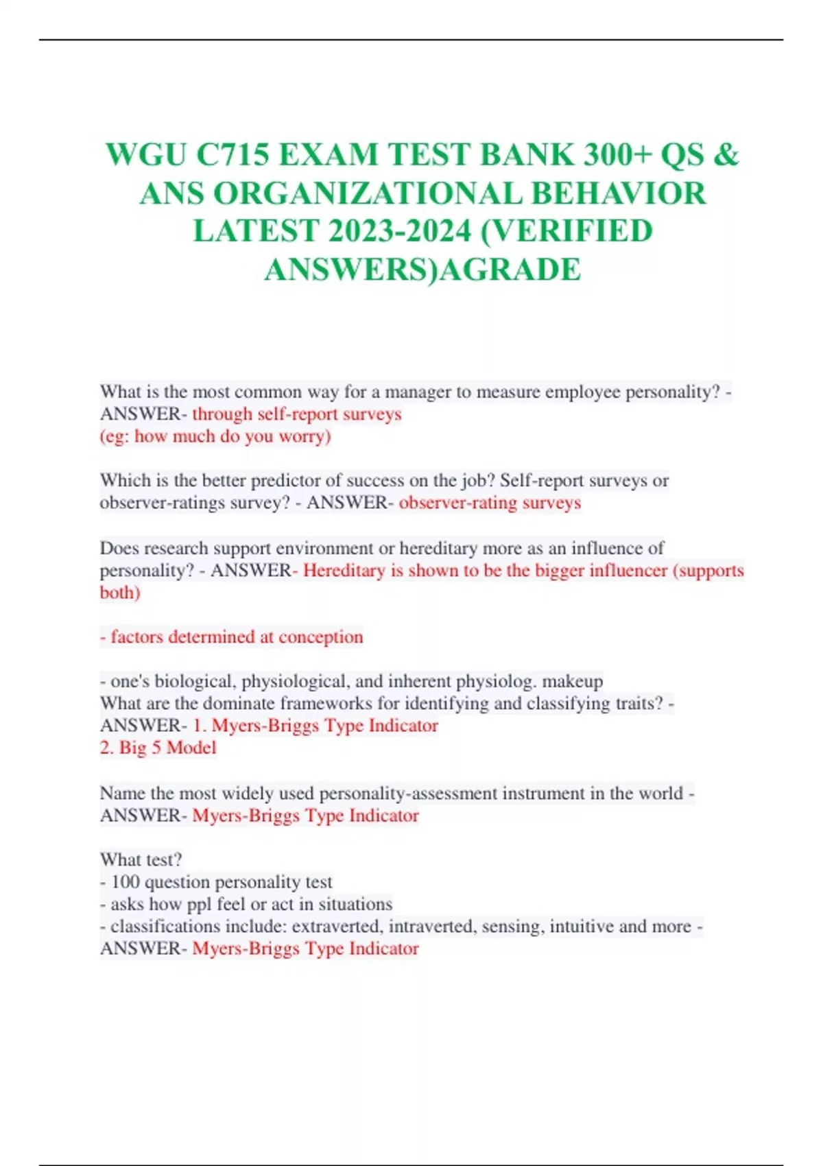 WGU C715 EXAM TEST BANK 300+ QS & ANS ORGANIZATIONAL BEHAVIOR LATEST (VERIFIED ANSWERS)AGRADE