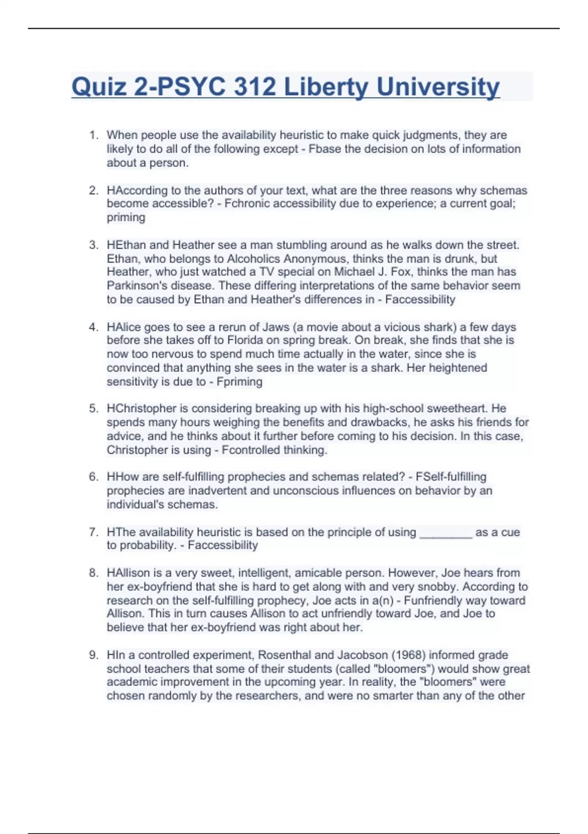 1. When people use the availability heuristic to make quick judgments, they are likely to do all of the following except - Fbase the decision on lots of information about a person. 2. HAccording to the authors of your text, what are the three reasons why schemas become accessible? - Fchronic accessibility due to experience; a current goal; priming 3. HEthan and Heather see a man stumbling around as he walks down the street. Ethan, who belongs to Alcoholics Anonymous, thinks the man is drunk, but Heather, who just watched a TV special on Michael J. Fox, thinks the man has Parkinson's disease. These differing interpretations of the same behavior seem to be caused by Ethan and Heather's differences in - Faccessibility 4. HAlice goes to see a rerun of Jaws (a movie about a vicious shark) a few days before she takes off to Florida on spring break. On break, she finds that she is now too nervous to spend much time actually in the water, since she is convinced that anything she sees in the water is a shark. Her heightened sensitivity is due to - Fpriming 5. HChristopher is considering breaking up with his high-school sweetheart. He spends many hours weighing the benefits and drawbacks, he asks his friends for advice, and he thinks about it further before coming to his decision. In this case, Christopher is using - Fcontrolled thinking. 6. HHow are self-fulfilling prophecies and schemas related? - FSelf-fulfilling prophecies are inadvertent and unconscious influences on behavior by an individual's schemas. 7. HThe availability heuristic is based on the principle of using ________ as a cue to probability. - Faccessibility 8. HAllison is a very sweet, intelligent, amicable person. However, Joe hears from her ex-boyfriend that she is hard to get along with and very snobby. According to research on the self-fulfilling prophecy, Joe acts in a(n) - Funfriendly way toward Allison. This in turn causes Allison to act unfriendly toward Joe, and Joe to believe that her ex-boyfriend was right about her. 9. HIn a controlled experiment, Rosenthal and Jacobson (1968) informed grade school teachers that some of their students (called "bloomers") would show great academic improvement in the upcoming year. In reality, the "bloomers" were chosen randomly by the researchers, and were no smarter than any of the other students. Which of the following best describes the results of this study? At the end of the year, - Fbloomers improved more on an IQ test than did non-bloomers. 10. HAccording to the perspective presented in Chapter 3 (Social Cognition), a person who grew up in a home with an alcoholic parent who sees a man acting in a somewhat strange manner may be ________ likely to interpret this behavior as due to alcohol because of ________. - Fmore; chronic accessibility of an alcoholic schema 11. HWhich of the following is not an example of automatic thinking? - Fconducting a search on the Internet 12. HWhen people use information about the relative frequency of members of different categories in the population to make judgments (e.g., percentage of students who are psychology majors), they are using - Fbase rate information. 13. HYou are listening to a radio broadcast which describes a person who donated a kidney to a complete stranger in need of a transplant, when the phone rings and the fireman's association asks you to make a donation. The idea of priming suggests that you will - Fbe more likely to make a donation because the schema of being charitable has been made more accessible. 14. H"You reap what you sow," goes the old adage. This saying is most compatible with the social-psychological concept of - Fbelief in a just world. 15. HThe fundamental attribution error occurs more often in ________ cultures. - FWestern 16. HOne day, Professor Burns came into class and put his briefcase onto the desk in the front of the room. The desk promptly fell apart and the briefcase tumbled to the floor. Because of perceptual salience, what will students be most likely to think? - FProfessor Burn ruined that desk. 17. HTina is very happy in her marriage. She is going to make ________ attributions about the positive behaviors of her spouse. - Finternal 18. HUsing ____, individuals can draw meaningful conclusions about another person's personality or skills based on an extremely brief sample of behavior. - Fthin-slicing 19. HEmma arrived late for her job interview, wore too much cologne, and forgot the interviewer's name. Because of the _____, the interviewer formed a negative _____ of her. - Fprimacy effect; impression 20. HWhen people are distracted, they are more likely to fall prey to the fundamental attribution error. This occurs because internal attributions arise from ________, whereas external attributions arise from ________. - Fautomatic processes; controlled processes 21. HStudents in the United States seldom applaud after a lecture, whereas students in Europe often applaud or rap their knuckles on their desks. This cultural difference reflects the power of ________ to influence nonverbal communication. - Fdisplay rules 22. HAccording to research presented in this chapter, we typically use two steps in making attributions. The first step involves ________, and the second step involves ________. - Fforming an internal attribution; adjusting for the situation 23. HYour sister comes in and announces that she has just gotten engaged to the man she has been dating for the past two months. You feel a mix of surprise, happiness, and concern, and this shows on your face. The expression your face displays is known as a(n) - Faffect blend. 24. H________ information addresses the extent to which an actor behaves in a similar way in response to a stimulus across time and circumstances. - FConsistency