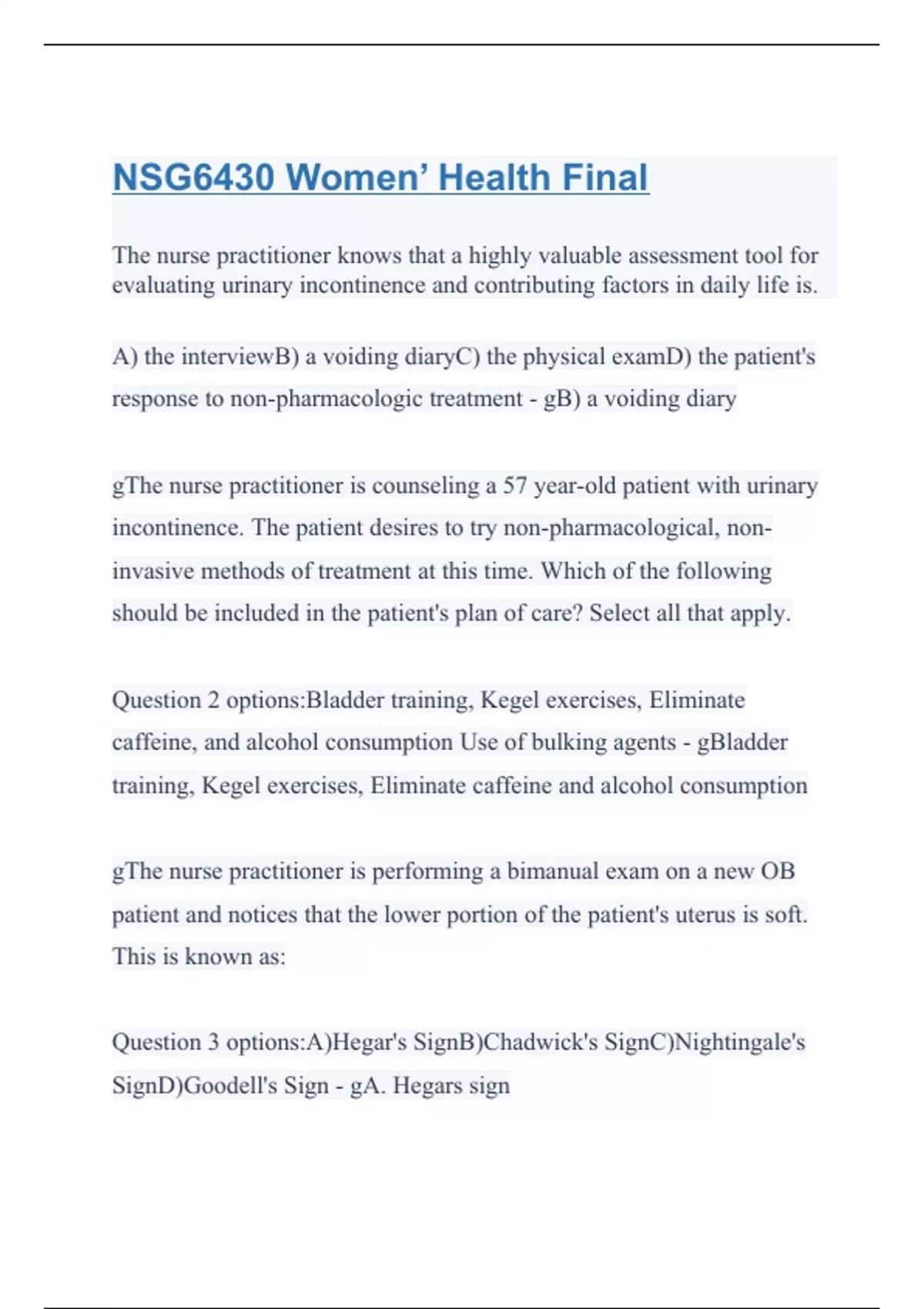 The nurse practitioner knows that a highly valuable assessment tool for evaluating urinary incontinence and contributing factors in daily life is. A) the interviewB) a voiding diaryC) the physical examD) the patient's response to non-pharmacologic treatment - gB) a voiding diary gThe nurse practitioner is counseling a 57 year-old patient with urinary incontinence. The patient desires to try non-pharmacological, non-invasive methods of treatment at this time. Which of the following should be included in the patient's plan of care? Select all that apply. Question 2 options:Bladder training, Kegel exercises, Eliminate caffeine, and alcohol consumption Use of bulking agents - gBladder training, Kegel exercises, Eliminate caffeine and alcohol consumption gThe nurse practitioner is performing a bimanual exam on a new OB patient and notices that the lower portion of the patient's uterus is soft. This is known as: Question 3 options:A)Hegar's SignB)Chadwick's SignC)Nightingale's SignD)Goodell's Sign - gA. Hegars sign gYour female patient presents for vaginal discharge with an odor, and has noticed painless "bumps" on her vaginalarea. Sexual history includes past male partners and her current female partner. On exam you note beefy red papules and an ulcerative lesion on her vulva, granular tissue and scarring, and inguinal adenopathy. You suspectshe has: Question 4 options:A)HSV-2B)Granuloma InguinaleC)ChancroidD)Molluscum Contagiosum - gC. Chancroid gThe physical examination of any woman suspected of being abused or battered includes all of the following except: Question 5 options: A) a thorough inspection for signs of injury, past and present B) a physical assessment just like that of any other adult female C) a focus on the patient's physical appearance, not her behavior D) the use of body maps and diagrams to accurately portray the patient's physical condition - gC) a focus on the patient's physical appearance, not her behavior gThe most effective means of obtaining the history of abuse is to use a communication model that: Question 6 options: