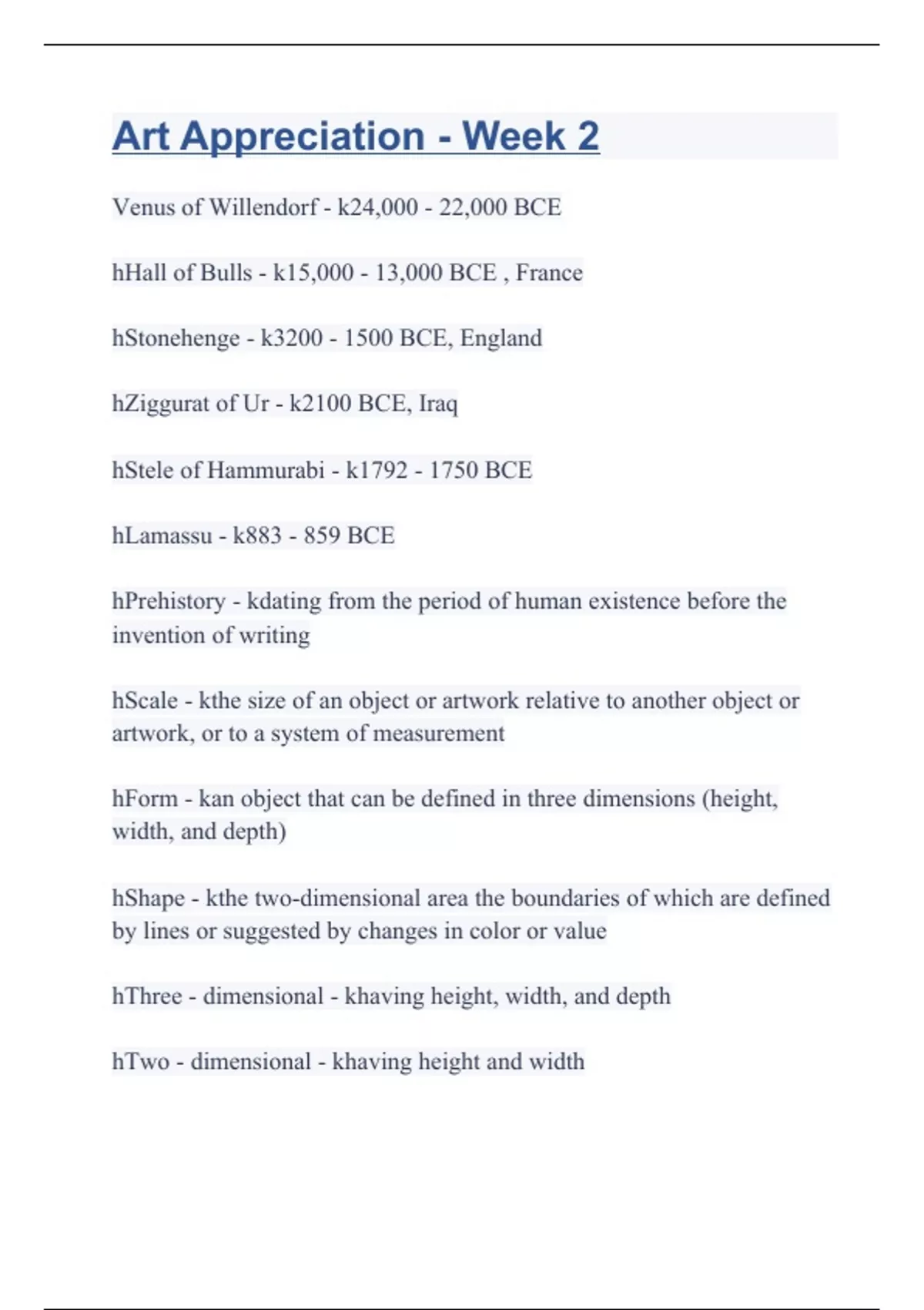 Venus of Willendorf - k24,000 - 22,000 BCE hHall of Bulls - k15,000 - 13,000 BCE , France hStonehenge - k BCE, England hZiggurat of Ur - k2100 BCE, Iraq hStele of Hammurabi - k BCE hLamassu - k883 - 859 BCE hPrehistory - kdating from the period of human existence before the invention of writing hScale - kthe size of an object or artwork relative to another object or artwork, or to a system of measurement hForm - kan object that can be defined in three dimensions (height, width, and depth) hShape - kthe two-dimensional area the boundaries of which are defined by lines or suggested by changes in color or value hThree - dimensional - khaving height, width, and depth hTwo - dimensional - khaving height and width hVolume - kthe space filled or enclosed by a three-dimensional figure or object hMass - ka volume that has, or gives the illusion of having, weight, density, and bulk hMedia - kthe material on or from which an artist chooses to make a work of art, for example canvas and oil paint, marble, engraving, video, or architecture hOrganic form - kan object that can be defined in three dimensions (height, width, and depth) hOutline (Contour line) - kthe outermost line of an object or figure, by which it is defined or bounded hGeometric - kmathematically regular and precise hVENUS : Sculpture - in - the - round (freestanding) - ksculpture that invites us to examine them on all sides hVENUS : Subtractive sculpture method - ka sculptor uses a tool to carve, drill, chisel, chip, whittle, or saw away unwanted material hHALL OF BULLS : Mural - ka painting executed directly on to a wall hHALL OF BULLS : Silhouette - ka portrait or figure represented in outline and solidly colored in hHALL OF BULLS : Twisted perspective - kalso known as composite view: a representation of a figure, part in profile and part frontally