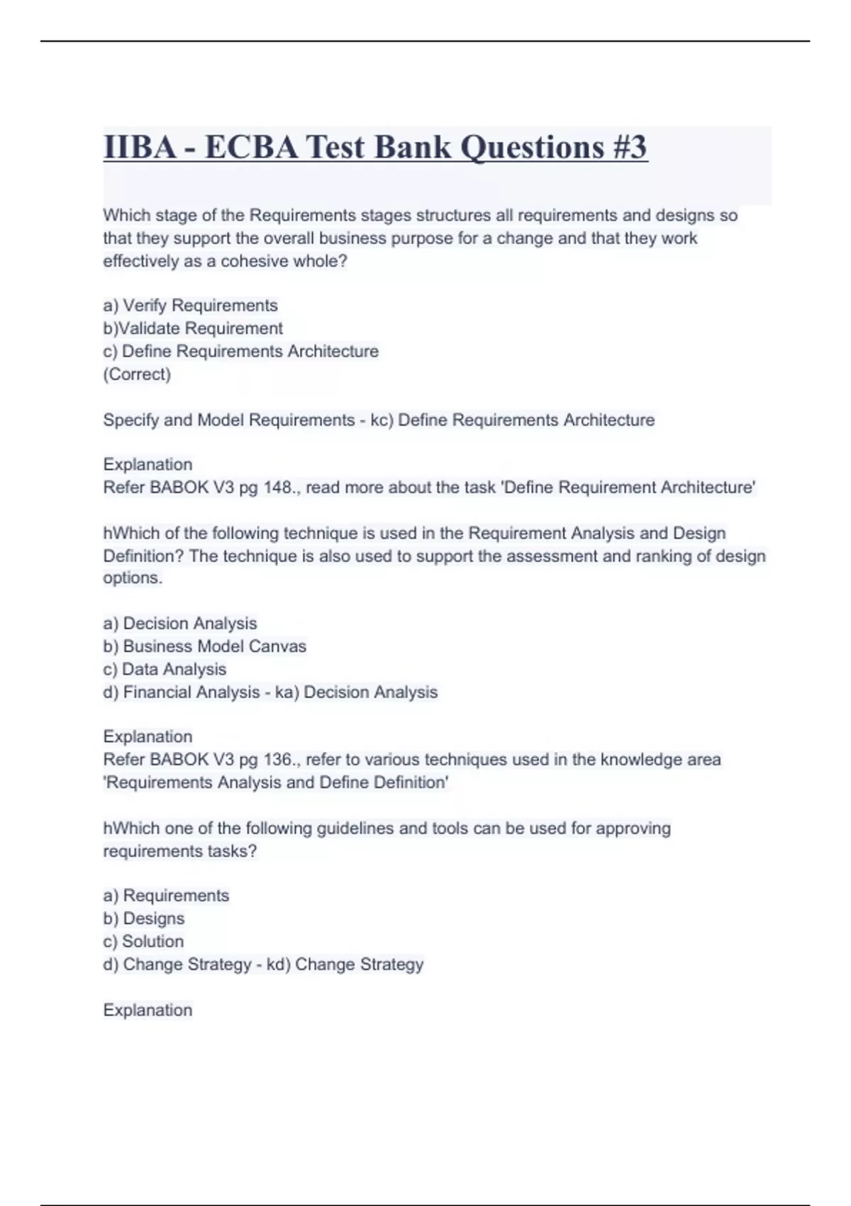 Which stage of the Requirements stages structures all requirements and designs so that they support the overall business purpose for a change and that they work effectively as a cohesive whole? a) Verify Requirements b)Validate Requirement c) Define Requirements Architecture (Correct) Specify and Model Requirements - kc) Define Requirements Architecture Explanation Refer BABOK V3 pg 148., read more about the task 'Define Requirement Architecture' hWhich of the following technique is used in the Requirement Analysis and Design Definition? The technique is also used to support the assessment and ranking of design options. a) Decision Analysis b) Business Model Canvas c) Data Analysis d) Financial Analysis - ka) Decision Analysis Explanation Refer BABOK V3 pg 136., refer to various techniques used in the knowledge area 'Requirements Analysis and Define Definition' hWhich one of the following guidelines and tools can be used for approving requirements tasks? a) Requirements b) Designs c) Solution d) Change Strategy - kd) Change Strategy Explanation Refer BABOK V3 pg 95., read more about the guidelines and tools of the task 'Approve Requirements' hWhich technique is used to evaluate the quality of the requirements? a) Metrics and Key Performance Indicators (KPIs) b) Item Tracking c) Reviews d) Data Mining - ka) Metrics and Key Performance Indicators (KPIs) Explanation Refer BABOK V3 pg 297., refer to the technique and read through 'Metrics and Key Performance Indicators' hWhich technique is used to gain insight into how work is currently done, possibly in different locations and in different circumstances? a) Process Analysis b) Observation c) Mind Mapping d) Workshop - kb) Observation Explanation Refer BABOK V3 pg 305., read more about the Observation technique. Observation is one of the key techniques often asked in the exam. hWhich task in Elicitation and Collaboration involves the following activities: - The task involves ensuring that the stakeholders have a shared understanding of the outcomes of the elicitation - The elicited information is recorded appropriately, and that the business analyst has the information sought from an elicitation activity a) Confirm Elicitation Results b) Conduct Elicitation c) Prepare for Elicitation d) Conduct Elicitation - ka) Confirm Elicitation Results