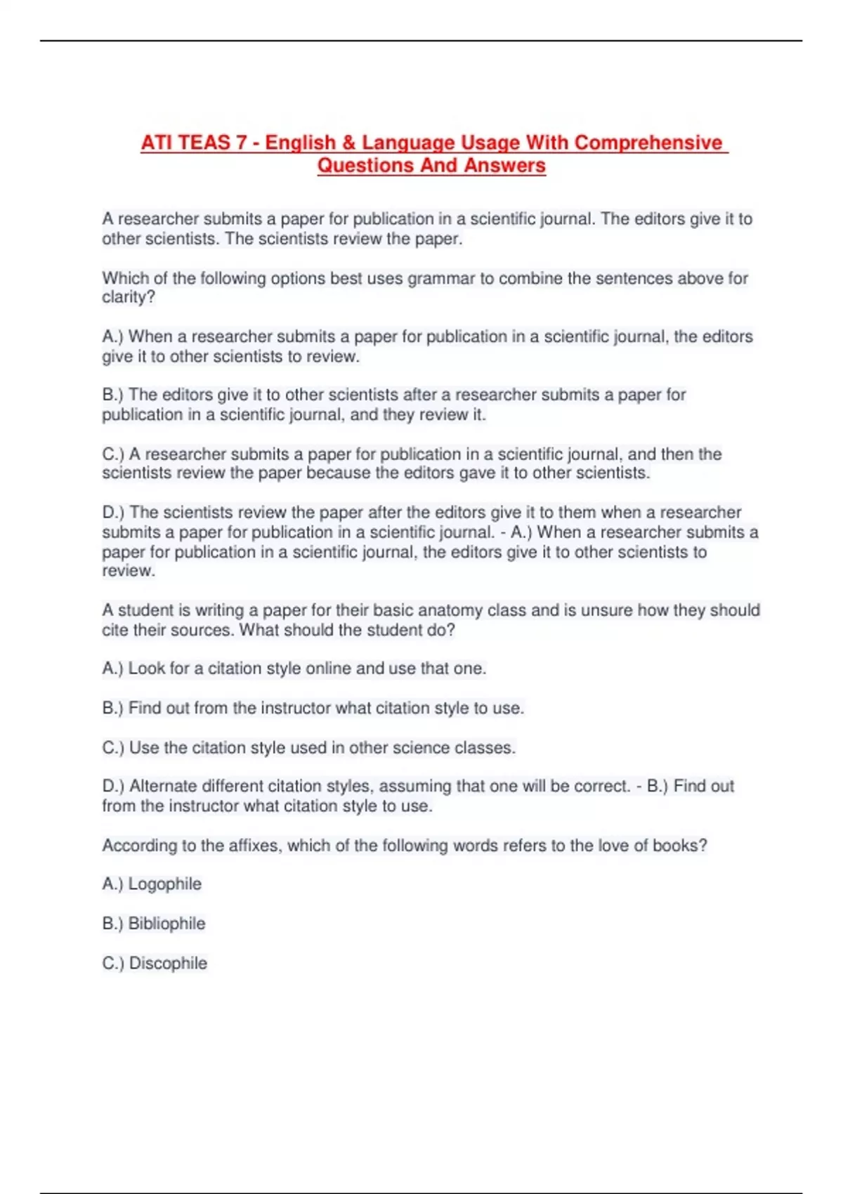 A researcher submits a paper for publication in a scientific journal. The editors give it to other scientists. The scientists review the paper. Which of the following options best uses grammar to combine the sentences above for clarity? A.) When a researcher submits a paper for publication in a scientific journal, the editors give it to other scientists to review. B.) The editors give it to other scientists after a researcher submits a paper for publication in a scientific journal, and they review it. C.) A researcher submits a paper for publication in a scientific journal, and then the scientists review the paper because the editors gave it to other scientists. D.) The scientists review the paper after the editors give it to them when a researcher submits a paper for publication in a scientific journal. - A.) When a researcher submits a paper for publication in a scientific journal, the editors give it to other scientists to review. A student is writing a paper for their basic anatomy class and is unsure how they should cite their sources. What should the student do? A.) Look for a citation style online and use that one. B.) Find out from the instructor what citation style to use. C.) Use the citation style used in other science classes. D.) Alternate different citation styles, assuming that one will be correct. - B.) Find out from the instructor what citation style to use. According to the affixes, which of the following words refers to the love of books? A.) Logophile B.) Bibliophile C.) Discophile D.) Audiophile - B.) Bibliophile After a long, exhausting hike, Stephanie went home, and fell asleep on the couch, which she had done many times before. Which comma should be removed in the sentence above? A.) The comma after the word "long" B.) The comma after the word "hike" C.) The comma after the word "home" D.) The comma after the word "couch" - C.) The comma after the word "home" Based on an examination of word parts, which of the following words means "abnormality of movement"? A.) Dyskinesia B.) Hyperkinesia C.) Akinesia D.) Hypokinesia - A.) Dyskinesia Based on an examination of word parts, which of the following words means "above the kidney"? A.) Interrenal B.) Subrenal C.) Intrarenal D.) Suprarenal - D.) Suprarenal Based on the analysis of word parts, what is the meaning of the word "bibliophile?" A.) A person who collects books B.) An index at the back of a book C.) A complied list of different books D.) A place where books are kept - A.) A person who collects books Based on the evidence found, electrical stimulation may be a potential therapy for OSAS, warranting further clinical trials. Which of the following is the likely medium for the sentence above? A.) Motivational speech B.) Business memo C.) Scientific journal article D.) Personal Blog - C.) Scientific journal article Based on the word parts, which of the following is a synonym for superlative? A.) Relevant B.) Surprising C.) Excellent D.) Unimportant - C.) Excellent Based on the word parts, which of the following is a synonym for superlative? A.) Relevant B.) Surprising C.) Excellent D.) Unimportant - C.) Excellent Eventually, he stopped hiding the fact that he did not know Spanish and admited that he had been deceiving them for months. Which of the following words is misspelled in the sentence above? A.) hiding B.) admited C.) deceiving D.) eventually - B.) admited Frida Kahlo, a Mexican printer known for her striking self- portraits, lived from 1907 to 1954. The Mexican Revolution began in 1910, when Frida Kahlo was three years old. After a serious accident, which left her in a body cast for three months, Kahlo began to paint. Of Kahlo's 55 self-portraits, many depict the pain she suffered after her accident. Which of the following sentences from the paragraph above does not belong in a wellorganized paragraph? A.) The Mexican Revolution began in 1910, when Frida Kahlo was three years old. B.) Frida Kahlo, a Mexican painter known for her striking self-portraits, lived from 1907 to 1954. C.) After a serious accident, which left her in a body cast for three months, Frida Kahlo began to paint. D.) Of Frida Kahlo's 55 self-portraits, many depict the pain she suffered after her accident. - A.) The Mexican Revolution began in 1910, when Frida Kahlo was three years old. He had to fill out a health history before seeing the doctor. A.) questionnaire B.) questionaire C.) questionnare D.) questionairre - A.) questionnaire His skill on the soccer field made him an member of the team. A.) indispensible B.) indespensable C.) indespensible D.) indispensable - D.) indispensable I truly believe that one cup of coffee a day is neither too much nor too little caffeine for me, but exactly the right amount. Which of the following words is misspelled in the sentence above? A.) caffiene B.) truly C.) neither S.) exactly - A.) caffiene If all of the following sentences appeared in the same paragraph, which sentence would be irrelevant? A.) I had been doing yoga at least three times a week for the past year. B.) At first, I walked and ran, though really it was more walking than running. C.) I had never run a 5k race before, but I decided to try and gave myself six weeks to train for it. D.) Each day I was able to run a bit further and a bit faster. - A.) I had been doing yoga at least three times a week for the past year. If an author were submitting a paper for publication in an academic journal, what would be the best way to cite the sources? A.) Try out a couple of citation styles and see which ones looks best. B.) Research the citation style of that particular journal and follow it. C.) Use any style the author likes as long as the author cites them. D.) Use the citation style the author has always used in their academic papers. - B.) Research the citation style of that particular journal and follow it. If you go to the market, please pick up some beef, carrots, and celery, and I will make some of that delicious, stew we had last week.