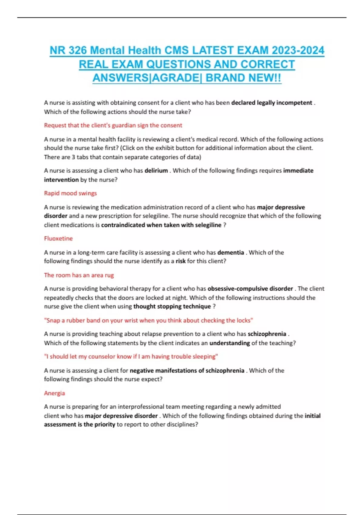 LATEST NR 326 Mental Health CMS REAL EXAM QUESTIONS AND CORRECT ANSWERS|AGRADE|