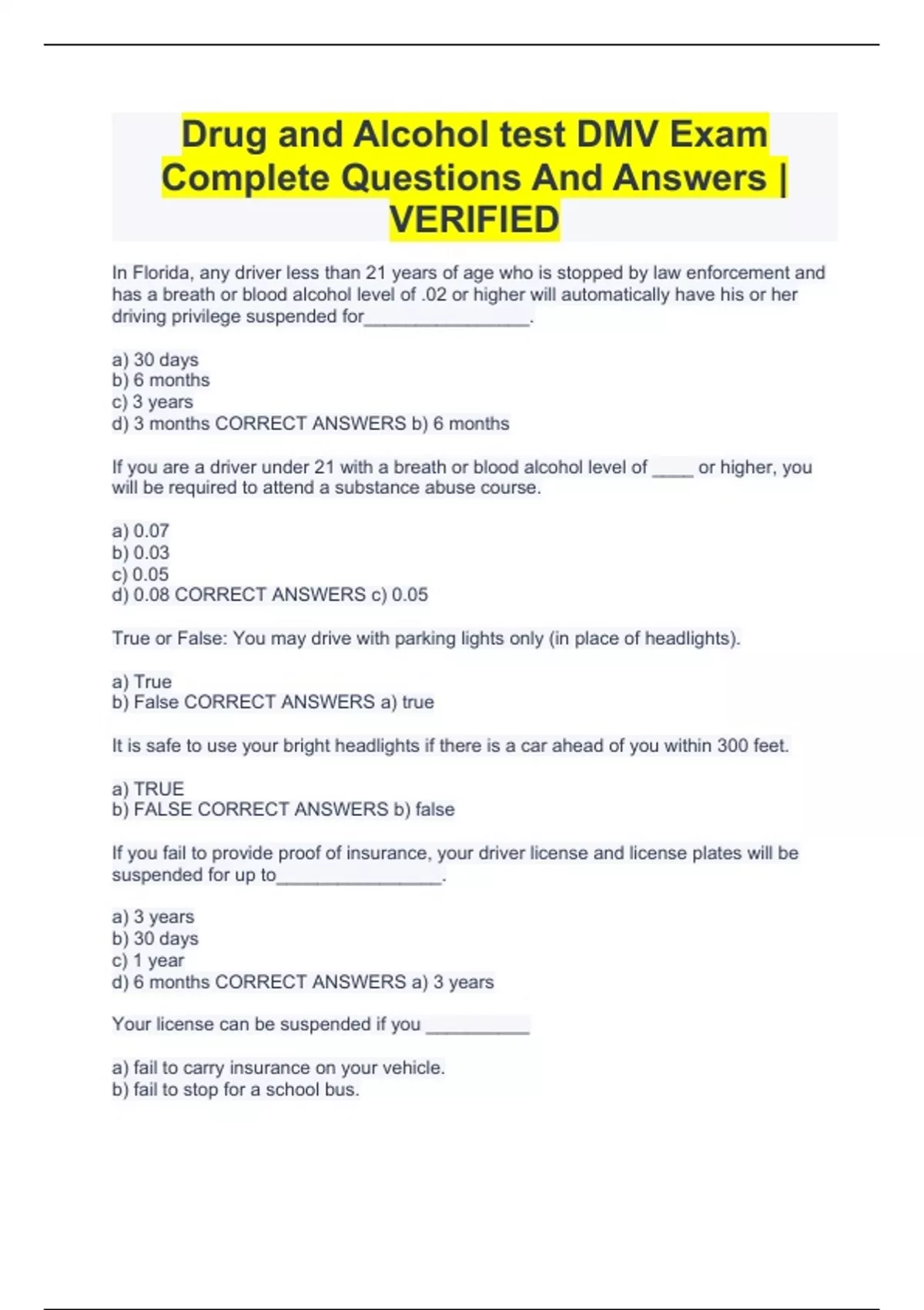 Drug and Alcohol test DMV Exam Complete Questions And Answers